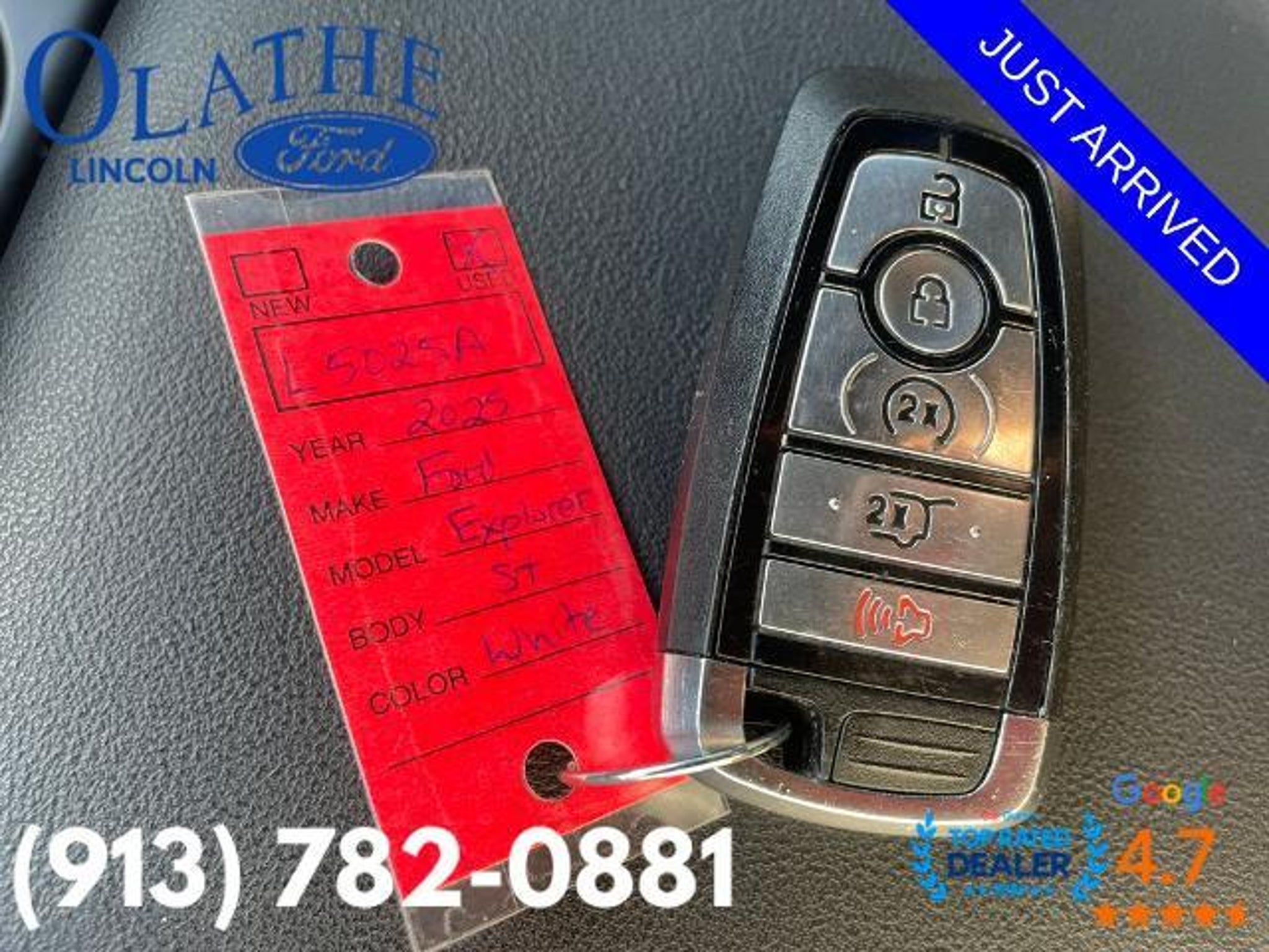 2025 Ford Explorer ST Star White Metallic Tri-Coat 4WD Equipment Group 400A Standard Package, 10 Speakers, 3.58 Non-Limited Slip Rear Axle, 3rd row seats: bench, 4-Wheel Disc Brakes, ABS brakes, Air Conditioning, Alloy wheels, AM/FM radio: SiriusXM with 360L, Apple CarPlay/Android Auto, Auto High-beam Headlights, Auto-dimming door mirrors, Auto-dimming Rear-View mirror, Automatic temperature control, Brake assist, Bumpers: body-color, Compass, Delay-off headlights, Driver door bin, Driver vanity mirror, Dual front impact airbags, Dual front side impact airbags, Electronic Stability Control, Emergency communication system: 911 Assist, Exterior Parking Camera Rear, Four wheel independent suspension, Front & 2nd Rows Floor Liners w/Carpet Floor Mats, Front anti-roll bar, Front Bucket Seats, Front Center Armrest, Front dual zone A/C, Front fog lights, Front License Plate Bracket, Front reading lights, Fully automatic headlights, Garage door transmitter, Heated door mirrors, Heated front seats, Heated rear seats, Heated steering wheel, Heated/Ventilated Miko Sport Captain's Chairs, Illuminated entry, Internet access capable: FordPass Connect 5G, Knee airbag, Leather steering wheel, Low tire pressure warning, Memory seat, Navigation System, Occupant sensing airbag, Outside temperature display, Overhead airbag, Overhead console, Panic alarm, Passenger door bin, Passenger vanity mirror, Power door mirrors, Power driver seat, Power Liftgate, Power passenger seat, Power steering, Power windows, Radio: B&O Sound System by Bang & Olufsen, Rain sensing wipers, Rear air conditioning, Rear anti-roll bar, Rear reading lights, Rear window defroster, Rear window wiper, Remote keyless entry, Security system, Speed control, Speed-sensing steering, Speed-Sensitive Wipers, Split folding rear seat, Spoiler, Sport steering wheel, Steering wheel mounted audio controls, Tachometer, Telescoping steering wheel, Tilt steering wheel, Traction control, Trip computer, Turn signal indicator mirrors, Variably intermittent wipers, Ventilated front seats, Wheels: 21 Magnetite-Painted Aluminum, Equipment Group 400A Standard Package. With Market Value Pricing you'll find our competitive market-based price on every new vehicle upfront. No games. No hassles. Just real prices! ..... Call our Internet Specialists to schedule a test drive! (913) 782-0881. Olathe Ford Lincoln is Home to the World's Happiest Customers! Stickers prepared by Dealer Specialties, at the request of the Dealer solely for his and its conveniences and this Dealership make n