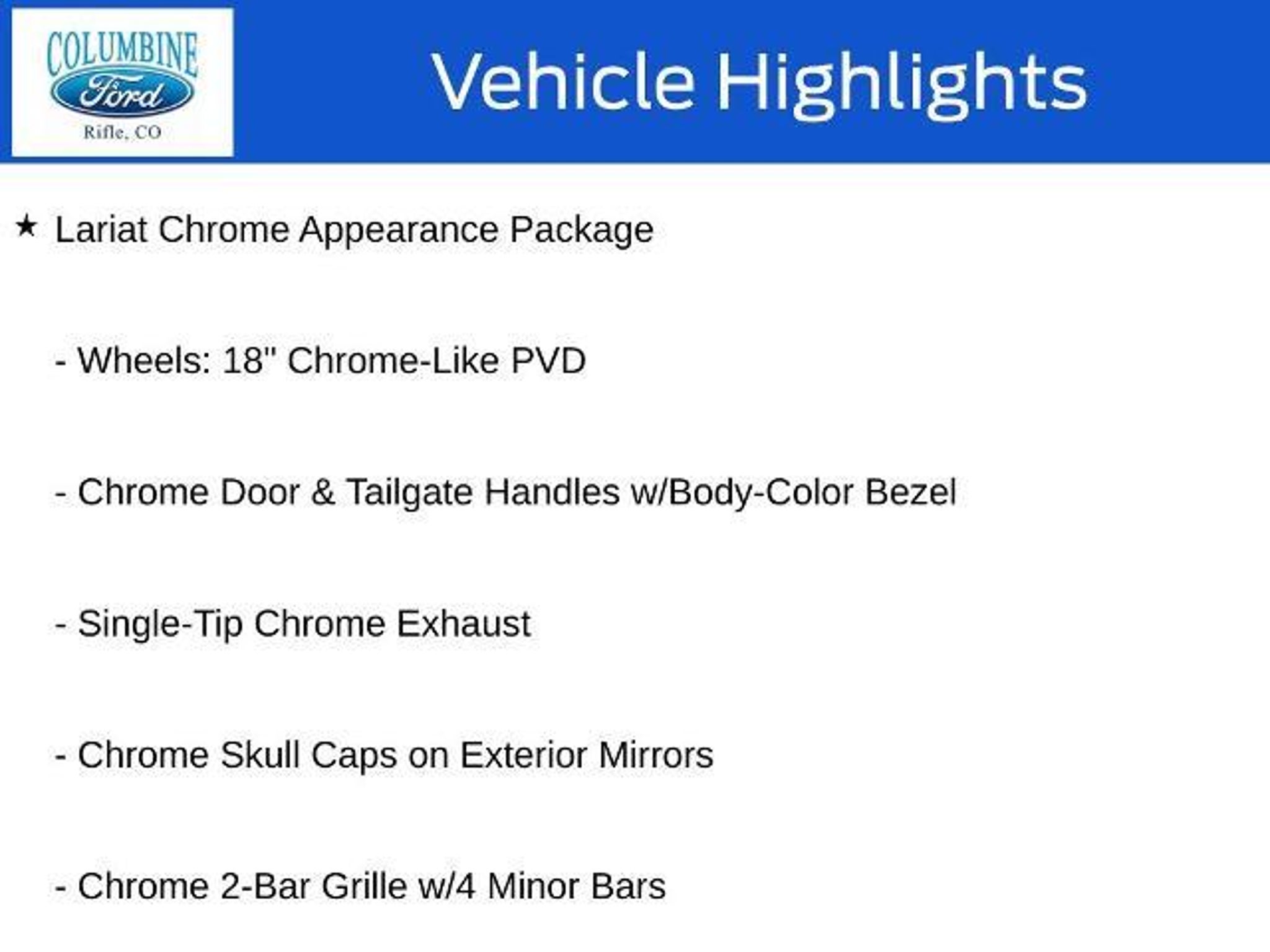 Elevate your driving experience with this exceptional 2019 Ford F-150 Lariat. Boasting a powerful 5.0L V8 engine, 4-wheel drive, and a striking black exterior, this truck is designed to conquer any terrain with confidence and style. Highlighted features include: - Radio: B&O Sound System by Bang & Olufsen - Universal Garage Door Opener - Power Tilt/Telescoping Steering Column w/Memory - Upgraded Front Stabilizer Bar - Body-Color Front & Rear Bumpers - Remote Start System w/Remote Tailgate Release - BLIS Blind Spot Information System - Active Park Assist - Engine Oil Cooler - 2-Bar Body-Color Grille w/4 Minor Bars - Accent-Color Angular Step Bars - Box Side Decals - LED Sideview Mirror Spotlights - Power Glass Sideview Mirr w/Chrome Skull Caps - Quad Beam LED Headlamps & LED Taillamps/Fog Lamps Slip behind the wheel of this Lariat and experience the ultimate in luxury and capability. The leather-trimmed bucket seats provide exceptional comfort, while the 10-way power driver and passenger seats with memory ensure a personalized fit. The voice-activated touchscreen navigation system and 360-degree camera with dynamic hitch assist make every drive a breeze. Towing and hauling are a breeze with the Trailer Tow Package, which includes a Class IV trailer hitch receiver, Pro Trailer Backup Assist, and an upgraded front stabilizer bar. The extended-range 36-gallon fuel tank means you can go farther between fill-ups, while the electronic locking differential with 3.73 axle ratio delivers exceptional off-road capability. Experience the ultimate in power, comfort, and technology with this 2019 Ford F-150 Lariat. Visit Columbine Ford today and let our team show you why this truck is the perfect fit for your lifestyle. At Columbine Ford, we're proud to be Western Colorado's most trusted dealership and a multi-year recipient of Ford's prestigious President's Award for exceptional customer satisfaction. Our team is committed to honesty, transparency, and delivering a hassle-free buying experience on every visit. Whether you're shopping new or pre-owned, you'll find unbeatable service, western Colorado's largest selection of vehicles, competitive pricing, and a dealership that truly cares. Visit us at 2828 Railroad Ave., Rifle, CO 81650 or call 970-625-1680. Experience the award-winning difference at Columbine Ford?where Colorado comes to drive.