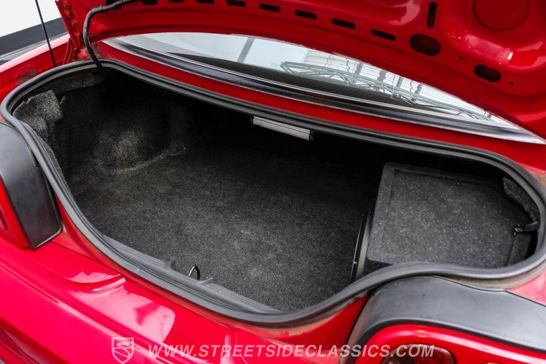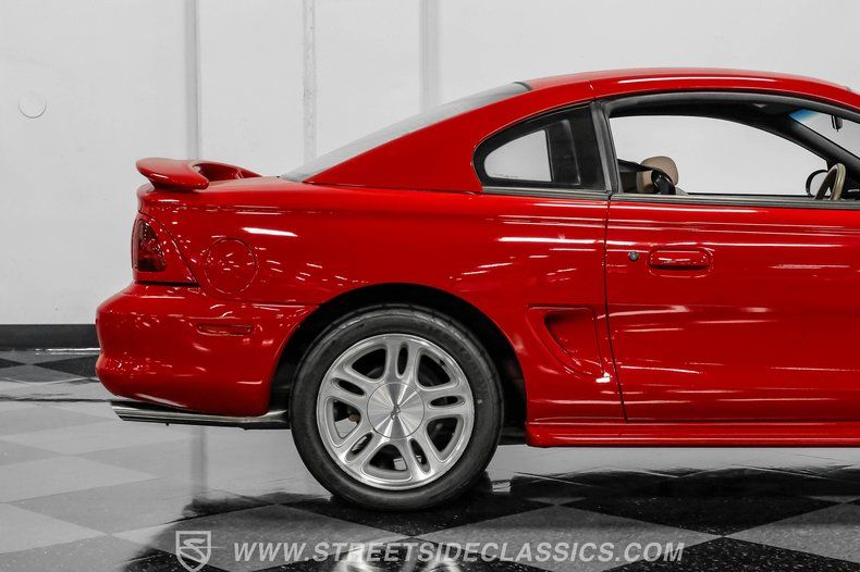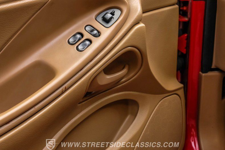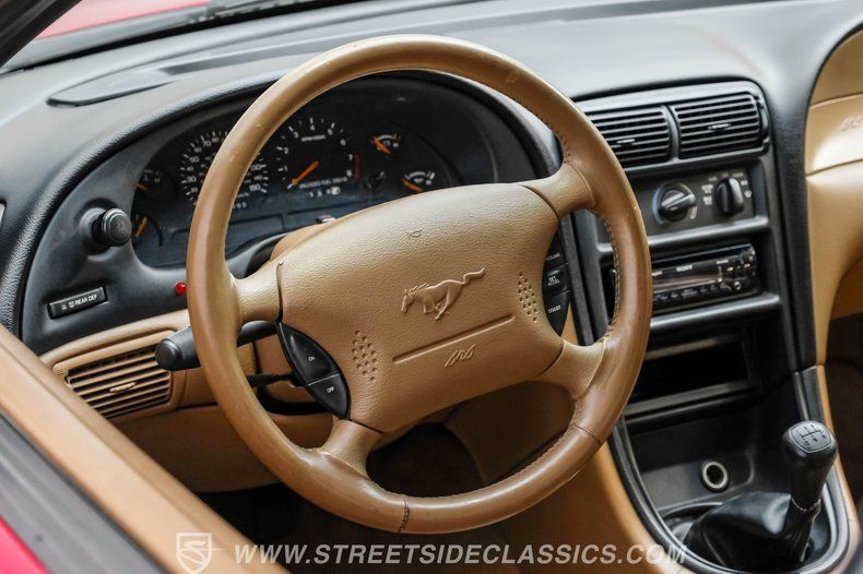 This 1998 Ford Mustang GT in Rio Red is a showstopper. Its bold color, makes this Mustang stand out from the crowd. The 17-inch wheels wrapped in 245/45R17 tires not only enhance its appearance but also promise a gripping drive. The aggressive stance and sleek lines of this coupe hint at the power beneath its stylish exterior. The paint is in great shape, accentuating the Mustang's timeless design.