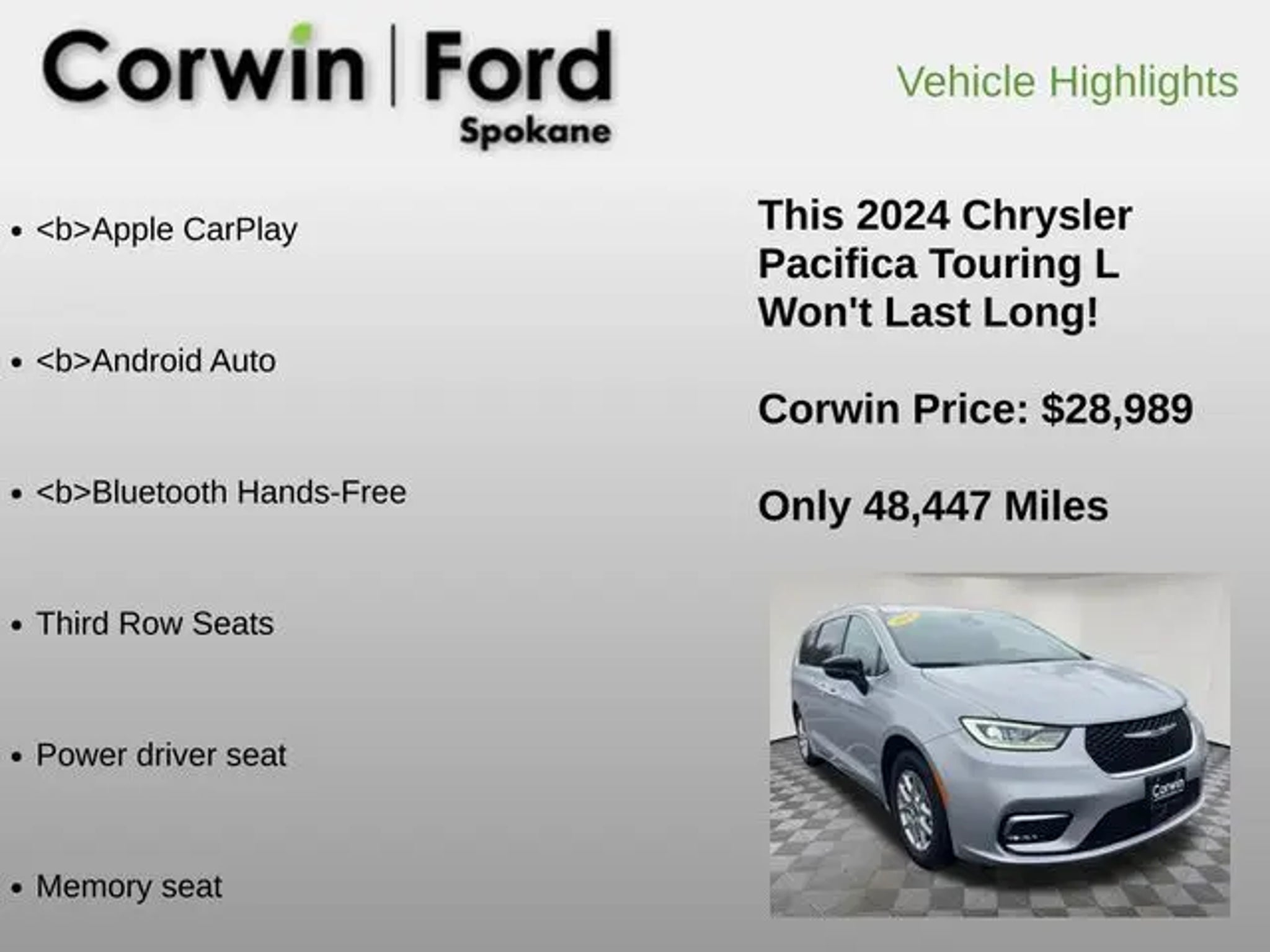 Discover the exceptional 2024 Chrysler Pacifica Touring L, a versatile and well-equipped family vehicle that offers the perfect blend of style, comfort, and advanced technology. With its sleek Silver Mist Clearcoat exterior and a host of premium features, this Pacifica is poised to exceed your expectations. Key highlights of this remarkable Pacifica include: "¢ Collision Avoidance System "¢ Adaptive Cruise Control "¢ Heated Seats "¢ Blind-Spot Monitors "¢ Lane Keeping Assist "¢ Touchscreen Controls "¢ Backup Camera "¢ Automatic Headlights "¢ Apple CarPlay "¢ Android Auto "¢ Bluetooth Hands-Free "¢ Third Row Seats Powered by a robust 3.6L V6 24V VVT engine and paired with a smooth-shifting 9-Speed 948TE Automatic transmission, this Pacifica delivers an exceptional blend of performance and efficiency, with an impressive EPA-estimated 19 MPG in the city and 28 MPG on the highway. Step inside and you'll be greeted by a spacious and well-appointed interior, featuring premium Caprice Leatherette Bucket Seats, a heated steering wheel, and a large 10.1 Touchscreen Display with seamless integration for your Apple CarPlay and Google Android Auto needs. The Memory Seat and Power Driver Seat ensure you can find the perfect driving position with ease. Versatility is at the heart of the Pacifica, with its split-folding third-row seats and ample cargo space, making it the ideal companion for your family's adventures. Whether you're taking the kids to soccer practice, embarking on a road trip, or simply running errands around town, this Pacifica Touring L is up to the task. With a list price of $24,795, this 2024 Chrysler Pacifica Touring L represents exceptional value in the minivan segment. Experience the difference for yourself and schedule a test drive today. We're confident you'll be impressed by the Pacifica's blend of style, technology, and family-focused functionality.