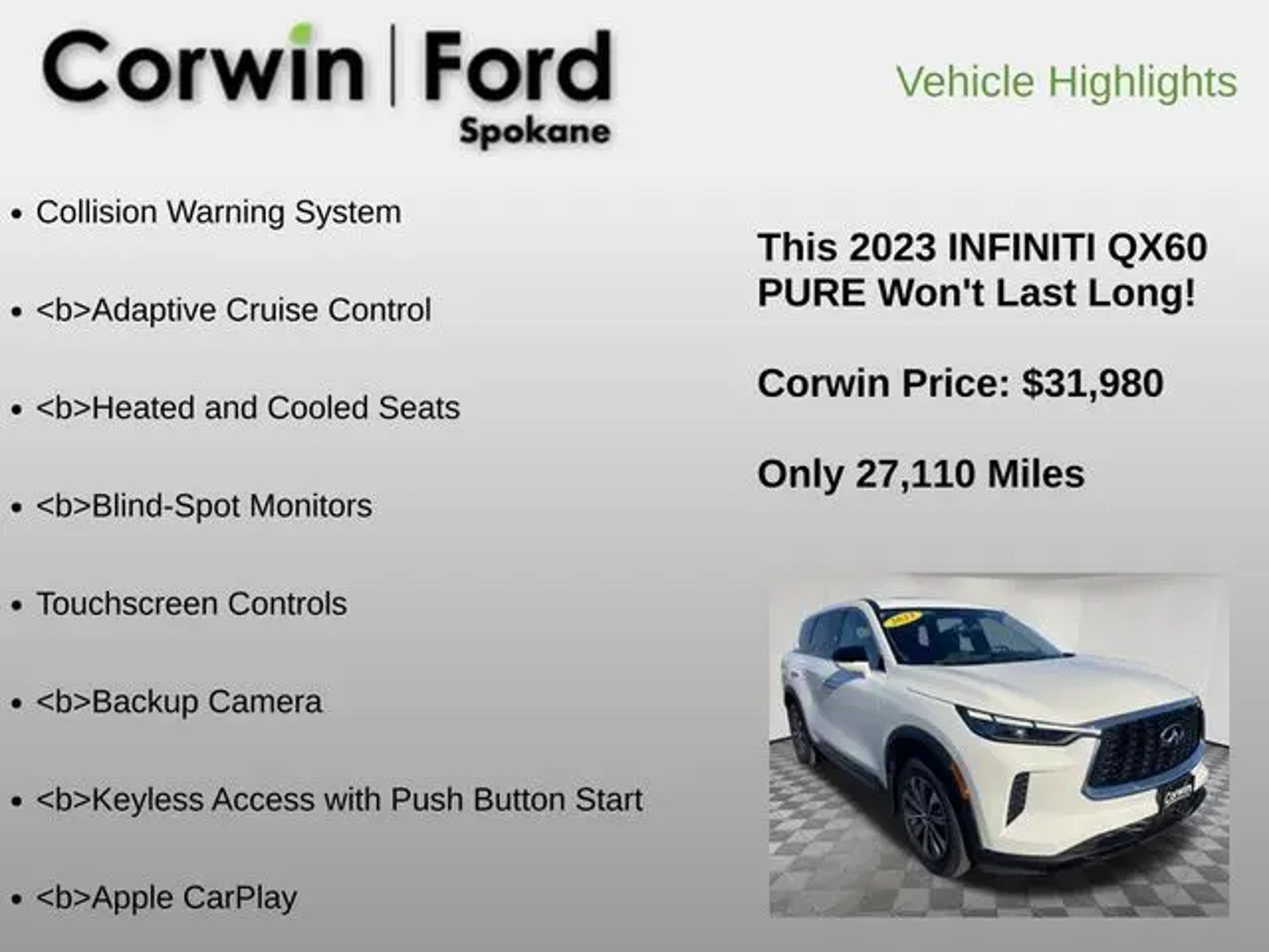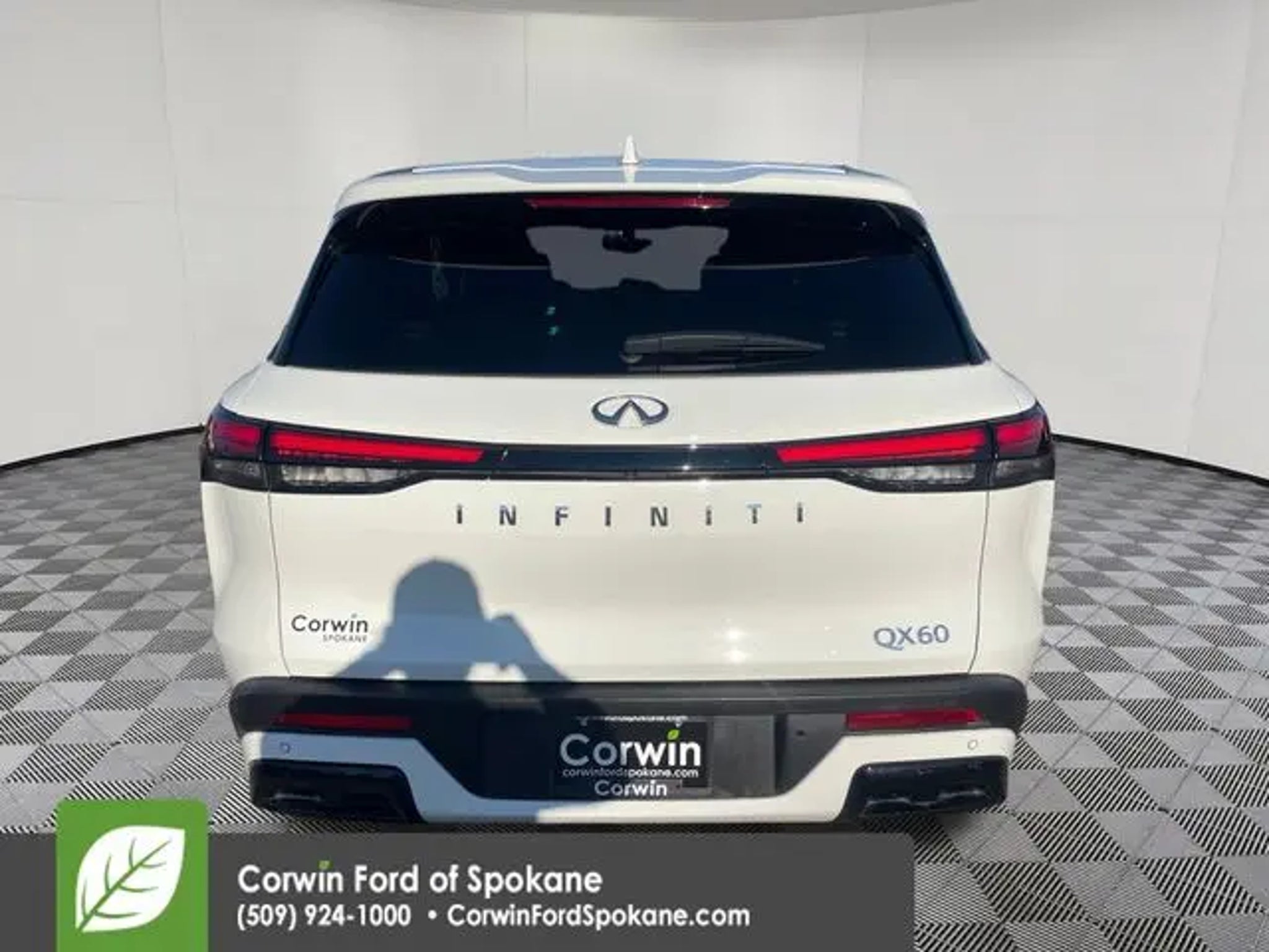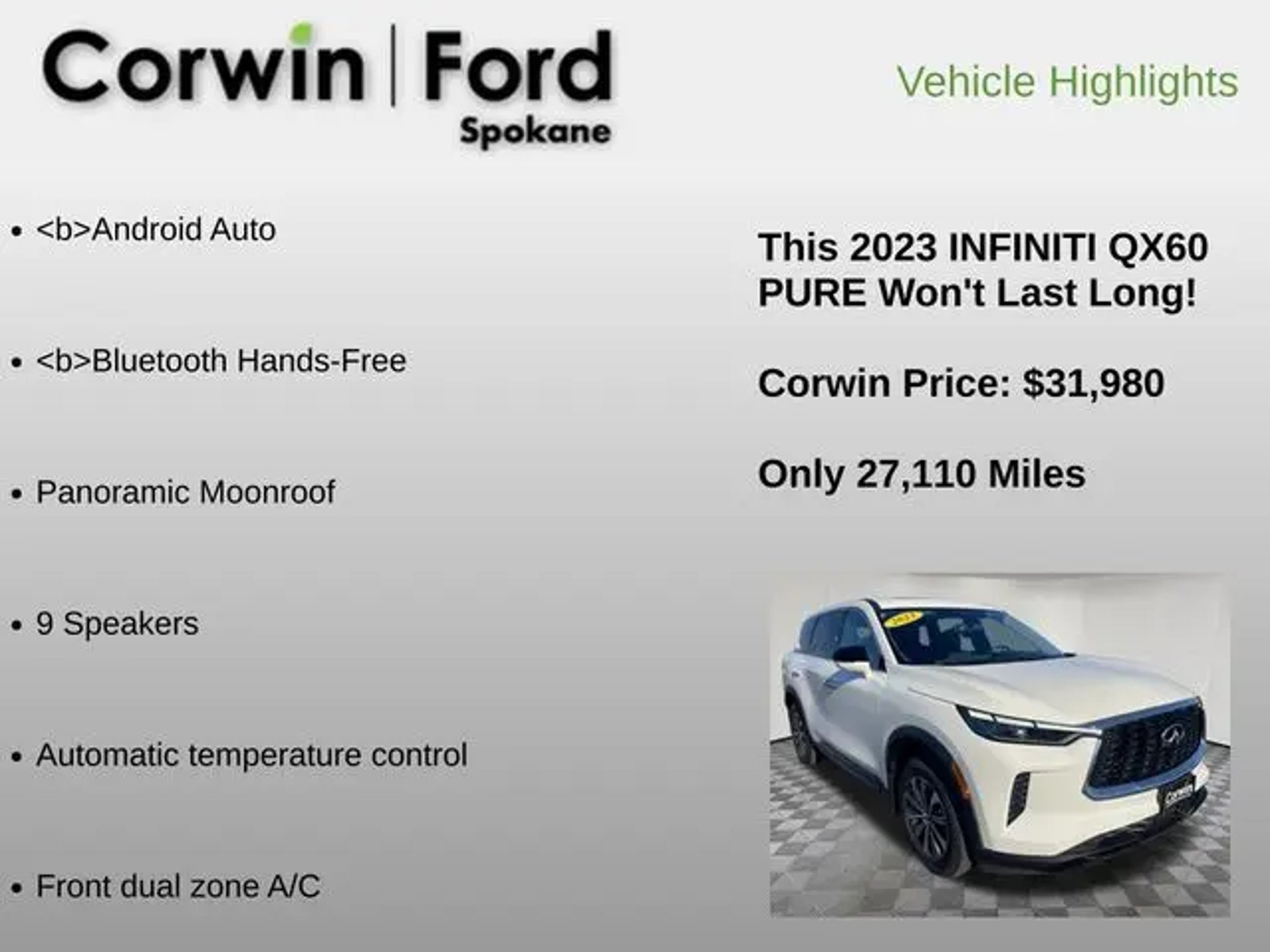 Recent Arrival! Our One Owner, No Accidents Reported 2023 INFINITI QX60 PURE is a premium SUV that can put you at ease in Glacier White! Powered by a 3.5 Liter V6 that offers 295hp paired with a paddle-shifted CVT that puts capability at your fingertips. This Front Wheel Drive SUV also rewards you with well-controlled handling and scores nearly 26mpg on the highway with an exciting exterior design. Style-friendly QX60 details include LED lighting, a panoramic sunroof, gloss-black undercovers, a power liftgate, and premium alloy wheels. Precisely crafted, our PURE cabin pampers you and your passengers with heated leather power front seats, multimode second- and folding third rows, a heated leather steering wheel, tri-zone automatic climate control, cruise control, keyless access, pushbutton ignition, and a 7-inch driver display. Additional tech benefits bring the digital convenience of a 12.3-inch touchscreen, voice recognition, wireless charging, WiFi compatibility, Android Auto®, wireless Apple CarPlay®, Bluetooth®, and a nine-speaker sound system. Our QX60 delivers impressive utility, too! Safer journeys await with intelligent INFINITI features such as a rearview camera, front/rear automatic braking, blind-spot warning, forward collision warning, lane-departure alert, and more. It's time to move to our QX60 PURE and make a bold statement about your driving! Save this Page and Call for Availability. We Know You Will Enjoy Your Corwin Ford Spokane Test Drive Towards Ownership! See us today at Corwin Ford Spokane. Family owned for over 100 years! Excellent selection of New and Used vehicles, Financing options. Serving Spokane, Pasco, Kennewick, Richland, Walla Walla, Hermiston, Umatilla, Yakima, Sunnyside, Grandview, Dayton, Prescott, Denton County, Franklin County, Yakima County, Spokane County, Adams County, Grant County, and the Greater Columbia Basin. *All Prices plus applicable sales tax, license, and a negotiable documentary service fee up to $200 may be added to sales price or capitalized cost of the vehicle. One vehicle unless otherwise noted and subject to prior sale without notice. While supplies last. EPA mileage estimates are for newly manufactured vehicles only. Your actual mileage will vary depending on how you drive and maintain your vehicle.