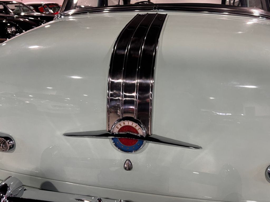 1954 Pontiac Chieftain • Ultra high-end restoration • 239 inline 6-cylinger engine • 3-speed manual transmission • Sun visor • Fender skirts • Illuminated Indian hood mascot • Pushbutton radio • Traffic light viewer • New Coker Whitewall radial tires • Full size wheel covers • Turnkey condition (excluding radio)
