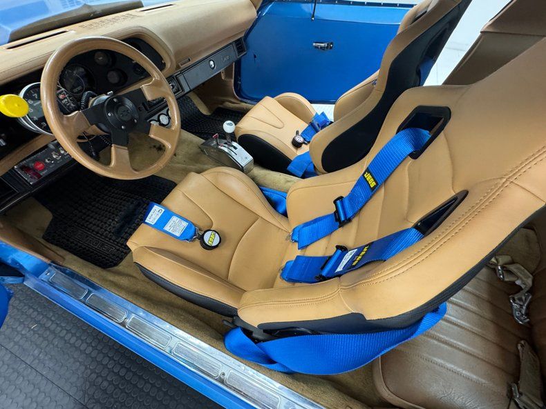 Carbon fiber patterned plastic door panels keep things light on the inside and we turn to the cabin that is nicely appointed and attractive with tan vinyl racing seats and bright blue racing harnesses. The rear 2+2 remain in stock configuration and are clean while up front, a tan rimmed steering wheel shares the column with a AutoMeter tachometer and shift light ahead of the stock looking instrument cluster. A racing toggle panel is to the left and an AM/FM/CD player to the right along with an added triple gauge pod. Perched on the transmission tunnel is a B&M shifter over tan carpet that shows some staining front and rear. Meanwhile, the perforated tan headliner looks like it's fresh from '78.