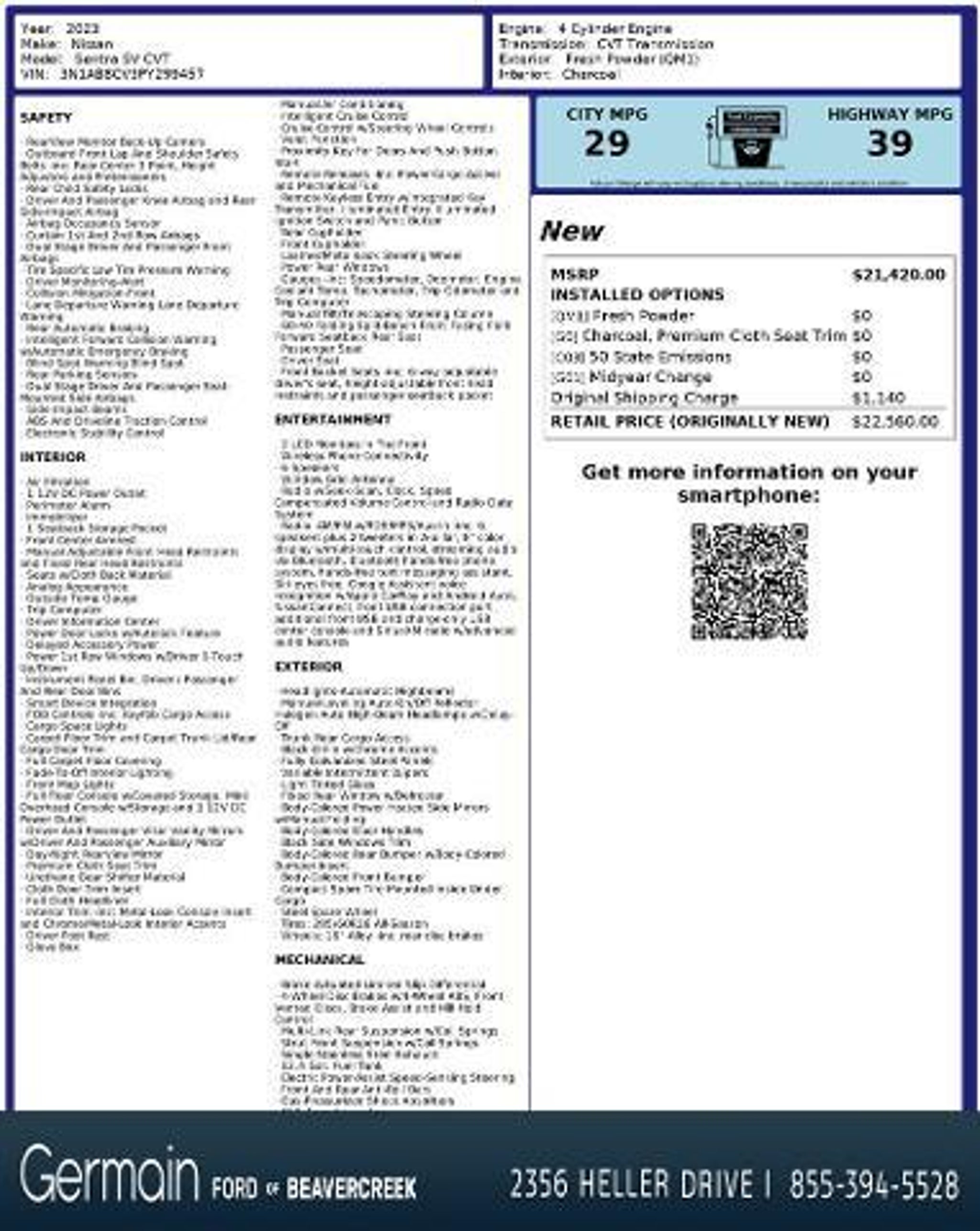 Details > 2023 Nissan Sentra SV 4DR Sedan For Sale in Dayton, OH Private Party Sellers Click here to place your ad now! You auta tell them you saw the ad in AutaBuy when you call or email. 1/29 2/29 3/29 4/29 5/29 6/29 7/29 8/29 9/29 10/29 11/29 12/29 13/29 14/29 15/29 16/29 17/29 18/29 19/29 20/29 21/29 22/29 23/29 24/29 25/29 26/29 27/29 28/29 29/29 View 29 Photos View All Add to My Garage Parked in Your Garage! Germain Ford of Beavercreek Contact Seller: I would like to: Make Offer Check Availability Ask A Question Request More Photos Check Financing Options Send a copy of this message to me Add this listing to my garage Send to Mobile Mileage 53,086 Exterior Color Fresh Powder Interior Color Charcoal Doors 4 Engine 2.0L I4 Stock # P8197 VIN 3N1AB8CV3PY299457 Estimated Monthly Payment $308 mo Apply Now J.J. Best Banc & Co. 2023 Nissan Sentra SV 4DR Sedan Description: CVT with Xtronic, Charcoal Cloth. CARFAX One-Owner. Odometer is 7672 miles below market average! 29/39 City/Highway MPG The Right car, The Right price, The Right way. https://www.kbb.com/kbbreport/d7sc3 · Mileage: 53,086 · Color: Fresh Powder Price: $17,877. Price: $17,683. Mileage 53,086 Exterior Color Fresh Powder Interior Color Charcoal Doors 4 Engine 2.0L I4 Stock # P8197 VIN 3N1AB8CV3PY299457 Estimated Monthly Payment $308 mo Apply Now J.J. Best Banc & Co. Add to My Garage Parked in Your Garage! Message Seller Germain Ford of Beavercreek Contact Seller: I would like to: Make Offer Check Availability Ask A Question Request More Photos Check Financing Options Send a copy of this message to me Add this listing to my garage Offered for sale by Germain Ford of Beavercreek DAYTON, OH Price: $17,877. Price: $17,683. Offered for sale by Germain Ford of Beavercreek DAYTON, OH [entire inventory] Ask Auta Intelligence What factory options were available on this model? What does this VIN number tell me? When was this model first introduced? What engine options did these come with? How many of these were produced? Tell me the history on this model Can you show me more cars for a similar price? What kind of mileage do these get? How far is this from me? What trim levels were available for this model? What transmission options did these offer? What colors did these come in? How easy are parts to find for this model? Do you have a similar car to sell? List It Now! Questions about this car? Ask Auta Intelligence for production numbers, available options, etc. · Subscribe to AutaBuy! · Send a Gift Subscription Notice to a Friend