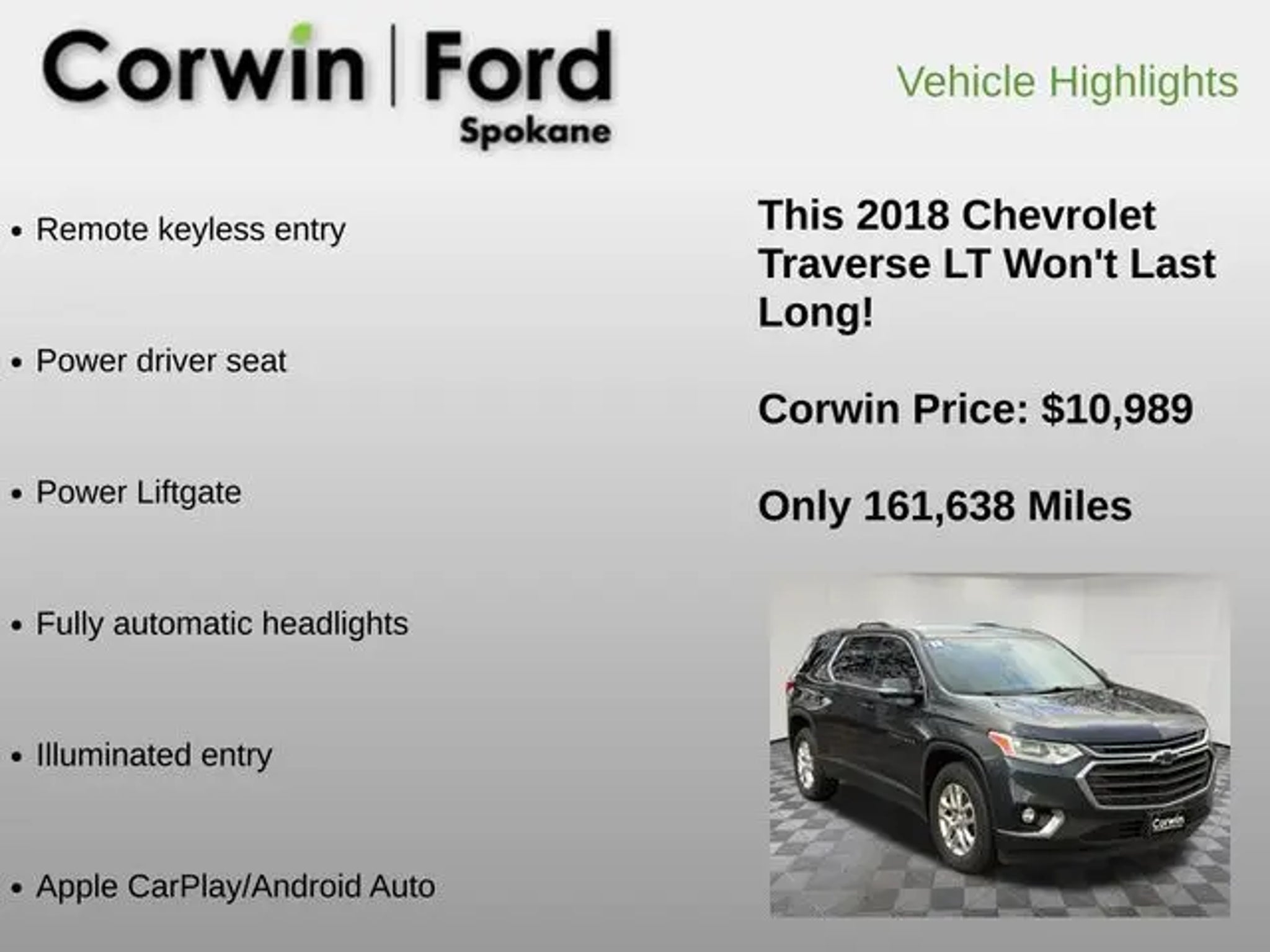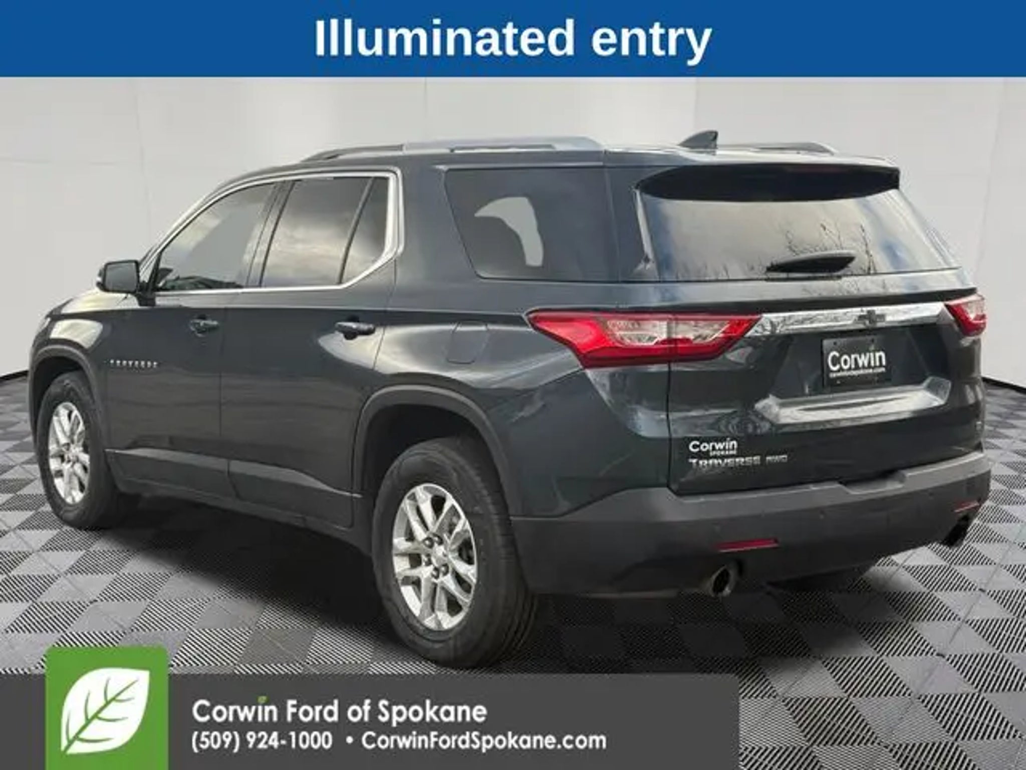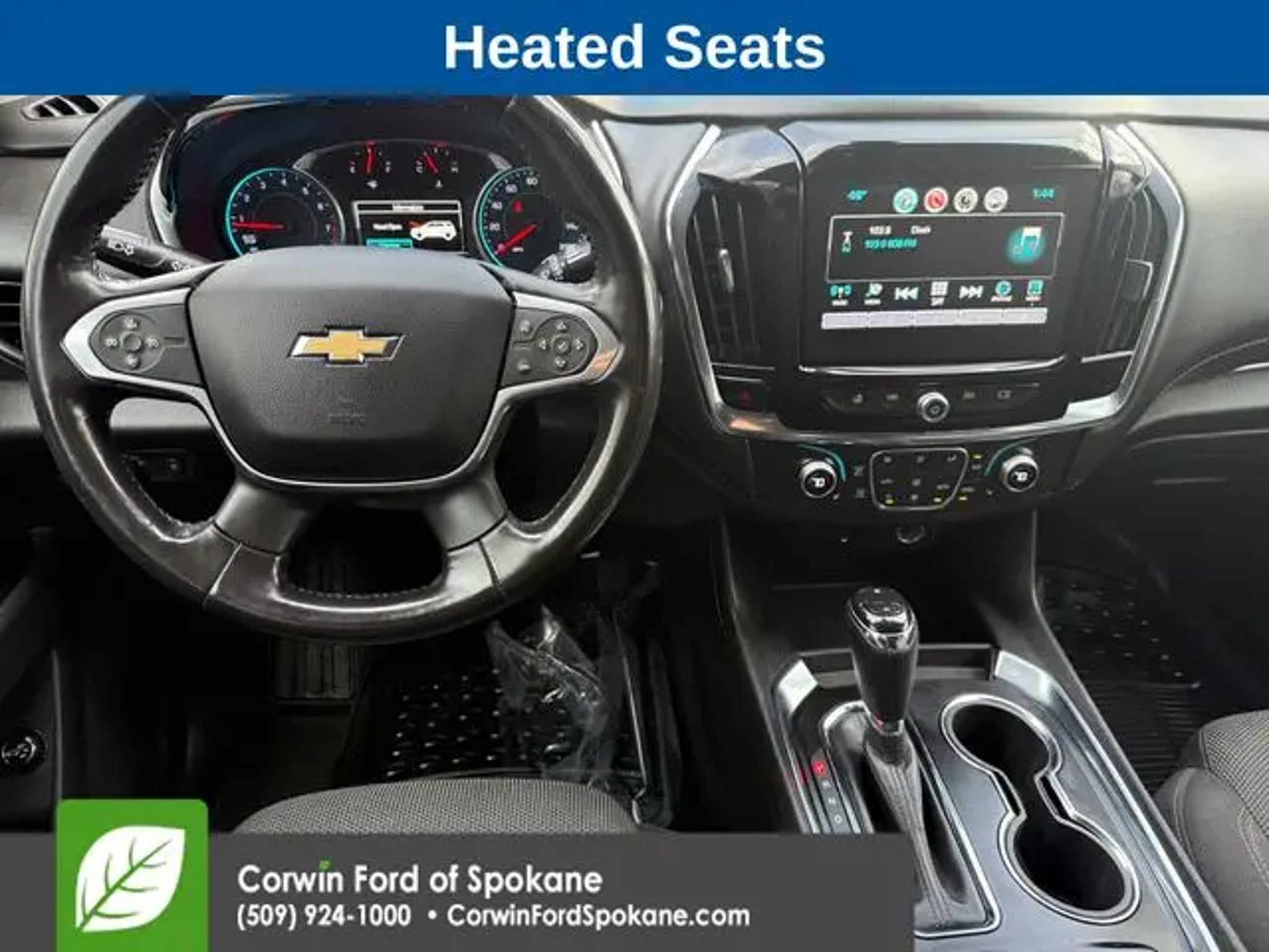 Recent Arrival! Our One Owner, No Accidents Reported 2018 Chevrolet Traverse LT AWD offered in amazing Graphite Metallic is ready for duty! Powered by a 3.6 Liter V6 that delivers 310hp connected to a 9 Speed Automatic transmission for easy passing and towing. Whether taking the kids to school, commuting to work, or towing that toy on the weekends, our All Wheel Drive SUV is at your service, offering nearly 27mpg on the highway. As you approach our terrific Traverse, you will immediately notice the athletic design, LED lighting, HID headlamps, fog lamps, heated power mirrors, and fantastic alloy wheels. Once inside the LT cabin, you will be rewarded with comfortable heated front seats, a leather-wrapped steering wheel, cruise control, tri-zone automatic climate control, and the technology you need to master your busy day. It all starts with a color touchscreen, Android Auto®, Apple CarPlay®, Bluetooth®, and WiFi compatibility for on-the-go connectivity whenever you need it most! Safety for you and your passengers is imperative, so Chevrolet helps you avoid challenging driving situations with a backup camera, tire-pressure monitoring, stability/traction control, and many smart airbags. Our Traverse LT has style, space, and technology to spare! Save this Page and Call for Availability. We Know You Will Enjoy Your Corwin Ford Spokane Test Drive Towards Ownership! See us today at Corwin Ford Spokane. Family owned for over 100 years! Excellent selection of New and Used vehicles, Financing options. Serving Spokane, Pasco, Kennewick, Richland, Walla Walla, Hermiston, Umatilla, Yakima, Sunnyside, Grandview, Dayton, Prescott, Denton County, Franklin County, Yakima County, Spokane County, Adams County, Grant County, and the Greater Columbia Basin. *All Prices plus applicable sales tax, license, and a negotiable documentary service fee up to $200 may be added to sales price or capitalized cost of the vehicle. One vehicle unless otherwise noted and subject to prior sale without notice. While supplies last. EPA mileage estimates are for newly manufactured vehicles only. Your actual mileage will vary depending on how you drive and maintain your vehicle.