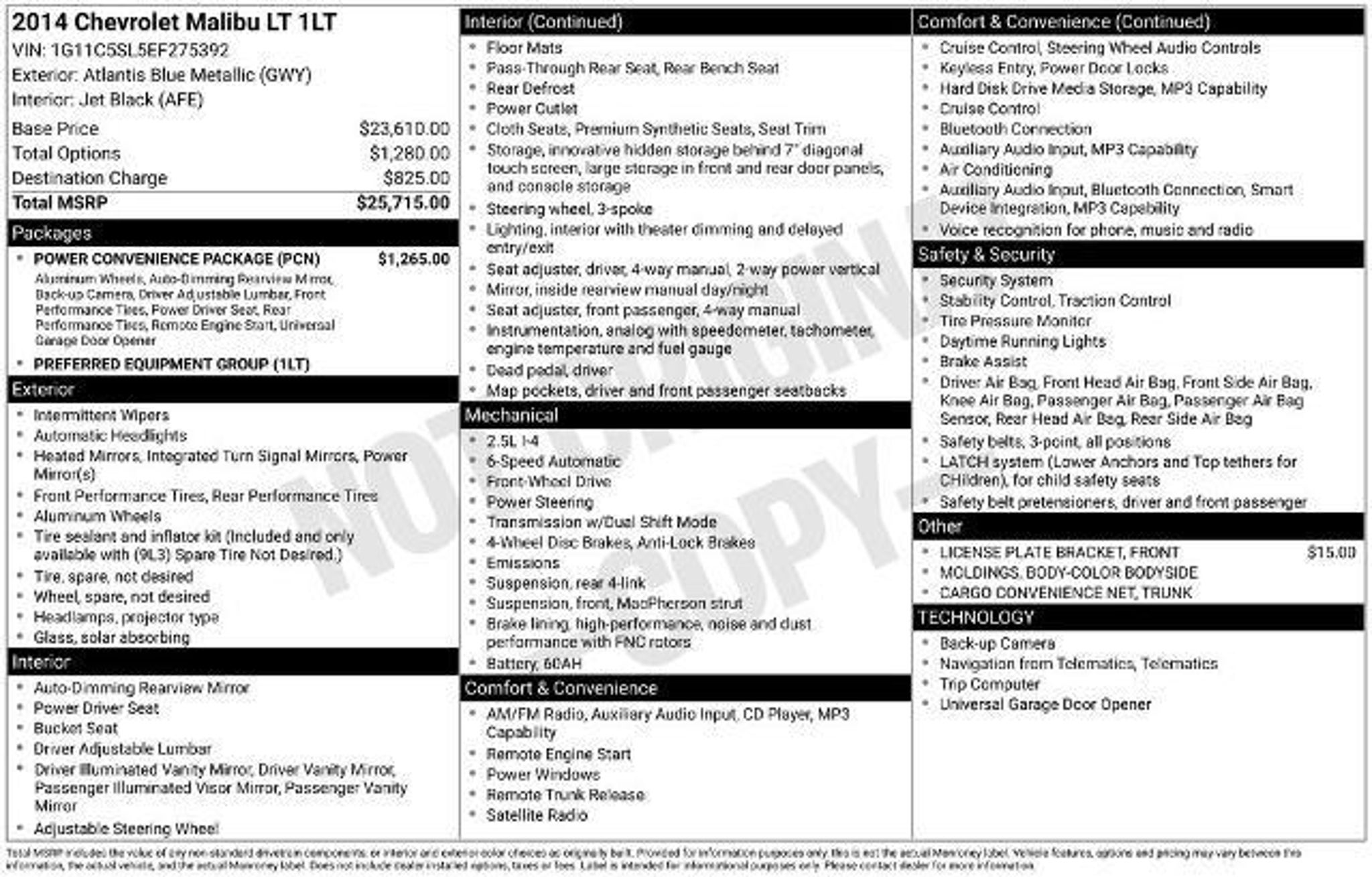2014 Atlantis Blue Metallic Chevrolet Malibu LT 1LT FWD 6-Speed Automatic Electronic with Overdrive ECOTEC 2.5L I4 DGI DOHC VVT This Chevrolet Malibu has many features and is well equipped including, Remote Start, Backup Camera, Jet Black Cloth, 17 5-Spoke Aluminum Wheels, Body-Color Bodyside Moldings, Driver 8-Way Power Seat Adjuster, Driver Power Lumbar Seat Adjuster, Electronic Stability Control, Inside Rear-View Auto-Dimming Mirror, Power Convenience Package, Preferred Equipment Group 1LT, Rear Vision Camera, Remote Vehicle Starter System, Trunk Cargo Convenience Net, Universal Home Remote. As a full service dealership, Dahl Automotive provides a wide-range of vehicles for sale, including an inventory of vehicles through our Mechanic Special program. These vehicles meet all of the safety and legal standards required by the State of Wisconsin. We may have noted some suggested repairs that do not affect the vehicleâs safety; we want you to know exactly what you are purchasing. This vehicle is sold on an âAs-Isâ basis. This means that there is no warranty and âwhat you see is what you get.â You, the buyer, assume 100% risk and responsibility for any repair costs after purchasing a Mechanic Special vehicle. Dahl Automotive has no objection, if before purchasing, you want a second opinion as to the vehicleâs condition. To ensure that your recently purchased terrific-looking 2014 Chevrolet Malibu remains in tip-top condition, we include the first scheduled maintenance appointment with every vehicle purchased.