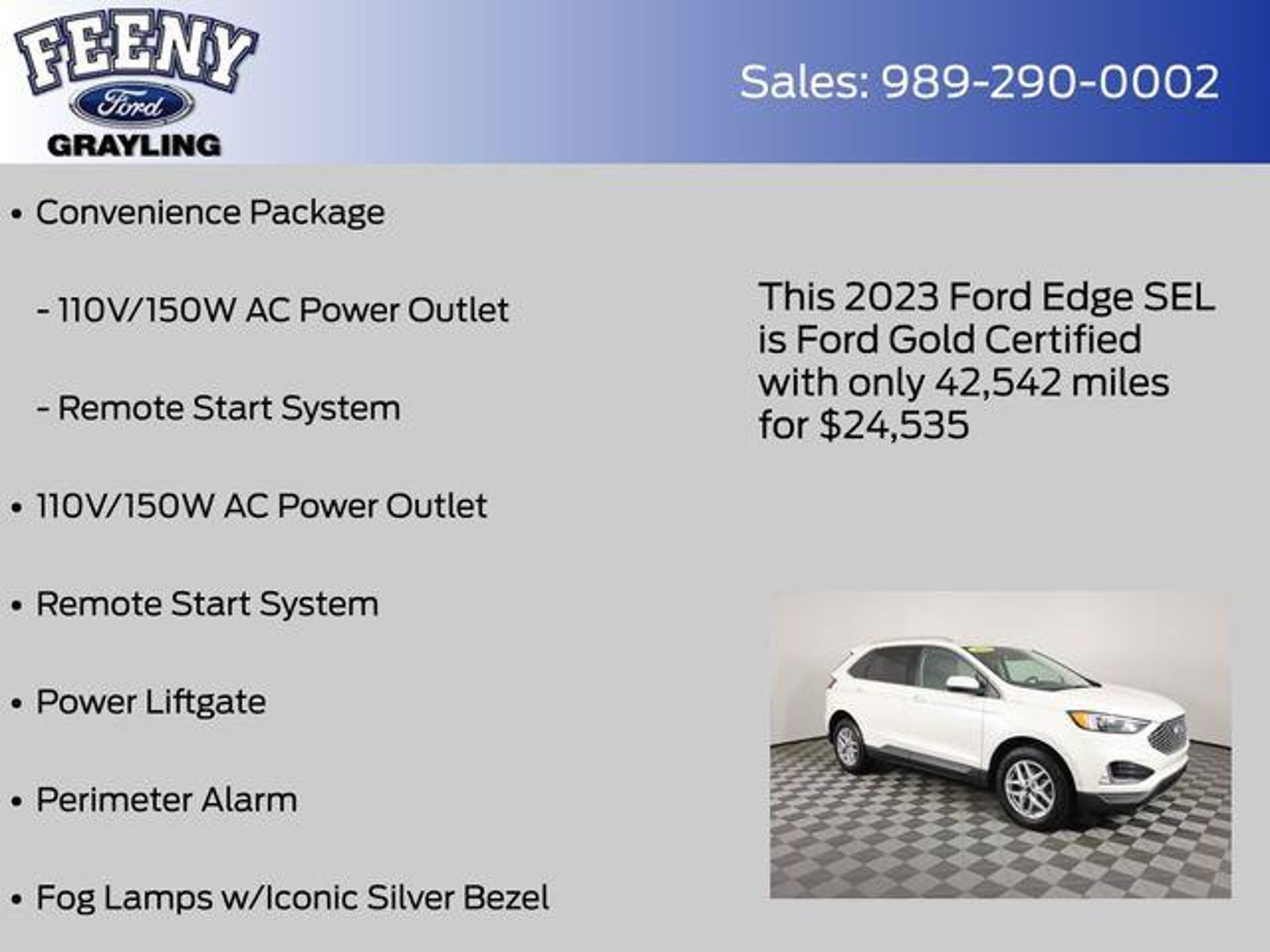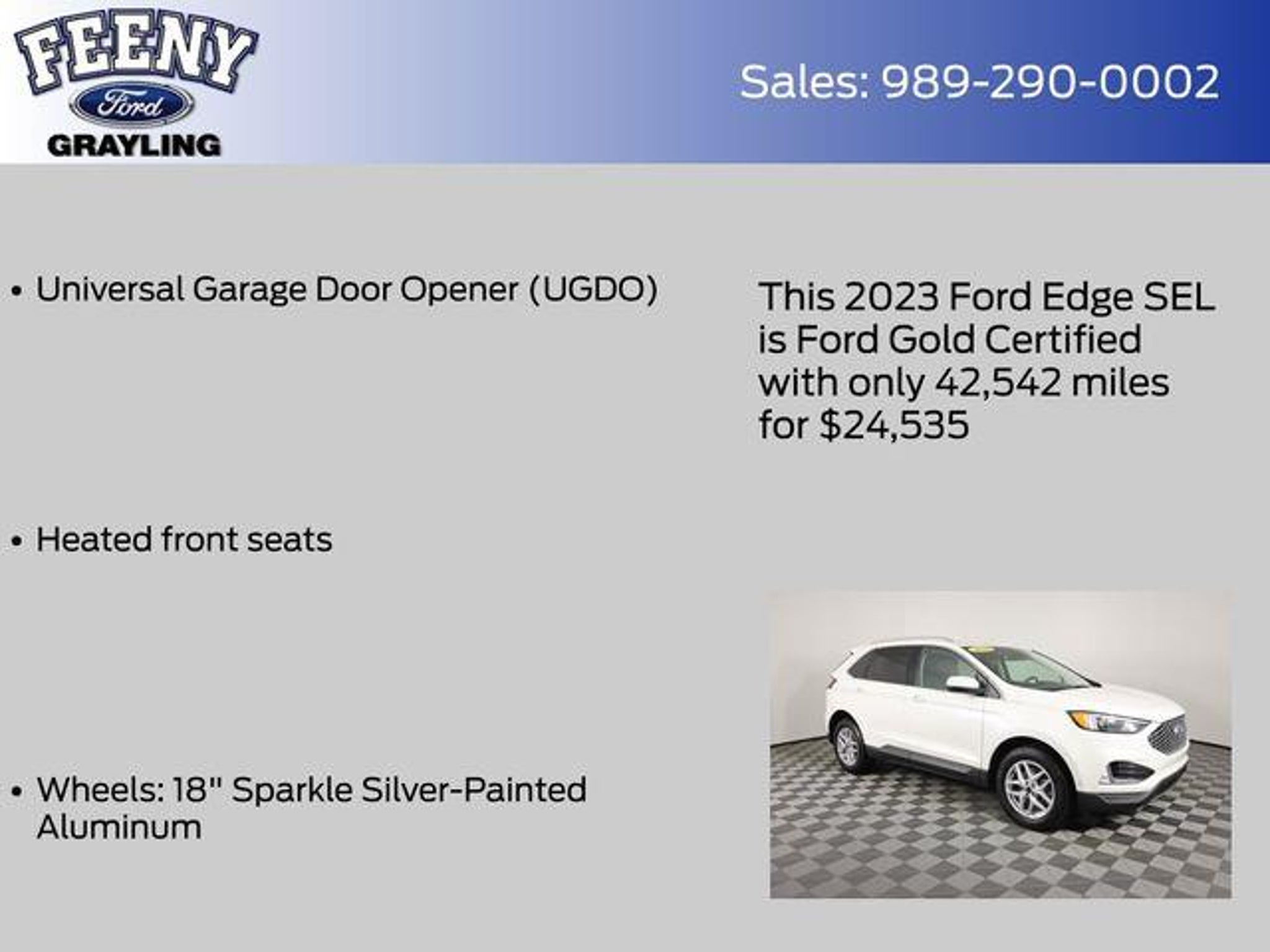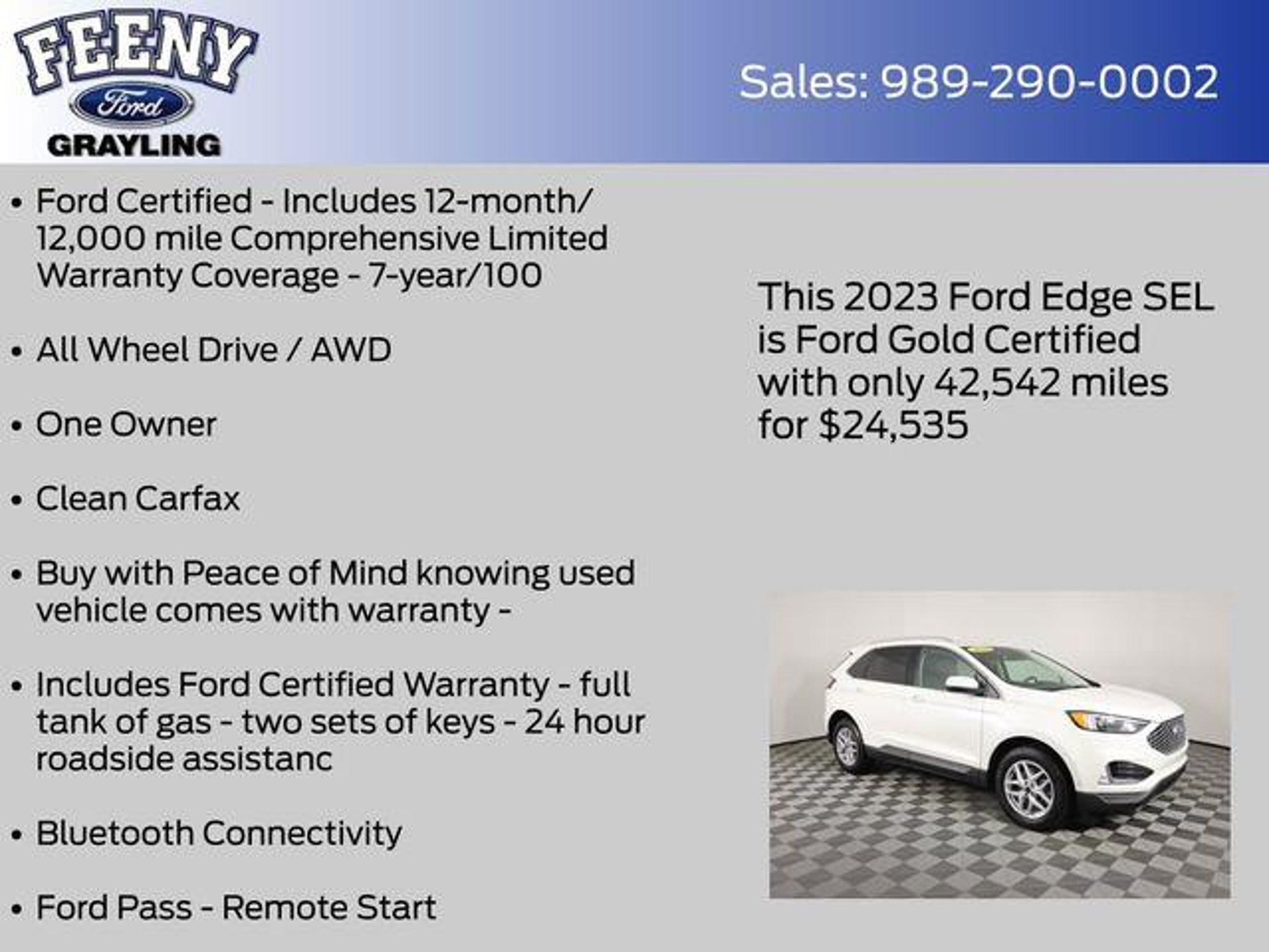 Elevate your driving experience with this exceptional 2023 Ford Edge SEL. This versatile crossover SUV offers the perfect blend of style, performance, and advanced technology to elevate your daily commute and weekend adventures. - Ford Certified - Includes 12-month/12,000 mile Comprehensive Limited Warranty Coverage - All Wheel Drive / AWD - One Owner - Clean Carfax - Bluetooth Connectivity - Ford Pass - Remote Start - Android Auto or Apple Car Play - Convenience Package - Equipment Group 201A - 110V/150W AC Power Outlet - Remote Start System - Power Liftgate - Perimeter Alarm - Fog Lamps w/Iconic Silver Bezel - Universal Garage Door Opener (UGDO) - Wireless Charging Pad - Heated front seats - Wheels: 18 Sparkle Silver-Painted Aluminum Powered by the efficient EcoBoost 2.0L I4 GTDi DOHC Turbocharged VCT engine paired with an 8-Speed Automatic transmission, this Edge SEL delivers an impressive 21 city / 28 highway MPG, ensuring you can go further on every tank. The sleek White exterior complements the spacious and well-appointed interior, making this vehicle a true head-turner. As a Ford Certified pre-owned vehicle, this Edge SEL has undergone a rigorous 172-point inspection and comes with a comprehensive warranty coverage, roadside assistance, and 22,000 FordPass Rewards Points to use toward your first two maintenance visits. You can purchase with confidence, knowing this vehicle has been meticulously cared for and is ready to provide you with years of reliable and enjoyable driving. Don't miss your opportunity to experience the exceptional quality and value of this 2023 Ford Edge SEL. Visit our showroom today and let us demonstrate how this versatile crossover can elevate your driving experience. Online all the time at FeenyFord.com