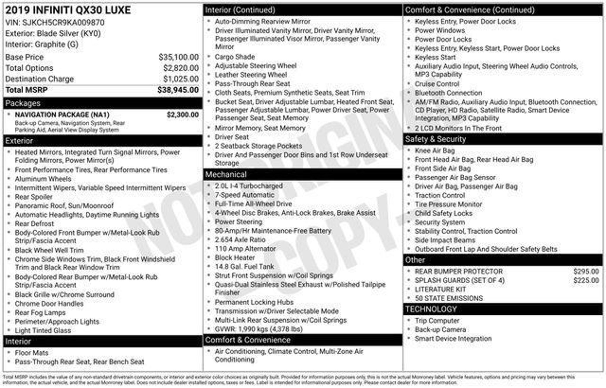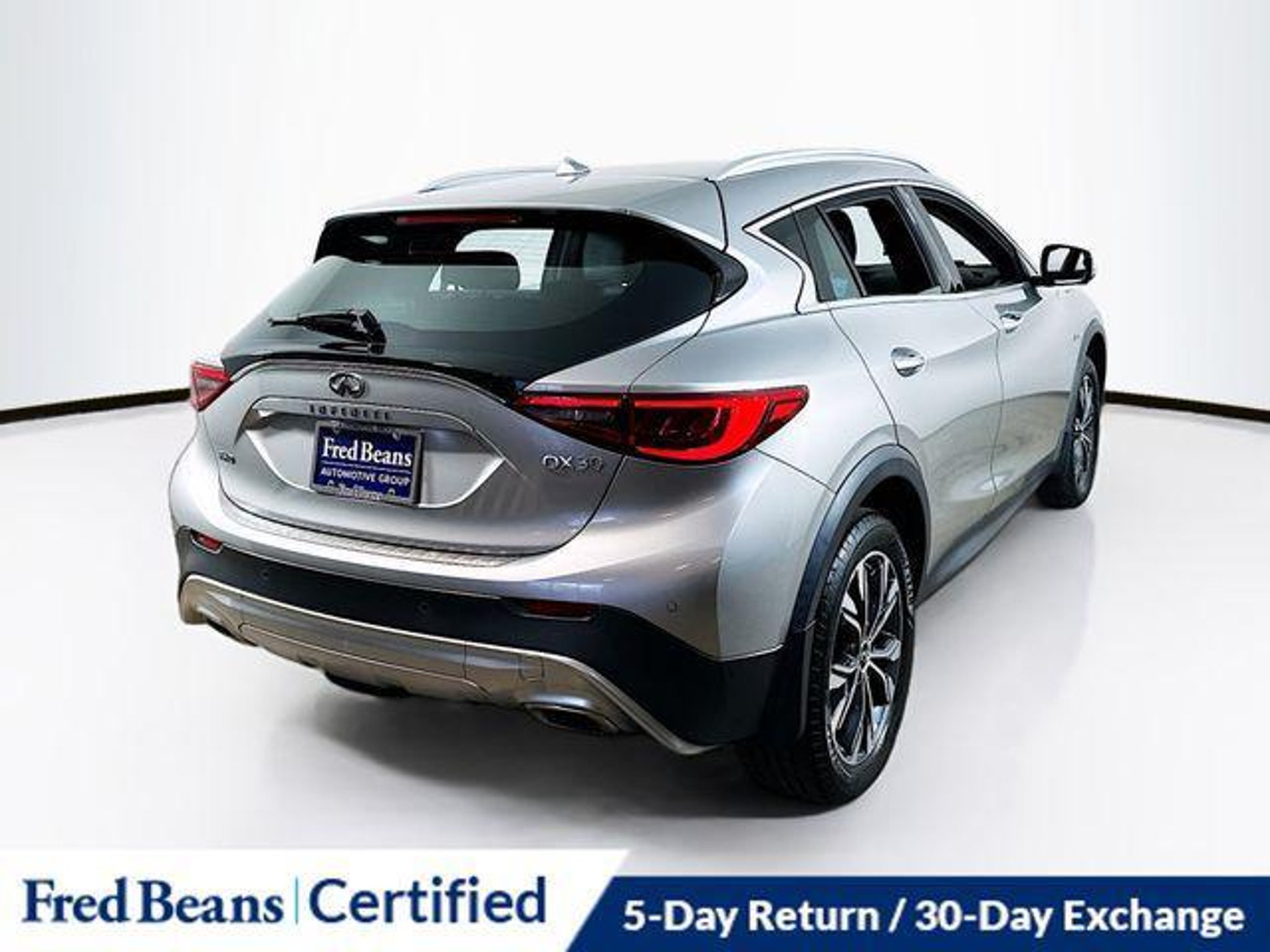 Discover the perfect blend of luxury and capability with this 2019 INFINITI QX30 LUXE. Boasting a striking silver exterior and a well-appointed interior, this all-wheel-drive SUV is ready to elevate your driving experience. "¢ Triton Certified Classic Vehicle "¢ 3 Month / 4,000 Mile Comprehensive Warranty "¢ Free First Oil Change "¢ 5 Day Return / 30 Day Exchange "¢ Auto Reward Program "¢ Navigation Package "¢ Rear Bumper Protector "¢ Splash Guards (Set of 4) "¢ Memory seat "¢ Power driver seat "¢ Power steering "¢ Power windows "¢ Remote keyless entry "¢ Steering wheel mounted audio controls "¢ ABS brakes "¢ Front & Rear Parking Sensors "¢ Rear fog lights "¢ Heated door mirrors "¢ Around View Monitor "¢ Color Center Meter Display "¢ INFINITI InTouch Navigation System "¢ Heated Front Bucket Seats Powered by a 2.0L I4 DOHC Turbocharged engine mated to a 7-Speed Automatic with Overdrive transmission, this QX30 delivers an impressive 21 city / 30 highway MPG, making it both efficient and capable. The advanced all-wheel-drive system ensures confident handling in a variety of road conditions. This Triton Certified Classic Vehicle comes with a 3 Month / 4,000 Mile Comprehensive Warranty, providing you with peace of mind and protection for your investment. Additionally, you'll enjoy the convenience of a free first oil change and the flexibility of our 5 Day Return / 30 Day Exchange policy. The INFINITI QX30 LUXE is more than just a luxury SUV - it's a gateway to a refined and rewarding driving experience. With its comprehensive suite of advanced features, including the Navigation Package, Around View Monitor, and INFINITI InTouch system, this vehicle is designed to keep you connected, entertained, and safe on the road. Discover the difference that Triton Certified quality and our exceptional customer service can make. Schedule a test drive today and experience the exceptional value and capabilities of this 2019 INFINITI QX30 LUXE.