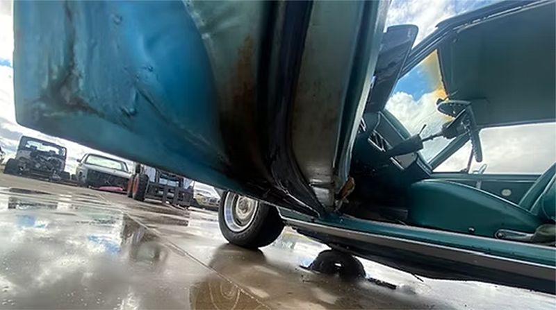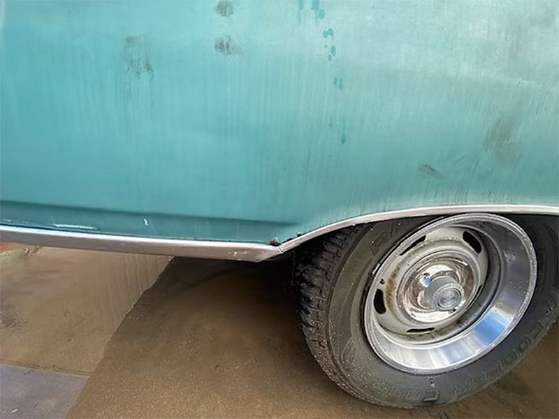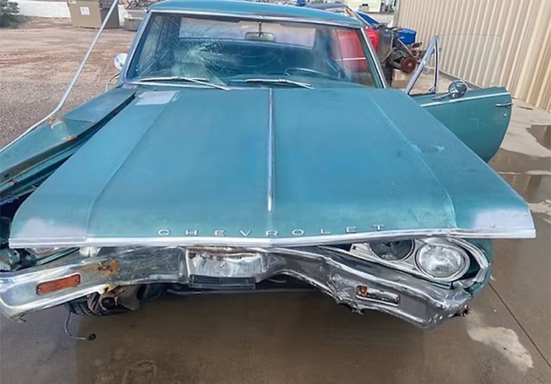 A 2 Dr. Hardtop with substantial front end damage as shown. Car appears correct and original throughout. Power plant is a correct 283 (engine code JD) with Power Glide Transmission. The car looks like it's had one re-paint (likely decades ago), upholstery appears original and in remarkably decent condition. Overall, this is a very solid car, very minimal rust, excellent floors and really clean trunk and jambs. Needs will obviously include frame work or replacement (we have one available) and some front end sheet metal less hood.