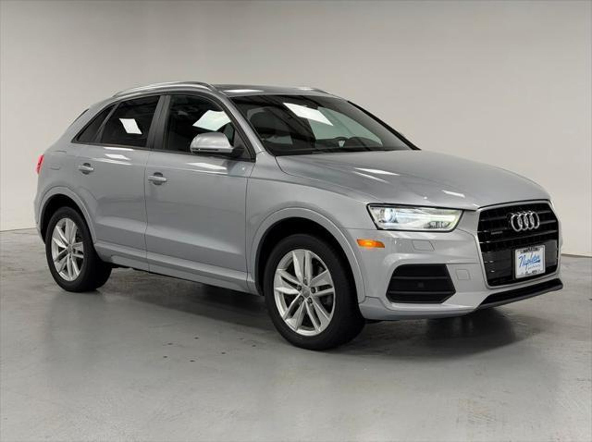 Recent Arrival! Silver Metallic 2017 Audi Q3 4D Sport Utility 2.0T Premium quattro 2.0L 4-Cylinder TFSI quattro Clean CARFAX. 10 Speakers, 4-Wheel Disc Brakes, ABS brakes, Air Conditioning, Alloy wheels, AM/FM radio, Audi Advanced Key, Audi Connect w/Online Services, Audi MMI Navigation Plus, Audi MMI Navigation Plus Package, Automatic temperature control, Axle Ratio: TBD, Black Cloth Headliner, Black Homelink, Brake assist, Bumpers: body-color, CD player, Convenience Package, Delay-off headlights, Driver door bin, Driver vanity mirror, Dual front impact airbags, Dual front side impact airbags, Electronic Stability Control, Exterior Parking Camera Rear, Four wheel independent suspension, Front anti-roll bar, Front Bucket Seats, Front Center Armrest, Front dual zone A/C, Front fog lights, Front reading lights, Fully automatic headlights, Heated Front Seats, High intensity discharge headlights: Xenon plus, Illuminated entry, Leather Seating Surfaces, Leather Shift Knob, Leather steering wheel, Low tire pressure warning, Navigation System, Occupant sensing airbag, Outside temperature display, Overhead airbag, Overhead console, Panic alarm, Passenger door bin, Passenger vanity mirror, Power door mirrors, Power driver seat, Power moonroof, Power passenger seat, Power steering, Power windows, Radio data system, Radio: Audi Concert, Rain sensing wipers, Rear anti-roll bar, Rear fog lights, Rear reading lights, Rear seat center armrest, Rear window defroster, Rear window wiper, Remote keyless entry, Roof rack: rails only, Security system, Speed control, Speed-sensing steering, Split folding rear seat, Spoiler, Steering wheel mounted audio controls, Tachometer, Telescoping steering wheel, Tilt steering wheel, Traction control, Trip computer, Turn signal indicator mirrors, Variably intermittent wipers, Wheels: 7.0 x 18 5-Arm Turbine Design. This Q3 is well equipped with Audi MMI Navigation Plus Package (Audi Connect w/Online Services and Audi MMI Navigation Plus), Convenience Package (Audi Advanced Key), 10 Speakers, 4-Wheel Disc Brakes, ABS brakes, Air Conditioning, Alloy wheels, AM/FM radio, Automatic temperature control, Axle Ratio: TBD, Black Cloth Headliner, Black Homelink, Brake assist, Bumpers: body-color, CD player, Delay-off headlights, Driver door bin, Driver vanity mirror, Dual front impact airbags, Dual front side impact airbags, Electronic Stability Control, Exterior Parking Camera Rear, Four wheel independent suspension, Front anti-roll bar, Front Bucket Seats, Front Center Armrest, Front dual zone A/C, Front fog lights, Front reading lights, Fully automatic headlights, Heated Front Seats, High intensity discharge headlights: Xenon plus, Illuminated entry, Leather Seating Surfaces, Leather Shift Knob, Leather steering wheel, Low tire pressure warning, Navigation System, Occupant sensing airbag, Outside temperature display, Overhead airbag, Overhead console, Panic alarm, Passenger door bin, Passenger vanity mirror, Power door mirrors, Power driver seat, Power moonroof, Power passenger seat, Power steering, Power windows, Radio data system, Radio: Audi Concert, Rain sensing wipers, Rear anti-roll bar, Rear fog lights, Rear reading lights, Rear seat center armrest, Rear window defroster, Rear window wiper, Remote keyless entry, Roof rack: rails only, Security system, Speed control, Speed-sensing steering, Split folding rear seat, Spoiler, Steering wheel mounted audio controls, Tachometer, Telescoping steering wheel, Tilt steering wheel, Traction control, Trip computer, Turn signal indicator mirrors, Variably intermittent wipers, and Wheels: 7.0 x 18 5-Arm Turbine Design.
