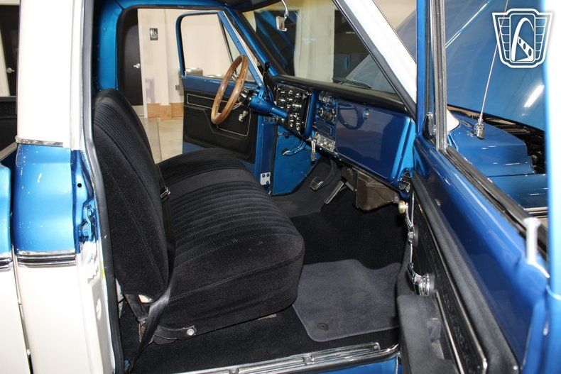 Step inside to find a comfortable and inviting black cloth interior. The cabin is equipped with air conditioning, ensuring a pleasant ride no matter the weather. The truck also features an AM radio, great for those who appreciate the nostalgic charm of classic radio tunes during their drive. Safety and convenience are prioritized with the inclusion of seatbelts, power steering, and power brakes, making this C10 as practical as it is stylish.