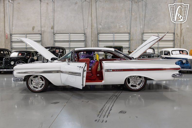 Gateway Classic Cars of San Antonio/Austin is excited to present this 1959 Chevrolet Impala. Finished in a crisp white exterior over a fully custom red leather interior, this Impala blends the unmistakable style of the late 1950s with modern performance and craftsmanship. Powering this build is a 6.2L V8 engine paired with a 4L60E automatic transmission, producing an estimated 500 horsepower as stated by the seller. The car underwent a four-year restoration, resulting in a striking combination of vintage design and updated engineering. This Impala features a range of performance upgrades and custom touches. It's equipped with an electronic air ride suspension for adjustable ride height and comfort, a 9-inch rear end, and a custom engine bay featuring a Champion Cooling aluminum radiator, Holley EFI, Hedman Hussler headers, and a Tru Trac air conditioning system. CPP power brakes and power steering provide modern drivability and confident control behind the wheel. The exterior retains much of its original charm, highlighted by original chrome as stated by the seller and refinished stainless steel that complement the clean body lines. It rides on Billet Specialties aluminum wheels wrapped in distinctive red sidewall performance tires that tie in beautifully with the car's interior color scheme. Inside, the Impala showcases a fully custom red leather interior and matching trunk upholstery, offering a cohesive and luxurious presentation. Power windows, air conditioning, and an AM/FM radio add comfort and convenience for cruising. This 1959 Chevrolet Impala represents a blend of classic American design and modern performance. With its detailed restoration, custom craftsmanship, and an estimated 500 horsepower stated by the seller, it stands as a remarkable interpretation of one of Chevrolet's most iconic models.