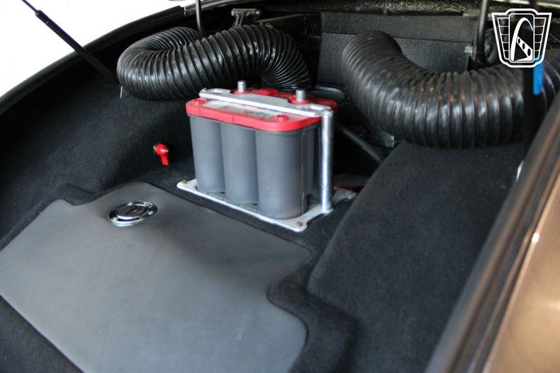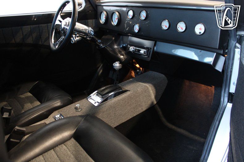 Step inside to experience the luxurious black leather interior custom fabricated by Giacoletto Custom Interiors where comfort meets style. Custom Auto Meter gauges provide you with the vital information needed to ensure everything is functioning as it should. A B&M Custom shifter enables to to shift smoothly. It has a chromed steering column has been added with tilt wheel and a custom s spoke steering wheel. The leather seats offer a plush seating experience, ensuring that every ride is as enjoyable as it is memorable. The interior is complemented by a range of features designed to enhance your driving experience, including a JVC sound system providing AM/FM radio and a CD player, allowing you to enjoy your favorite tunes as you cruise along.