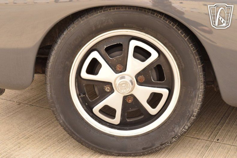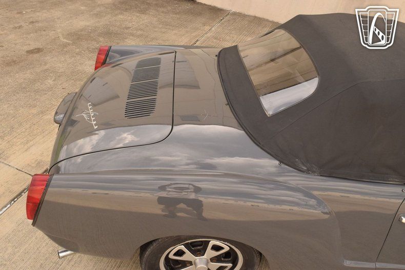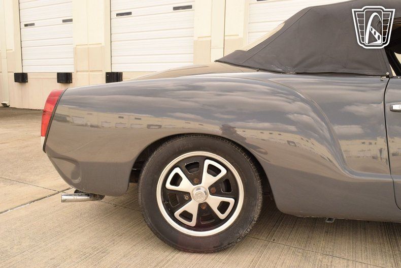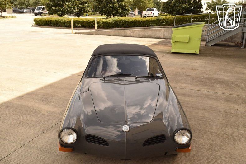 The exterior is finished in a sophisticated gray hue that accentuates the graceful, flowing lines characteristic of the Karmann Ghia's Italianinspired design. The manual convertible soft top offers both open-air freedom and cozy closedtop comfort, while chrome hub caps add a tasteful metallic contrast that recalls the automotive style of the era.