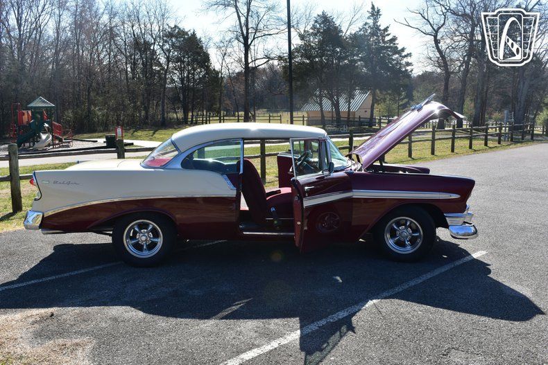 Safety and comfort are further enhanced with the inclusion of seatbelts, a thoughtful addition that underscores the vehicle's blend of classic charm and modern practicality. The tilt steering wheel offers adjustable comfort, allowing drivers to find their ideal driving position with ease. This 1956 Chevrolet Bel Air is a remarkable representation of mid-century automotive design, offering a unique blend of style, performance, and comfort.
