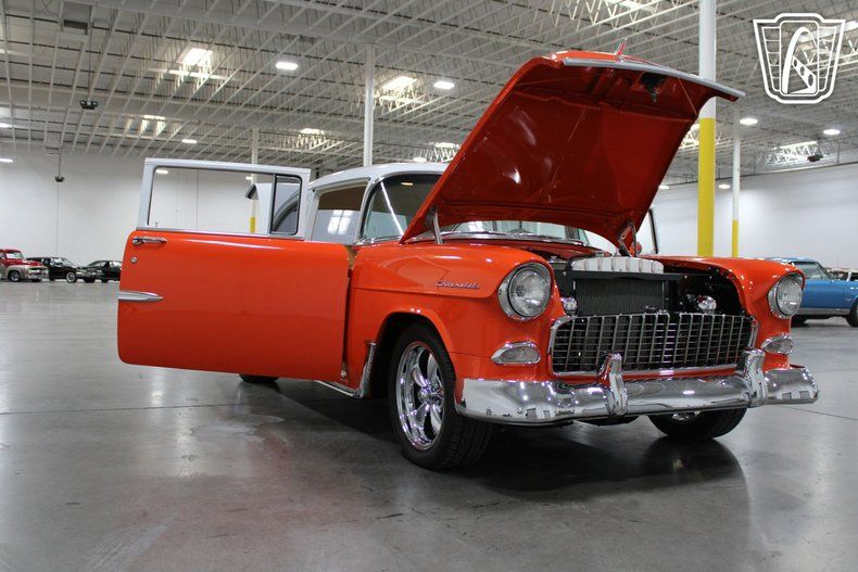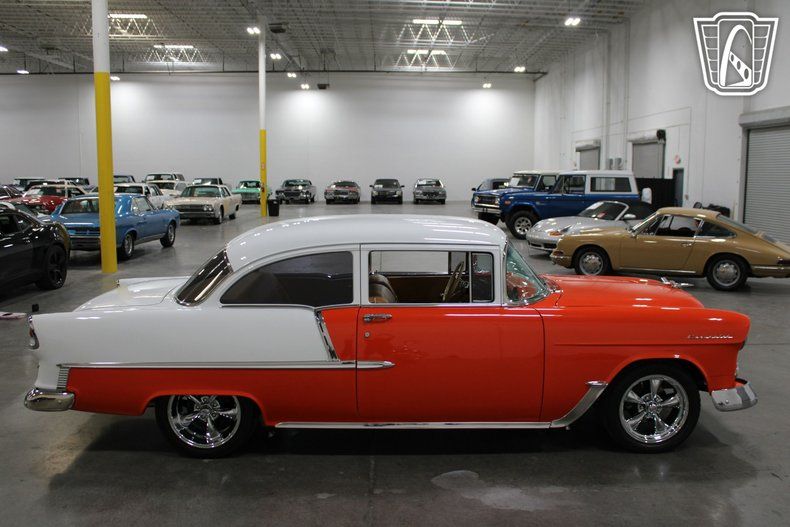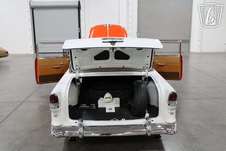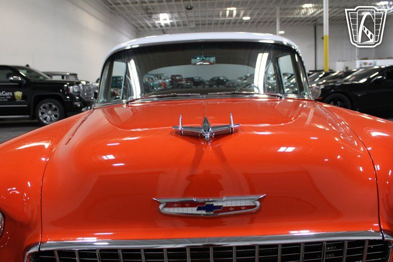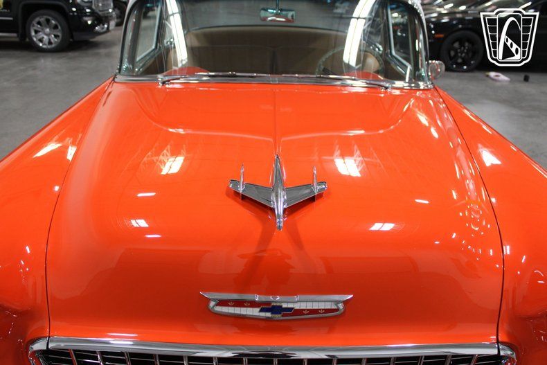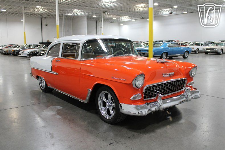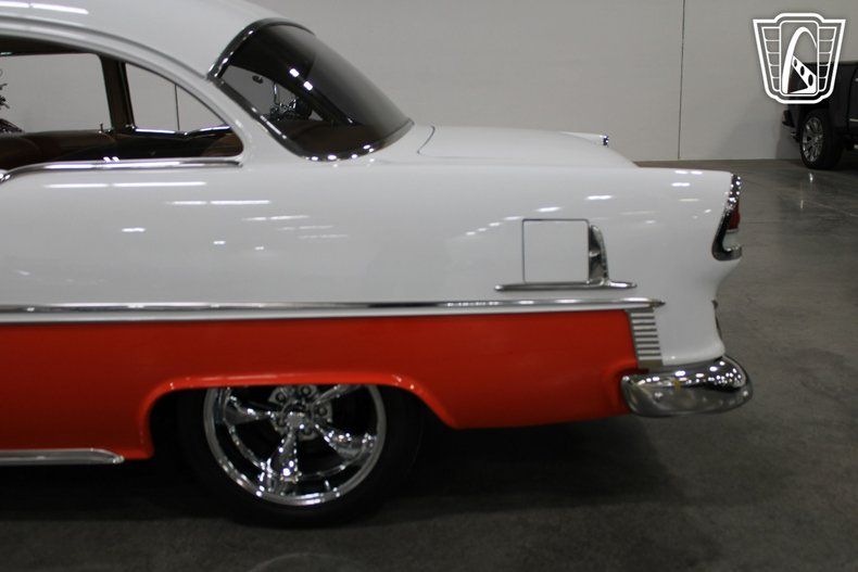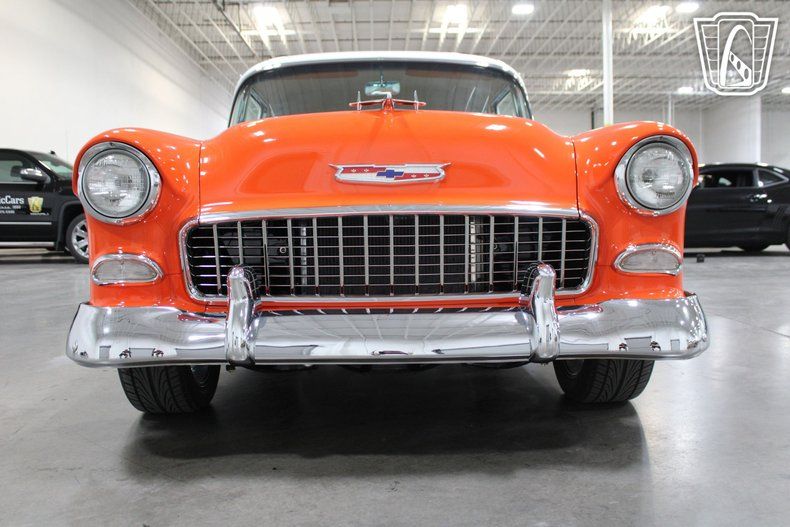 Gateway Classic Cars of Las Vegas is excited to digitally present this classic piece of American automotive history: the 1955 Chevrolet Bel Air. This iconic vehicle stands out with its striking orange and white exterior, a color that captures the spirit and vibrancy of the era. The bold hue is complemented by custom wheels that add a touch of modern flair while maintaining the car's vintage charm.