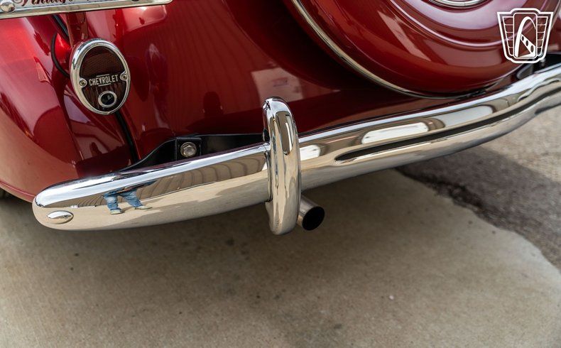 The 1935 Chevrolet Master Deluxe is equipped with a set of wide white wall tires, a feature that not only enhances its aesthetic appeal but also pays homage to the classic styling cues of the era. These tires are adorned with hub caps that complete the vehicle's look, adding a polished finish to its overall appearance. The attention to detail in the design and features of this vehicle is a testament to the craftsmanship and dedication that went into its creation.