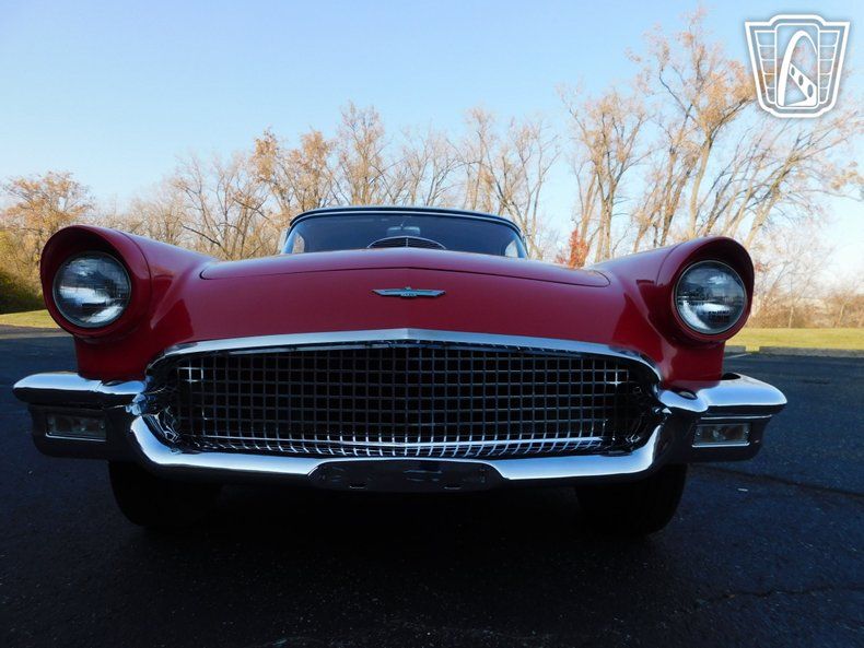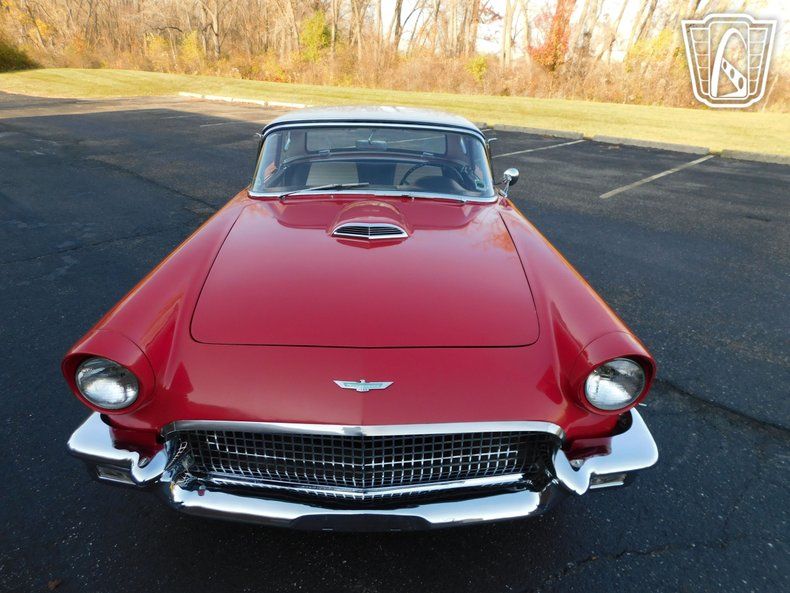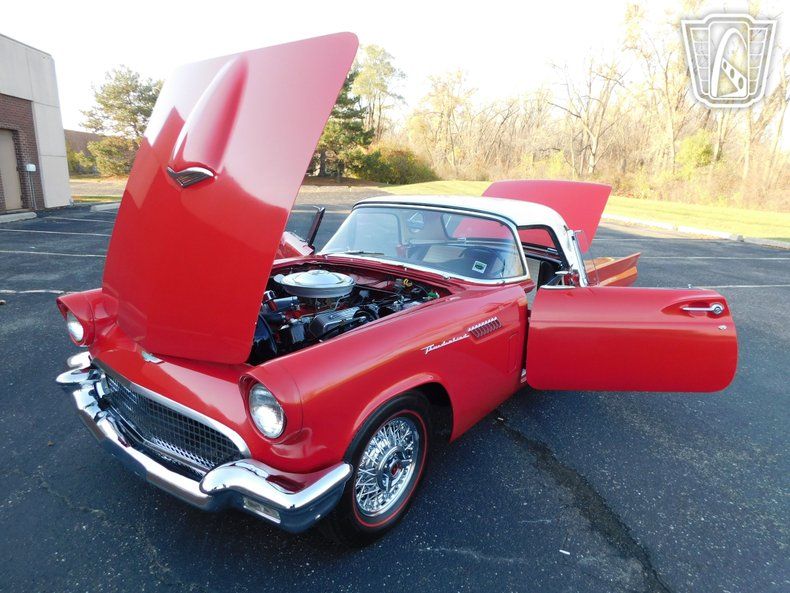 Gateway Classic Cars of Detroit is proud to present this 1957 Ford Thunderbird. The first generation of the Ford Thunderbird is a two-seat convertible produced by Ford for the 1955 to 1957 model year, the first 2-seat Ford since 1938. It was developed in response to the 1953 Motorama display at the New York Auto Show, which showed the Chevrolet Corvette. The Corvette in turn was developed in response to the popularity of European sports cars among Americans. For the 1957 model year, the front bumper was reshaped, the grille and tailfins were made larger, and larger taillights were fitted. The spare wheel moved back inside the trunk, which had been redesigned to allow it to be mounted vertically. The side "Thunderbird" script was moved from the fins to the front fenders. Powering this 1957 Ford Thunderbird is a 312 Cubic Inch V8 backed by the "Ford-o-matic" Automatic Transmission. Finished in a beautiful red, with a white hard and soft top give this T-bird a real classy look. To add on to that class, is the interior which is a black and white vinyl that still looks beautiful. Options on this 1957 Ford Thunderbird include: AM/FM radio, 2 tops, power brakes, power steering, power windows, and beautiful wire wheels. Don't miss out on your chance to own this 2-seater Ford T-bird!