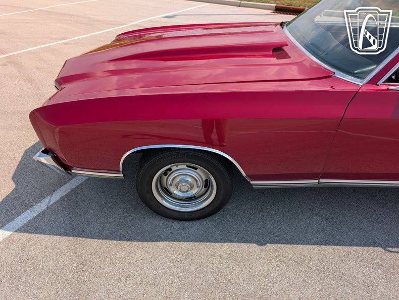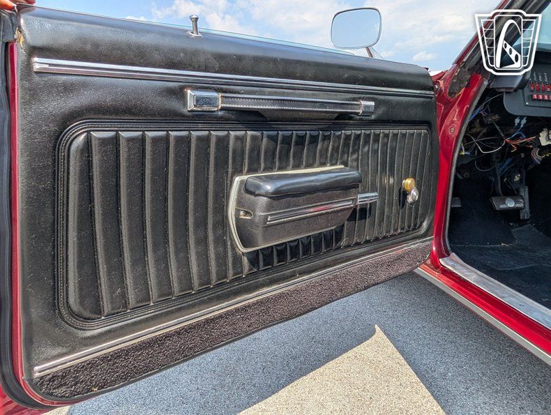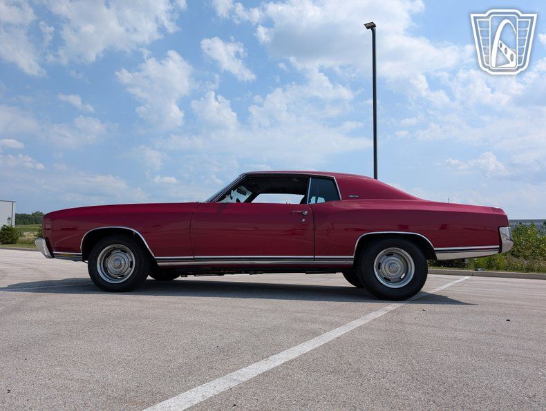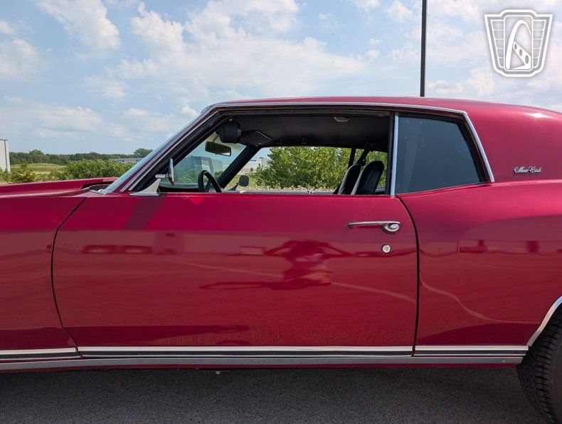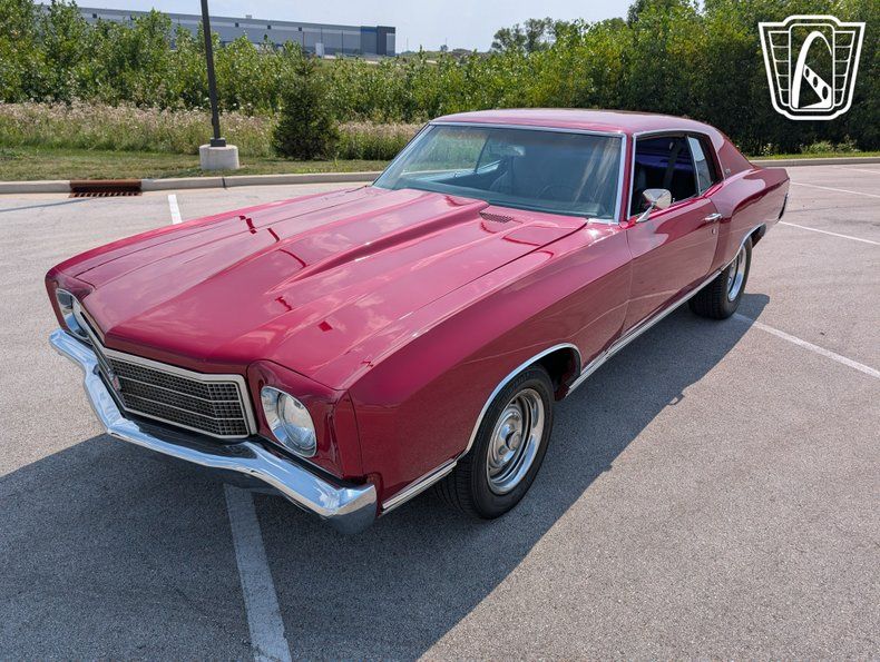 Introducing a classic icon of American automotive history, the 1970 Chevrolet Monte Carlo, a vehicle that embodies the spirit of the muscle car era with its bold design and powerful performance. This particular model stands out with its striking red exterior, a color that not only captures attention but also highlights the sleek lines and timeless elegance of the Monte Carlo's design. Paired with a sophisticated black interior, this car offers a visually appealing contrast that enhances its overall allure.