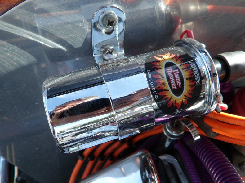The 327 CID V8 engine is built with a Holley Dominator intake manifold, Holley 4-barrel carburetor, Pertronix Flame Thrower HEI distributor, aluminum radiator with electric fan, and chrome headers side pipe headers. That power is transferred to a Turbo 350 3-speed automatic transmission.