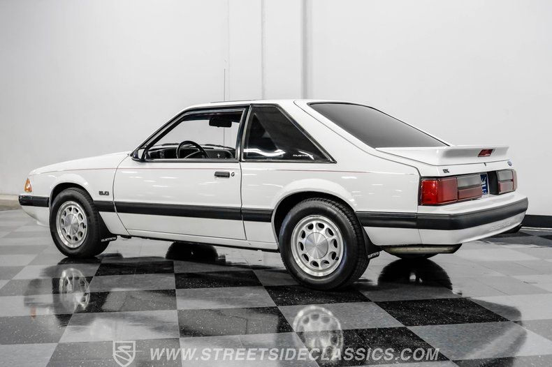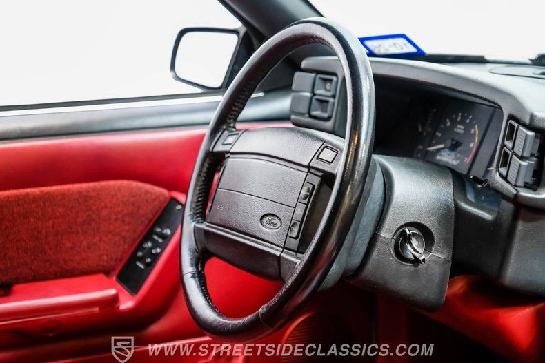 Unlike so many of these cars that have been highly modified and changed over time, under the hood we find a High-Output version of Ford's venerable 5.0-liter V-8 engine that, aside from its FlowMaster dual exhaust, looks much as it did when it rolled off the assembly line. Power from that small block is routed through a four-speed automatic transmission before being sent out to the rear wheels, where factory 15-inch rims shod in 235/60R-15 General rubber put those ponies to the pavement. At the same time, a narrower set of 225/60R-15 tires handles steering duties up front.
