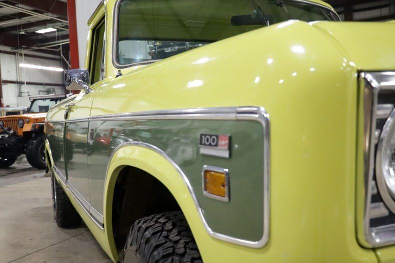 The exterior is finished in a striking Canary Yellow, complemented by subtle Willow Green accents, making it a standout on the road or trail. This unique color combination enhances the truck's vintage appeal while paying homage to the bold styling of the era. The body is straight and solid, with clean lines that reflect the craftsmanship of International Harvester's design philosophy.