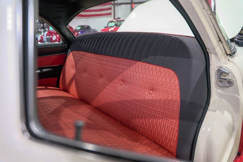 Inside, the two tone red and black cloth bench seat creates a welcoming atmosphere that perfectly matches the exterior hues. The car features an electric front seat, electric wipers, and a period correct AM push button radio alongside factory style gauges for oil, temperature, fuel, and a dash mounted clock. Details like the black headliner, chrome trim, and well preserved interior materials show off the car's originality and understated elegance.