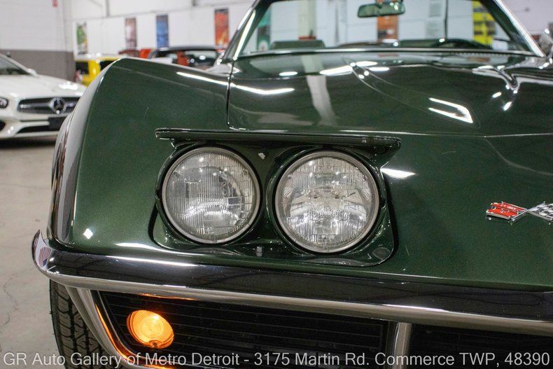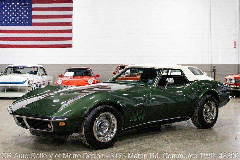 GR Auto Gallery is pleased to present this meticulously cared-for 1969 Chevrolet Corvette for your consideration. Finished in stunning Polo Green over a matching Green interior, this Corvette is powered by its numbers-matching 350 cubic inch V8 producing 300 horsepower, paired with a 3-speed manual transmission. This example comes with exceptional provenance including the original title and original sales order, and even the check. It has clearly benefited from careful ownership throughout its life. In 2023, over $5,000 was invested in a brand-new interior and a new convertible top. All mechanical work has been completed by renowned Corvette specialists Vettestorations, including a repaired carburetor with new carburetor gasket and throttle shaft ($1,601), a new alternator, installation of a new power steering kit, new timing chain and gears, new seals, and a new water pump. All receipts are included with the sale, further documenting the care and attention this Corvette has received. Drive this one out of our showroom or have us assist with shipping it to you anywhere in the United States! Don't hesitate to call us with any questions or for more information.