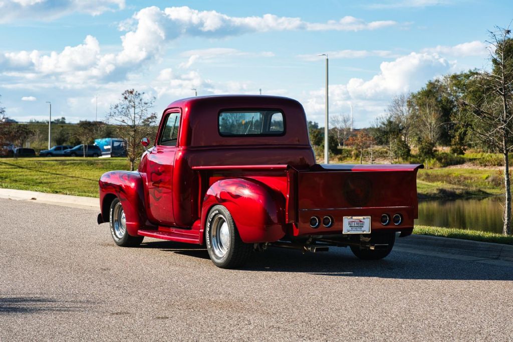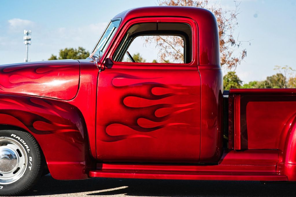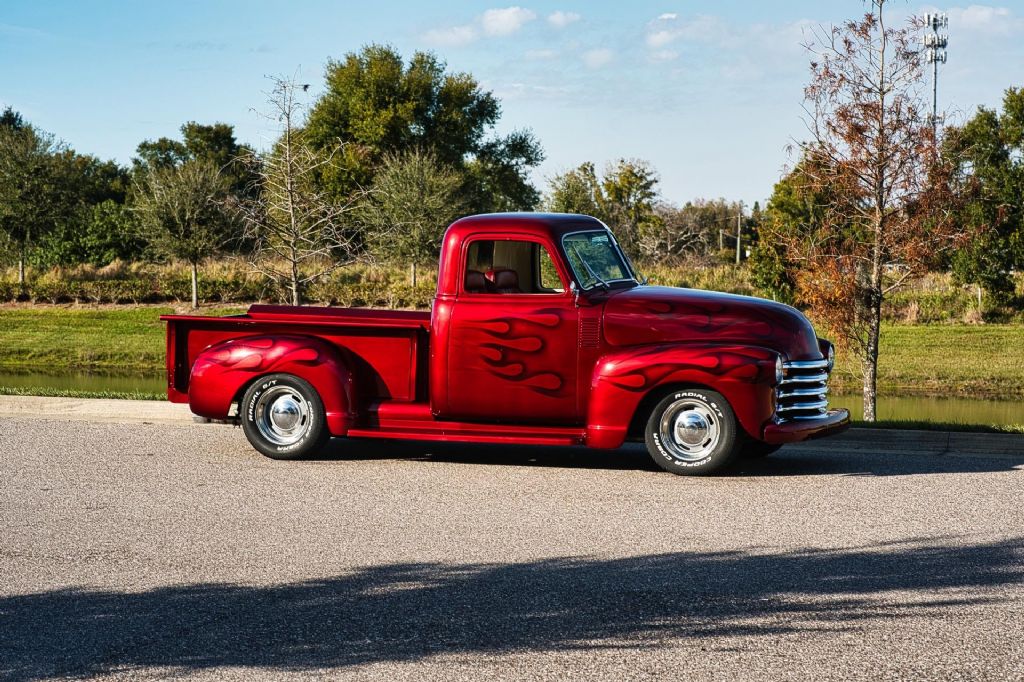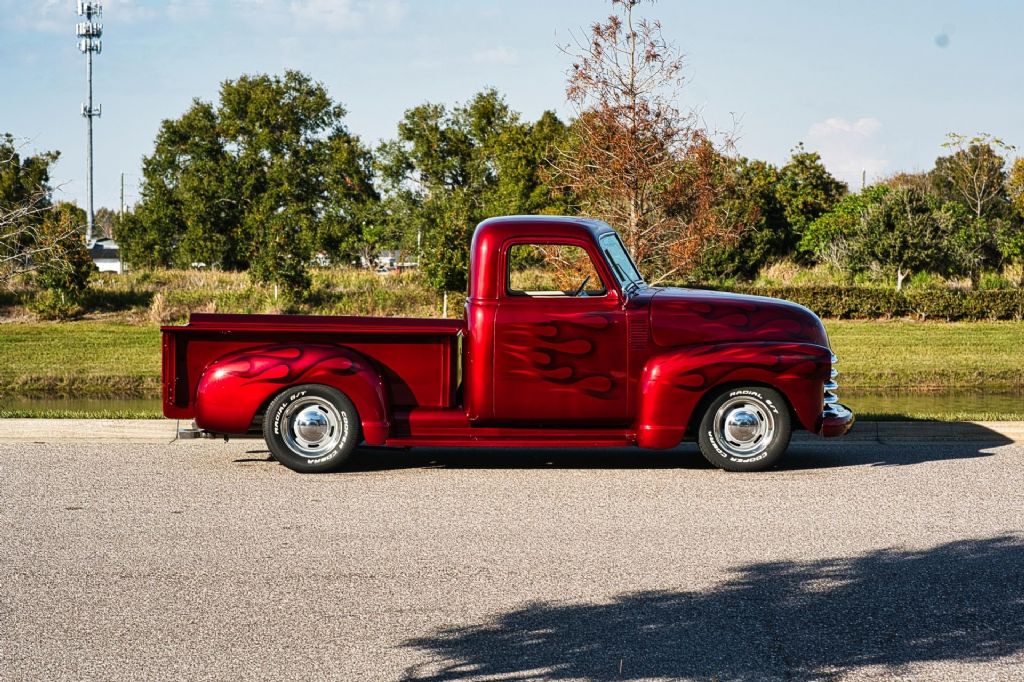 This 1950 Chevrolet 3100 1/2 Ton Pickup Truck is an outstanding example of a classic American workhorse that has been extensively upgraded and transformed into a high-quality custom street truck. Finished in a deep burgundy wine exterior with tasteful airbrush graphics, this truck delivers show-level presentation while offering modern performance, comfort, and drivability. Under the hood sits a strong-running 350 CID V8 engine topped with a Demon 4-barrel carburetor, aluminum intake manifold, and ball-milled aluminum air cleaner. The engine bay is exceptionally detailed, featuring polished stainless steel water pipes, a polished aluminum overflow reservoir, anodized fuel line fittings, Summit fuel pressure regulator with gauge, chrome valve covers with breathers, Taylor spark plug wires, chrome alternator, serpentine belt drive, electric cooling fan, and a fully smoothed and filled firewall. Ceramic-coated exhaust headers feed a side-exit dual exhaust system for an aggressive yet refined sound. Power is delivered through a 3-speed automatic transmission, controlled by a billet floor shifter, and sent to a Ford 9-inch rear end. The chassis has been thoroughly upgraded with tubular A-arms, 2-inch drop spindles, power rack-and-pinion steering, power steering, four-link rear suspension with adjustable coil-over shocks, and power four-wheel disc brakes. A frame-mounted dual-reservoir brake booster provides confident stopping performance. The exterior retains classic 3100 styling with modern touches, including a painted front bumper, chrome grille, LED turn signals, shaved door handles with poppers, hidden door hinges, one-piece window glass, and a custom roll pan. The truck rides on 15-inch wheels with trim rings and hubcaps, wrapped in brand new Cooper Cobra white letter radial tires. Inside, the custom upholstered interior is finished in red and white and blends vintage charm with modern convenience. Features include bucket seats with seat belts, red carpeting, custom headliner and visors, billet pedals, white-faced gauges, an ididit chrome tilt steering column with aluminum drop bracket, Budnik burlwood steering wheel, power windows, and a Kenwood multimedia stereo with Bluetooth connectivity and center console speakers. The oak cargo bed is equally impressive, featuring a custom oak bed floor with polished stainless steel runners, an in-bed fuel filler, and excellent overall fit and finish. This truck is an excellent example of a 72-year-old 1/2 ton pickup that has been dramatically improved from its original condition. The combination of a 350 V8 engine, automatic transmission, upgraded suspension and brakes, and a fully custom interior makes this a highly desirable and usable classic. Finished to a very high standard and presented in excellent condition, this 1950 Chevrolet 3100 is ready to be driven, shown, and enjoyed. Build Highlights & Features: 1950 Chevrolet 3100 1/2 Ton Pickup Truck Show-quality burgundy wine exterior paint with airbrush graphics Red and white custom upholstered interior 350 CID V8 engine Demon 4-barrel carburetor Aluminum intake manifold Ball-milled aluminum air cleaner Polished stainless steel water pipes Polished aluminum overflow reservoir Anodized fuel line fittings Summit fuel pressure regulator with gauge Chrome valve covers with breathers Taylor spark plug wires Chrome alternator Serpentine drive belt system Electric cooling fan Smoothed and filled firewall Drivetrain & Chassis: 3-speed automatic transmission Ford 9-inch rear end Power steering Power rack-and-pinion steering Tubular A-arms 2-inch drop spindles Four-link rear suspension Adjustable coil-over shocks Power four-wheel disc brakes Frame-mounted dual-reservoir brake booster Ceramic-coated exhaust headers Side-exit dual exhaust system Exterior Features: Painted front bumper Chrome grille LED turn signals Shaved door handles with poppers Hidden door hinges One-piece window glass Custom roll pan 15-inch wheels with trim rings and hubcaps Brand new Cooper Cobra white letter radial 15-inch tires Interior & Comfort: Bucket seats with seat belts Center console Billet floor shifter Billet pedals White-faced gauges ididit chrome tilt steering column Aluminum steering column drop bracket Budnik burlwood steering wheel Power windows Kenwood multimedia stereo with Bluetooth connectivity Center console speakers Custom headliner and visors Red carpeting Bed & Details: Custom oak bed floor Polished stainless steel bed runners In-bed fuel filler Oak cargo bed While we do our best to provide the highest quality muscle cars with an honest and reliable description and realize the importance of transparency when selling vehicles. That being said, we have not built, modified, changed or personally owned this vehicle. Whether this vehicle is consigned or owned by Past & Present Motor Cars we do not know the vehicles complete history since new. We want to be clear and try to answer any questions our customers might have prior to purchasing. Additionally, we not only welcome but we encourage 3rd party independent inspections. Please inquire prior to purchase to make sure the advertised vehicle has not already been sold. We list our vehicles on multiple websites and a vehicle can sell at any time. If a customer chooses to purchase sight unseen (many of our customers choose this option) the customer accepts the vehicle AS IS and WHERE IS and understands we cannot address concerns after purchase. For this reason, it's important all concerns are addressed prior to purchase. We make every effort to present accurate and reliable information, but use of this information is voluntary, and should only be deemed reliable after an independent review of its accuracy, completeness, and timeliness. It is the sole responsibility of the customer to verify the existence of options, accessories and the vehicle condition before time of sale. Financing is Available with low rates and Vehicle Shipping is available from our Showroom to your
