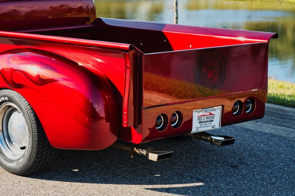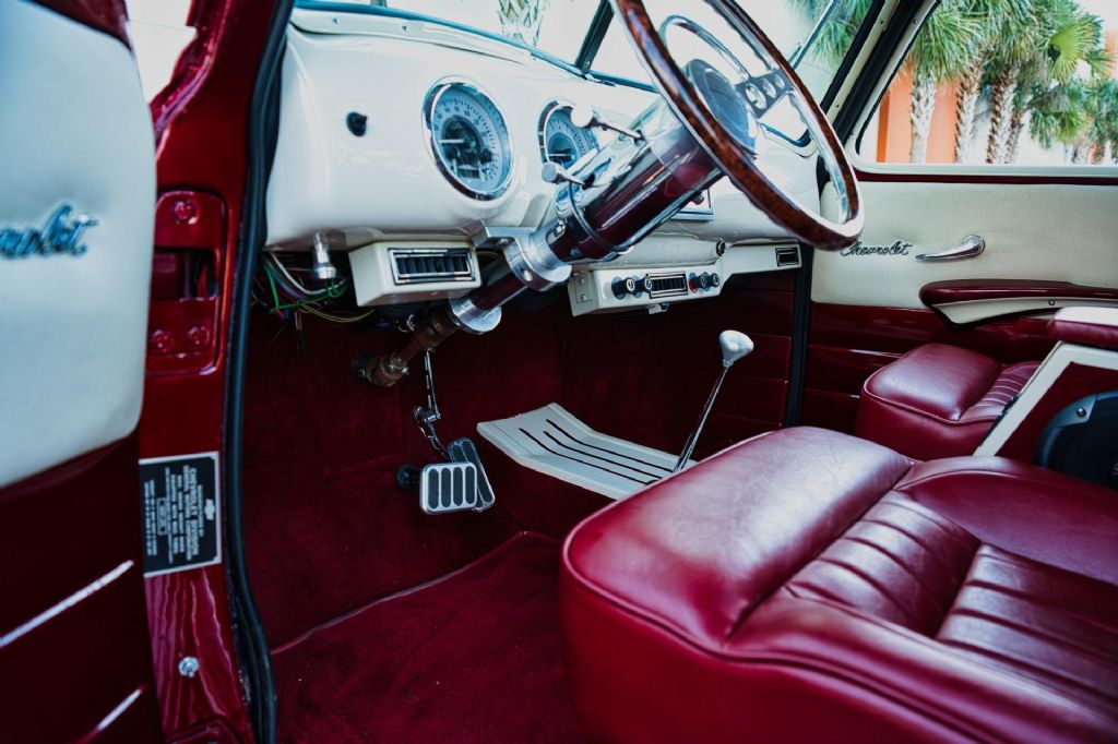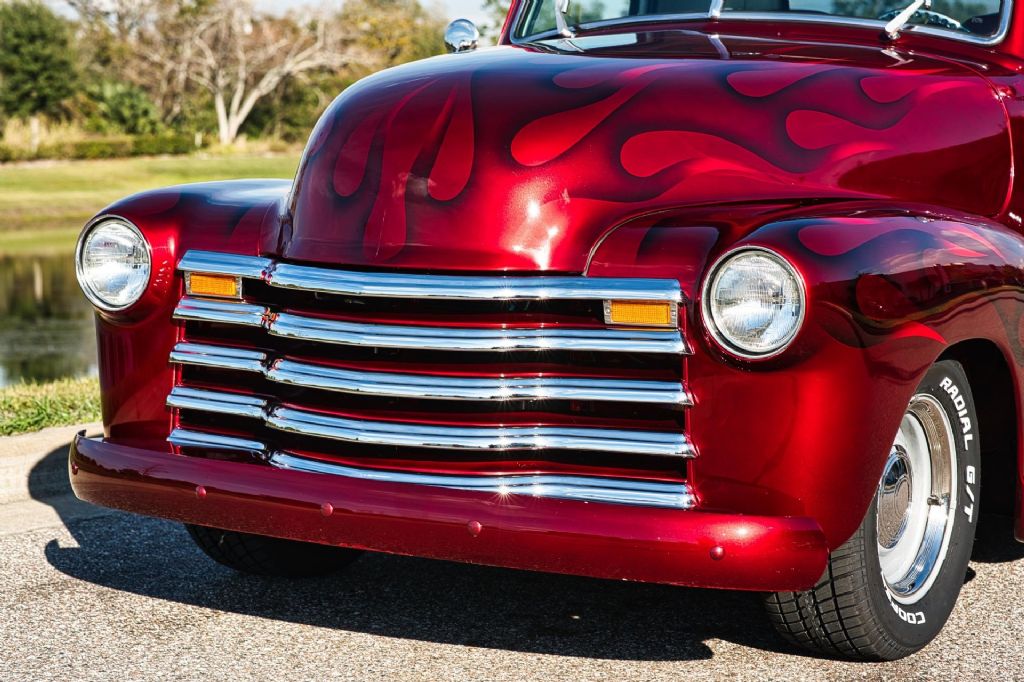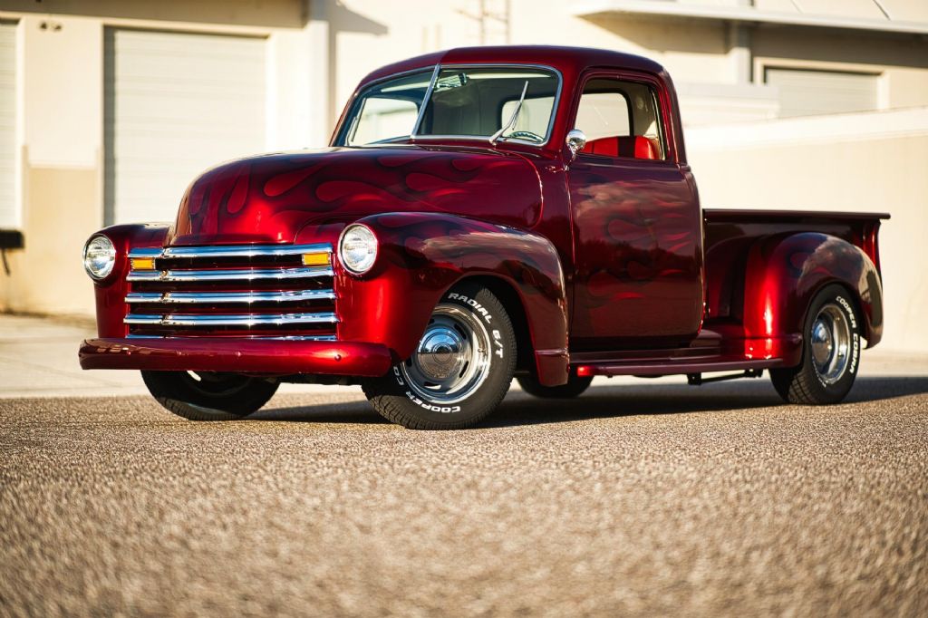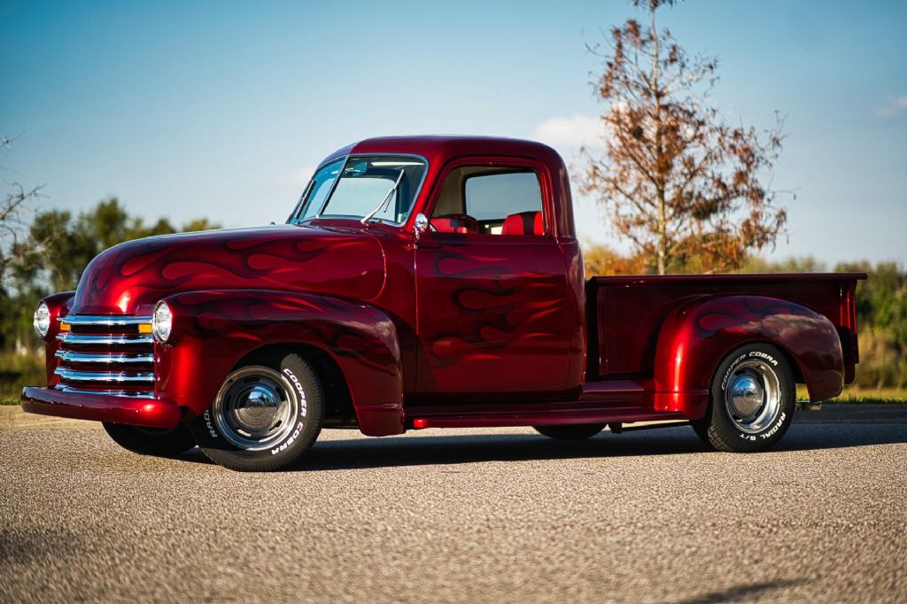 This 1950 Chevrolet 3100 1/2 Ton Pickup Truck is an outstanding example of a classic American workhorse that has been extensively upgraded and transformed into a high-quality custom street truck. Finished in a deep burgundy wine exterior with tasteful airbrush graphics, this truck delivers show-level presentation while offering modern performance, comfort, and drivability. Under the hood sits a strong-running 350 CID V8 engine topped with a Demon 4-barrel carburetor, aluminum intake manifold, and ball-milled aluminum air cleaner. The engine bay is exceptionally detailed, featuring polished stainless steel water pipes, a polished aluminum overflow reservoir, anodized fuel line fittings, Summit fuel pressure regulator with gauge, chrome valve covers with breathers, Taylor spark plug wires, chrome alternator, serpentine belt drive, electric cooling fan, and a fully smoothed and filled firewall. Ceramic-coated exhaust headers feed a side-exit dual exhaust system for an aggressive yet refined sound. Power is delivered through a 3-speed automatic transmission, controlled by a billet floor shifter, and sent to a Ford 9-inch rear end. The chassis has been thoroughly upgraded with tubular A-arms, 2-inch drop spindles, power rack-and-pinion steering, power steering, four-link rear suspension with adjustable coil-over shocks, and power four-wheel disc brakes. A frame-mounted dual-reservoir brake booster provides confident stopping performance. The exterior retains classic 3100 styling with modern touches, including a painted front bumper, chrome grille, LED turn signals, shaved door handles with poppers, hidden door hinges, one-piece window glass, and a custom roll pan. The truck rides on 15-inch wheels with trim rings and hubcaps, wrapped in brand new Cooper Cobra white letter radial tires. Inside, the custom upholstered interior is finished in red and white and blends vintage charm with modern convenience. Features include bucket seats with seat belts, red carpeting, custom headliner and visors, billet pedals, white-faced gauges, an ididit chrome tilt steering column with aluminum drop bracket, Budnik burlwood steering wheel, power windows, and a Kenwood multimedia stereo with Bluetooth connectivity and center console speakers. The oak cargo bed is equally impressive, featuring a custom oak bed floor with polished stainless steel runners, an in-bed fuel filler, and excellent overall fit and finish. This truck is an excellent example of a 72-year-old 1/2 ton pickup that has been dramatically improved from its original condition. The combination of a 350 V8 engine, automatic transmission, upgraded suspension and brakes, and a fully custom interior makes this a highly desirable and usable classic. Finished to a very high standard and presented in excellent condition, this 1950 Chevrolet 3100 is ready to be driven, shown, and enjoyed. Build Highlights & Features: 1950 Chevrolet 3100 1/2 Ton Pickup Truck Show-quality burgundy wine exterior paint with airbrush graphics Red and white custom upholstered interior 350 CID V8 engine Demon 4-barrel carburetor Aluminum intake manifold Ball-milled aluminum air cleaner Polished stainless steel water pipes Polished aluminum overflow reservoir Anodized fuel line fittings Summit fuel pressure regulator with gauge Chrome valve covers with breathers Taylor spark plug wires Chrome alternator Serpentine drive belt system Electric cooling fan Smoothed and filled firewall Drivetrain & Chassis: 3-speed automatic transmission Ford 9-inch rear end Power steering Power rack-and-pinion steering Tubular A-arms 2-inch drop spindles Four-link rear suspension Adjustable coil-over shocks Power four-wheel disc brakes Frame-mounted dual-reservoir brake booster Ceramic-coated exhaust headers Side-exit dual exhaust system Exterior Features: Painted front bumper Chrome grille LED turn signals Shaved door handles with poppers Hidden door hinges One-piece window glass Custom roll pan 15-inch wheels with trim rings and hubcaps Brand new Cooper Cobra white letter radial 15-inch tires Interior & Comfort: Bucket seats with seat belts Center console Billet floor shifter Billet pedals White-faced gauges ididit chrome tilt steering column Aluminum steering column drop bracket Budnik burlwood steering wheel Power windows Kenwood multimedia stereo with Bluetooth connectivity Center console speakers Custom headliner and visors Red carpeting Bed & Details: Custom oak bed floor Polished stainless steel bed runners In-bed fuel filler Oak cargo bed While we do our best to provide the highest quality muscle cars with an honest and reliable description and realize the importance of transparency when selling vehicles. That being said, we have not built, modified, changed or personally owned this vehicle. Whether this vehicle is consigned or owned by Past & Present Motor Cars we do not know the vehicles complete history since new. We want to be clear and try to answer any questions our customers might have prior to purchasing. Additionally, we not only welcome but we encourage 3rd party independent inspections. Please inquire prior to purchase to make sure the advertised vehicle has not already been sold. We list our vehicles on multiple websites and a vehicle can sell at any time. If a customer chooses to purchase sight unseen (many of our customers choose this option) the customer accepts the vehicle AS IS and WHERE IS and understands we cannot address concerns after purchase. For this reason, it's important all concerns are addressed prior to purchase. We make every effort to present accurate and reliable information, but use of this information is voluntary, and should only be deemed reliable after an independent review of its accuracy, completeness, and timeliness. It is the sole responsibility of the customer to verify the existence of options, accessories and the vehicle condition before time of sale. Financing is Available with low rates and Vehicle Shipping is available from our Showroom to your