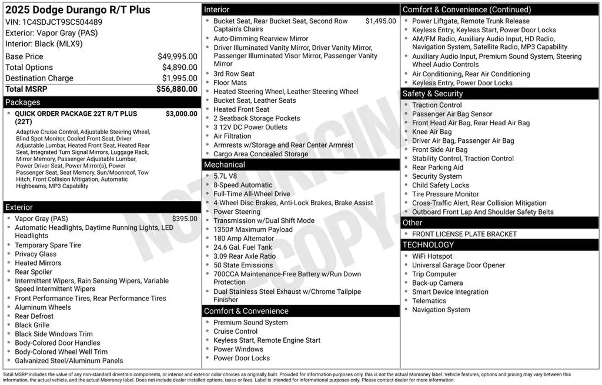 FREE 20 YEAR / 200,000 MILE POWERTRAIN WARRANTY, ONE OWNER, CLEAN CARFAX, AWD ALL WHEEL DRIVE, BLUETOOTH, SIRIUS XM SATELLITE RADIO, UCONNECT, APPLE CARPLAY, GOOGLE ANDROID AUTO, STEERING WHEEL AUDIO CONTROLS, TOUCH SCREEN CONTROLS, BACKUP CAMERA, HOMELINK UNIVERSAL GARAGE DOOR OPENER, KEYLESS PUSH BUTTON START, AUTOMATIC HEADLIGHTS, ADAPTIVE CRUISE CONTROL, POWER DRIVER SEAT, POWER PASSENGER SEAT, HEATED/COOLED LEATHER SEATS, 2ND ROW BUCKETS, 3RD ROW SEAT, SUNROOF/MOONROOF, MEMORY PACKAGE / MEMORY SEAT, REMOTE START, POWER LIFTGATE, HEATED STEERING WHEEL, TOW PACKAGE / TRAILER PACKAGE, INTEGRATED TRAILER BRAKE CONTROLLER, R/T PLUS SERIES, QUICK ORDER PACKAGE 22T R/T, 20 FINE SILVER WHEELS, 3RD ROW SEATS: SPLIT-BENCH, 9 SPEAKERS, AIR CONDITIONING, AUTO HIGH BEAM HEADLAMP CONTROL, AUTO-DIMMING REAR-VIEW MIRROR, AUTOMATIC TEMPERATURE CONTROL, BLIND SPOT W/TRAILER DETECTION, BRAKE ASSIST, COMPASS, DELAY-OFF HEADLIGHTS, DRIVER VANITY MIRROR, DUAL FRONT IMPACT AIRBAGS, DUAL FRONT SIDE IMPACT AIRBAGS, EMERGENCY COMMUNICATION SYSTEM: DODGE CONNECT, FRONT DUAL ZONE A/C, GLOSS BLACK EXTERIOR MIRRORS, HEATED DOOR MIRRORS, LEATHER STEERING WHEEL, LOW TIRE PRESSURE WARNING, OCCUPANT SENSING AIRBAG, OUTSIDE TEMPERATURE DISPLAY, OVERHEAD CONSOLE, PANIC ALARM, PASSENGER VANITY MIRROR, POWER DOOR MIRRORS, POWER WINDOWS, RADIO/DRIVER SEAT/MIRRORS MEMORY, RAIN SENSING WIPERS, REAR AIR CONDITIONING, REAR LOAD LEVELING SUSPENSION, REAR WINDOW DEFROSTER, REAR WINDOW WIPER, REMOTE KEYLESS ENTRY, SECURITY SYSTEM, SPEED-SENSING STEERING, SPEED-SENSITIVE WIPERS, SPOILER, TELESCOPING STEERING WHEEL, TILT STEERING WHEEL, VARIABLY INTERMITTENT WIPERS.