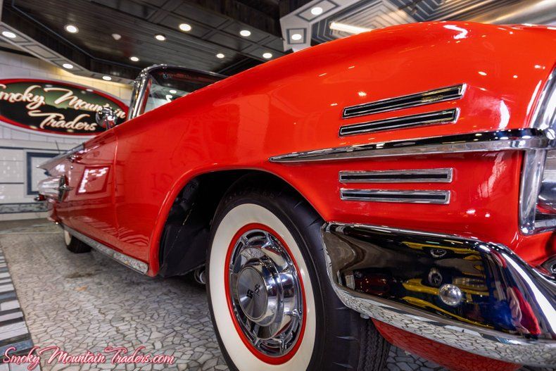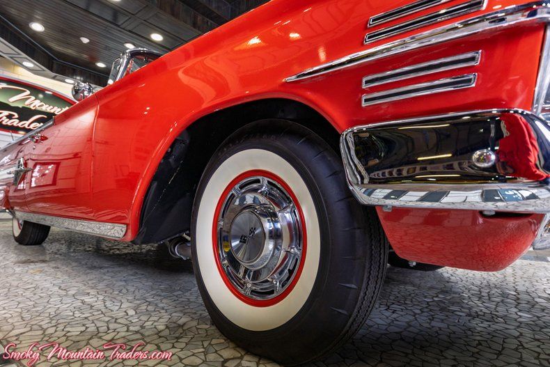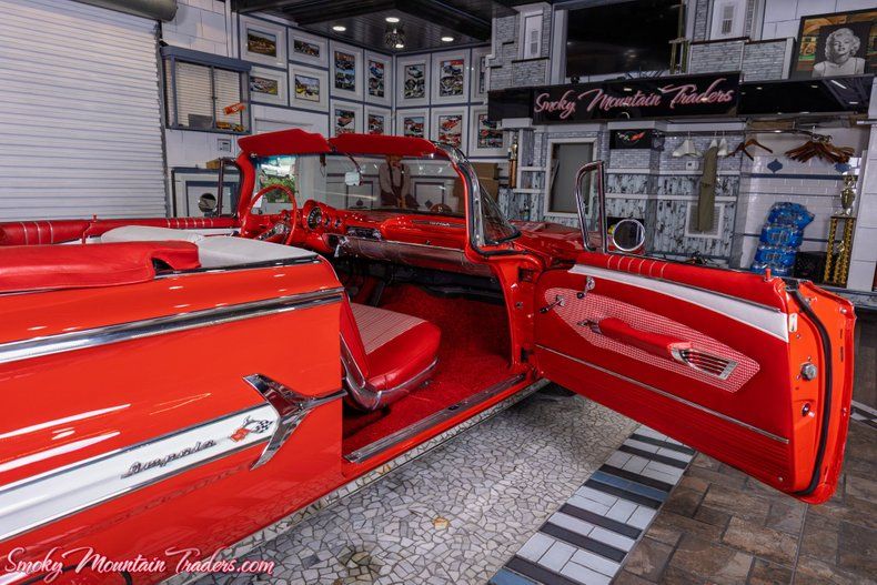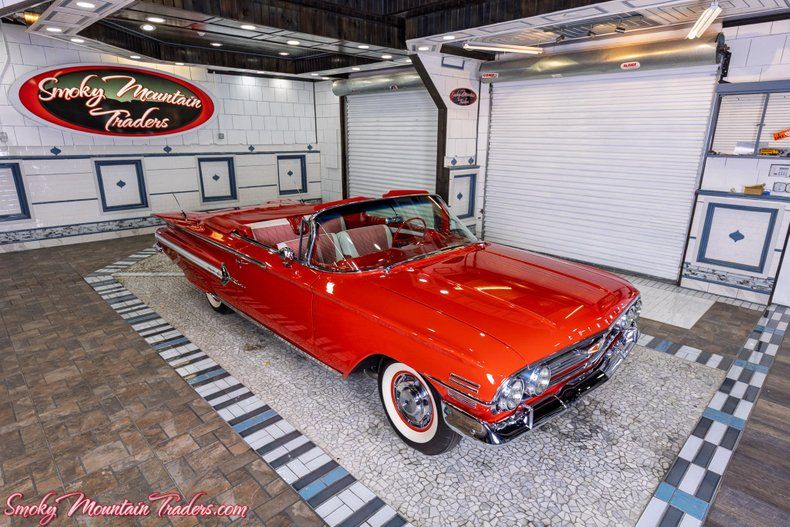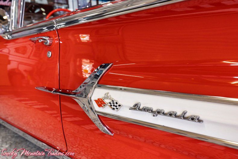 Finished in a dazzling, high-gloss red, this Impala exudes Chevrolet's signature flair from every angle. The body lines are laser-straight, the reflections are deep and clear, and every contour highlights the craftsmanship invested during its frame-off restoration. Chrome components including the dual-headlight grille, bumpers, and sweeping side accents display a show-level shine and exceptional fit. A crisp white convertible top complements the vibrant paint and features a clear rear window, fitting snugly as intended. Factory-style hubcaps paired with wide whitewall tires complete the authentic presentation, reinforcing the period-correct charm that makes this Impala a standout at any show field or cruise event. From its polished trim to its sculpted tailfins, every detail captures the elegance and drama of the 1960 Chevrolet design.