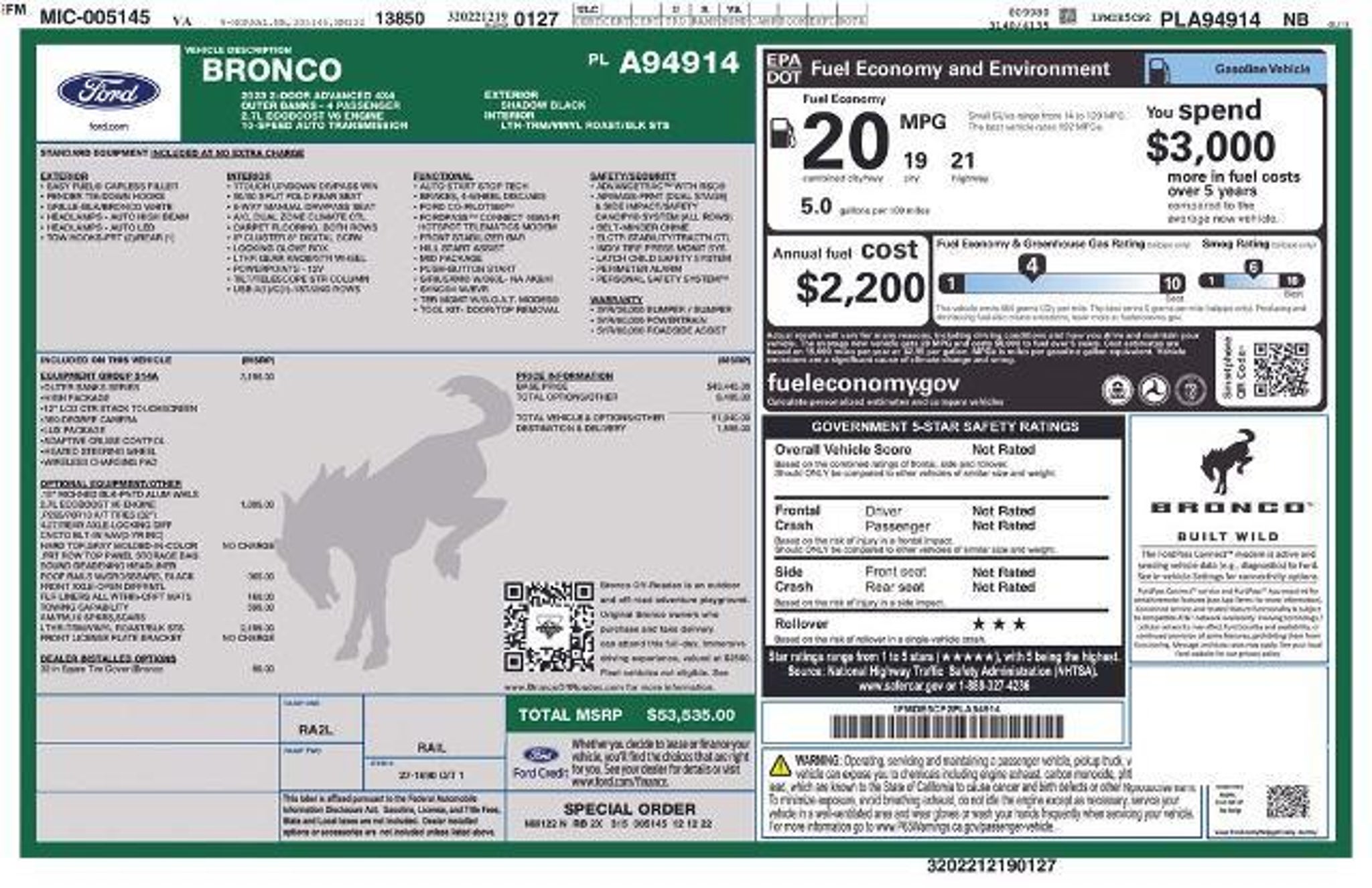 At Green Ford in Greensboro, NC, your peace of mind is everything. We know buying pre-owned is more than just selecting a vehicle"”it's placing your trust in us. That's why every used model on our lot is meticulously inspected, competitively priced, and comes with the comprehensive Green Ford Advantage. You'll enjoy our lifetime limited powertrain warranty, Two complimentary maintenance performed right here by our expert technicians. Need to drop off your vehicle? Take advantage of our complimentary pickup & delivery or Ford Mobile Service, where we'll come to you. At Green Ford, earning your confidence isn't just our goal"”it's the foundation of everything we do. Call today for details. *Local Trade*, GREEN CERTIFIED LIFETIME POWERTRAIN WARRANTY, Hard Top, Leather Trim, GPS, Navigation Sys, Blue Tooth, SYNC 4, 18 Machined Black Painted Alum Wheels, 12 LCD Capacitive Touchscreen w/Swipe Capability, 360-Degree Camera, ABS brakes, AM/FM radio: SiriusXM with 360L, Compass, Electronic Stability Control, Exterior Parking Camera Rear, Front Parking Sensors, Heated door mirrors, Heated Steering Wheel, Illuminated entry, Low tire pressure warning, Remote keyless entry, Traction control. 2023 Ford Bronco Priced below KBB Fair Purchase Price! 2023 Ford Bronco Outer Banks Shadow Black Equipped with Equipment Group 313A High Package (12 LCD Capacitive Touchscreen w/Swipe Capability, 360-Degree Camera, Front Parking Sensors, Additional Sound Deadening, Information on Demand Panel, and Sideview Mirrors), Equipment Group 314A Lux Package (Heated Steering Wheel, 2 Smart Charging USB Ports In Dashboard, Adaptive Cruise Control, Evasive Steering Assist, Radio: B&O Sound System by Bang & Olufsen, Universal Garage Door Opener, and Wireless Charging Pad), ABS brakes, AM/FM radio: SiriusXM with 360L, Compass, Electronic Stability Control, Exterior Parking Camera Rear, Heated door mirrors, Illuminated entry, Low tire pressure warning, Remote keyless entry, Traction control, 4-Wheel Disc Brakes, 7 Speakers, Air Conditioning, AM/FM Stereo, Auto High-beam Headlights, Brake assist, Convertible HardTop, Convertible roof lining, Delay-off headlights, Driver door bin, Driver vanity mirror, Dual front impact airbags, Dual front side impact airbags, Emergency communication system: 911 Assist, Front anti-roll bar, Front Bucket Seats, Front Center Armrest, Front reading lights, Front wheel independent suspension, Fully automatic headlights, Glass rear window, Integrated roll-over protection, Occupant sensing airbag, Outside temperature display, Overhead airbag, Overhead console, Panic alarm, Passenger door bin, Passenger vanity mirror, Power door mirrors, Power steering, Power windows, Radio data system, Rear window defroster, Rear window wiper, Security system, SiriusXM Radio w/360L, Speed control, Split folding rear seat, Steering wheel mounted audio controls, SYNC 4, Tachometer, Telescoping steering wheel, Tilt steering wheel, Trip computer, and Variably intermittent wipers *Vehicle must be 8 model years or newer and Under 80,000 miles to qualify for the Lifetime Powertrain Warranty, also excludes Commercial Sales, European Makes, Diesels, Modified and SVT vehicles. The price displayed is an internet only price. To obtain this sale price you must print out this ad and present it to the sales professional when you arrive at the dealership. All Green Ford/Lincon internet Prices include a $1000.00 discount for financing with Lincoln Financial or Ford Credit Services. To obtain this discount your credit must qualify for Lincoln Financial or Ford Credit Services Financing.Prices also include trade discount of $1000, to obtain this discount you must trade in a 2018 or newer vehicle with less than 100,000 miles.