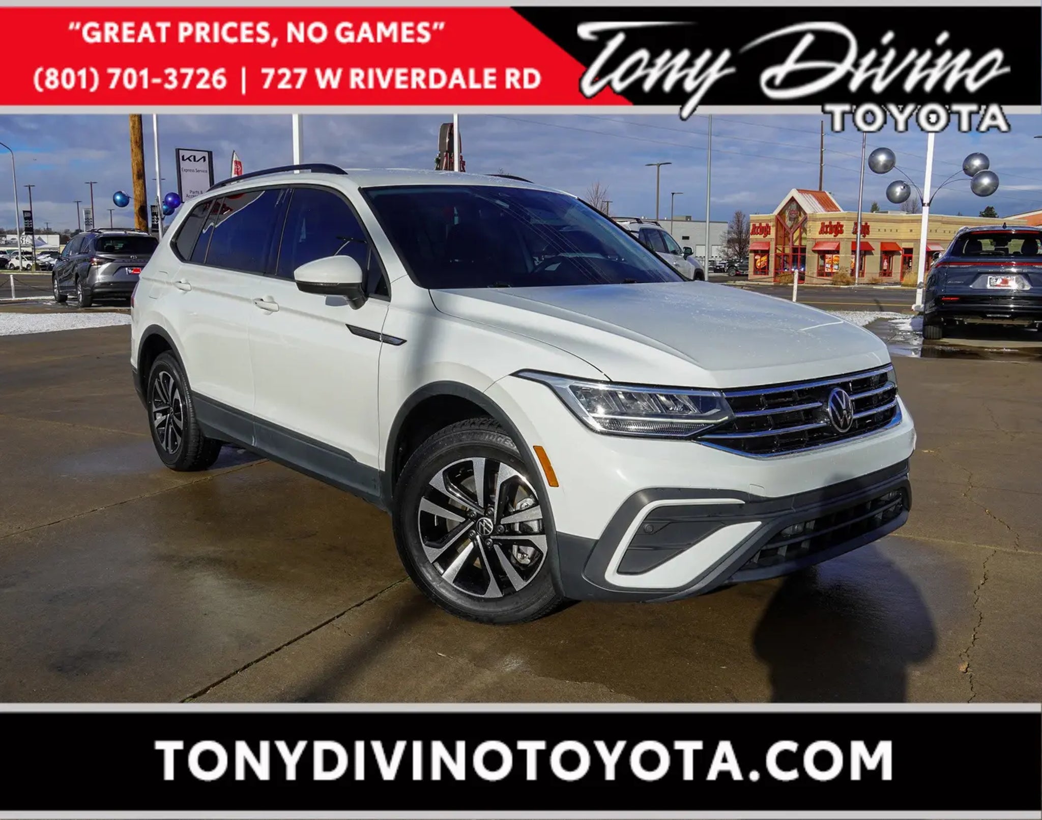 Delivers 31 Highway MPG and 24 City MPG! This Volkswagen Tiguan boasts a Intercooled Turbo Regular Unleaded I-4 2.0 L/121 engine powering this Automatic transmission. Wireless Phone Connectivity, Window Grid And Roof Mount Diversity Antenna, Wheels w/Locks. This Volkswagen Tiguan Comes Equipped with These Options Variable Intermittent Wipers w/Heated Jets, Trip Computer, Transmission: 8-Speed Automatic w/Tiptronic, Transmission w/Oil Cooler, Tires: 17 All-Season, Tailgate/Rear Door Lock Included w/Power Door Locks, Strut Front Suspension w/Coil Springs, Streaming Audio, Steel Spare Wheel, Smart Device Integration. Stop By Today For a must-own Volkswagen Tiguan come see us at Tony Divino Toyota|777 West Riverdale Rd, Riverdale, UT 84405. Just minutes away! * Estimated Monthly Payment will depend on vehicle make and model and will be determined upon actual vehicle inspection. All payments are estimates. Tax, title, registration and documentation fee ($349) are extra.* While every reasonable effort is made to ensure the accuracy of this information, we are not responsible for any errors or omissions contained on these pages. Please verify any information in question with Tony Divino Toyota.