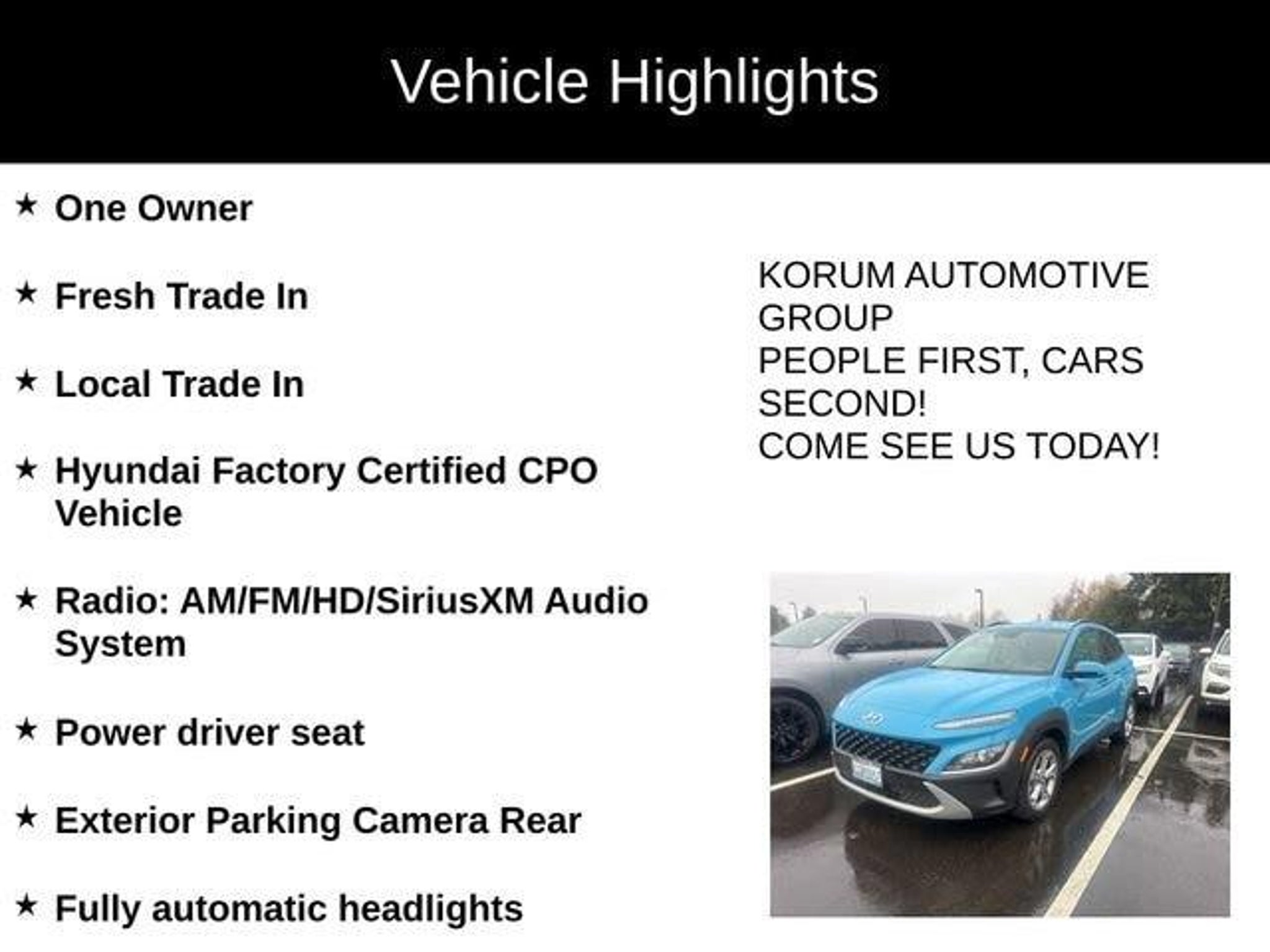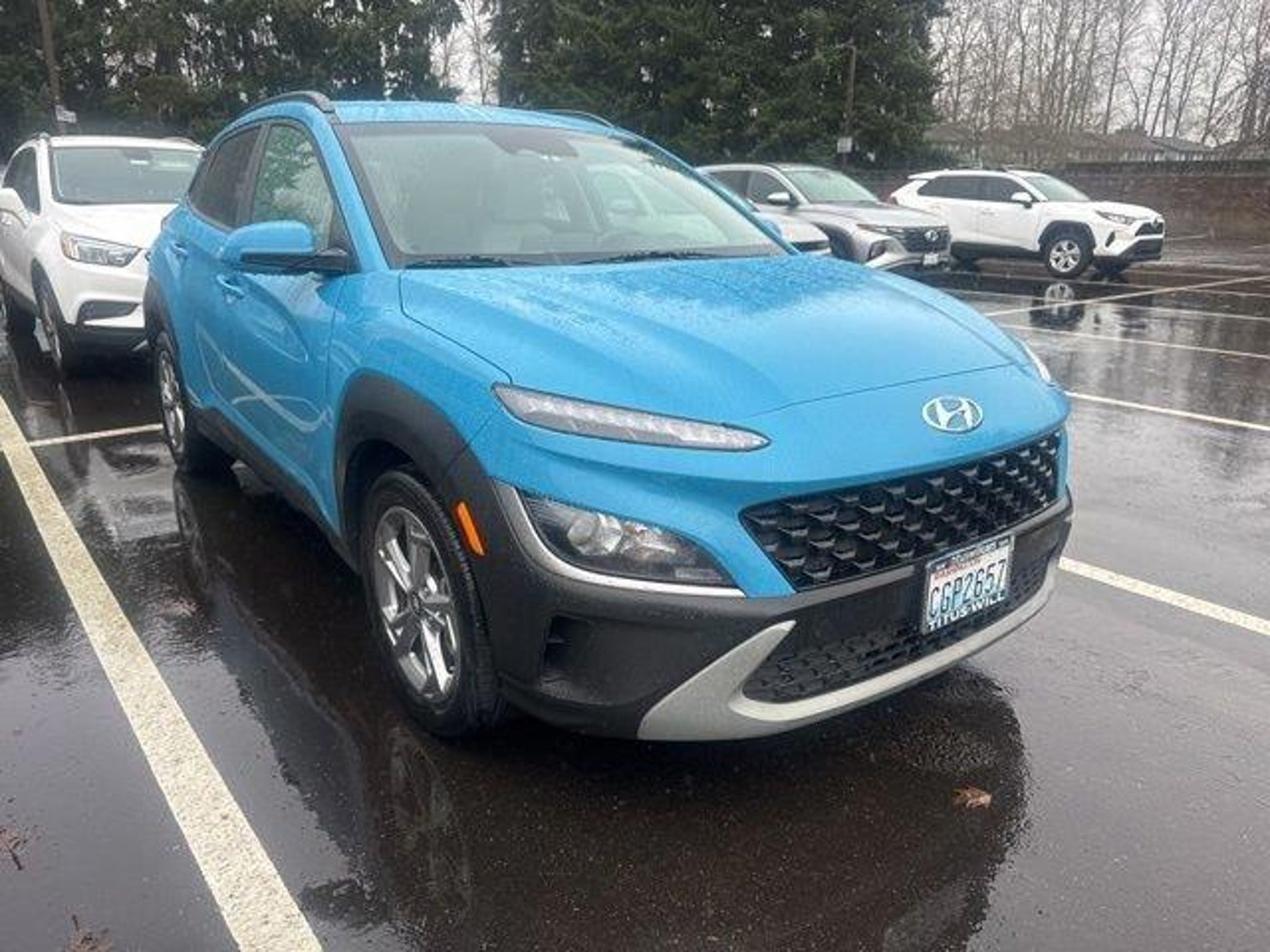 Certified. One Owner, Fresh Trade In, Local Trade In, Hyundai Factory Certified CPO Vehicle, Kona SEL, 4D Sport Utility, 2.0L I4 DOHC Dual CVVT, CVT, AWD, Teal Isle, Gray Cloth, Apple CarPlay & Android Auto, Exterior Parking Camera Rear, Fully automatic headlights, Power driver seat, Radio: AM/FM/HD/SiriusXM Audio System. 28/33 City/Highway MPGHyundai Certified Used Vehicles Details: * Limited Warranty: 60 Month/60,000 Mile (whichever comes first) from original in-service date * Roadside Assistance * Vehicle History * 173 Point Inspection * Includes 10-year/Unlimited Mileage Roadside Assistance with Rental Car and Trip Interruption Reimbursement; Please See Dealers for Specific Vehicle Eligibility Requirements. 10-Year/100,000 Mile Hybrid/EV Battery Warranty. 3-Months SiriusXM Trial Subscription. Complimentary 1 Year (Connected Care & Remote Pkgs). * Warranty Deductible: $50 * Powertrain Limited Warranty: 120 Month/100,000 Mile (whichever comes first) from original in-service date2023 Hyundai Kona Teal Isle SEL 2.0L I4 DOHC Dual CVVTAt Korum, we provide our customers with real-time value pricing on every vehicle. How? We poll over 70,000 websites hourly to ensure our customers receive the BEST PRICES. We will never inflate vehicle prices or play pricing games as a part of our negotiation strategy with our customers.Located at the corner of River Road and Meridian in downtown Puyallup, WA, we have a large selection of cars, trucks and SUVs. Shop our huge selection of vehicles online or come visit us and take a test drive today. Limitations and exclusions apply. Any vehicle used for business or commercial purposes does not qualify. See dealer for complete details. Customer is responsible for sales tax, title, and license fee. A negotiable $200 documentation fee may be applied. Photos for illustration purposes only.