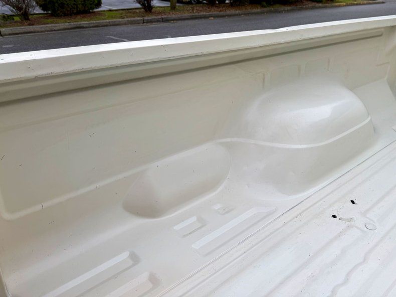 The exterior of this truck is finished in white with distinctive blue side stripes, showcasing its classic 1990s style. The body is Describe the body condition - e. g., straight with minimal rust, showing some signs of wear, etc.. It features chrome bumpers, aluminum wheels, black plastic trim, and running boards. Mention the condition of the aluminum wheels, if they are original or aftermarket, and any flaws. The Bed condition - e. g., bed is clean, bed has a bedliner, bed shows signs of use. The tires are Describe tires - e. g., in good condition, recently replaced, with XX% tread remaining. Mention any specific exterior flaws - e. g., minor dings, small rust spots, paint imperfections.