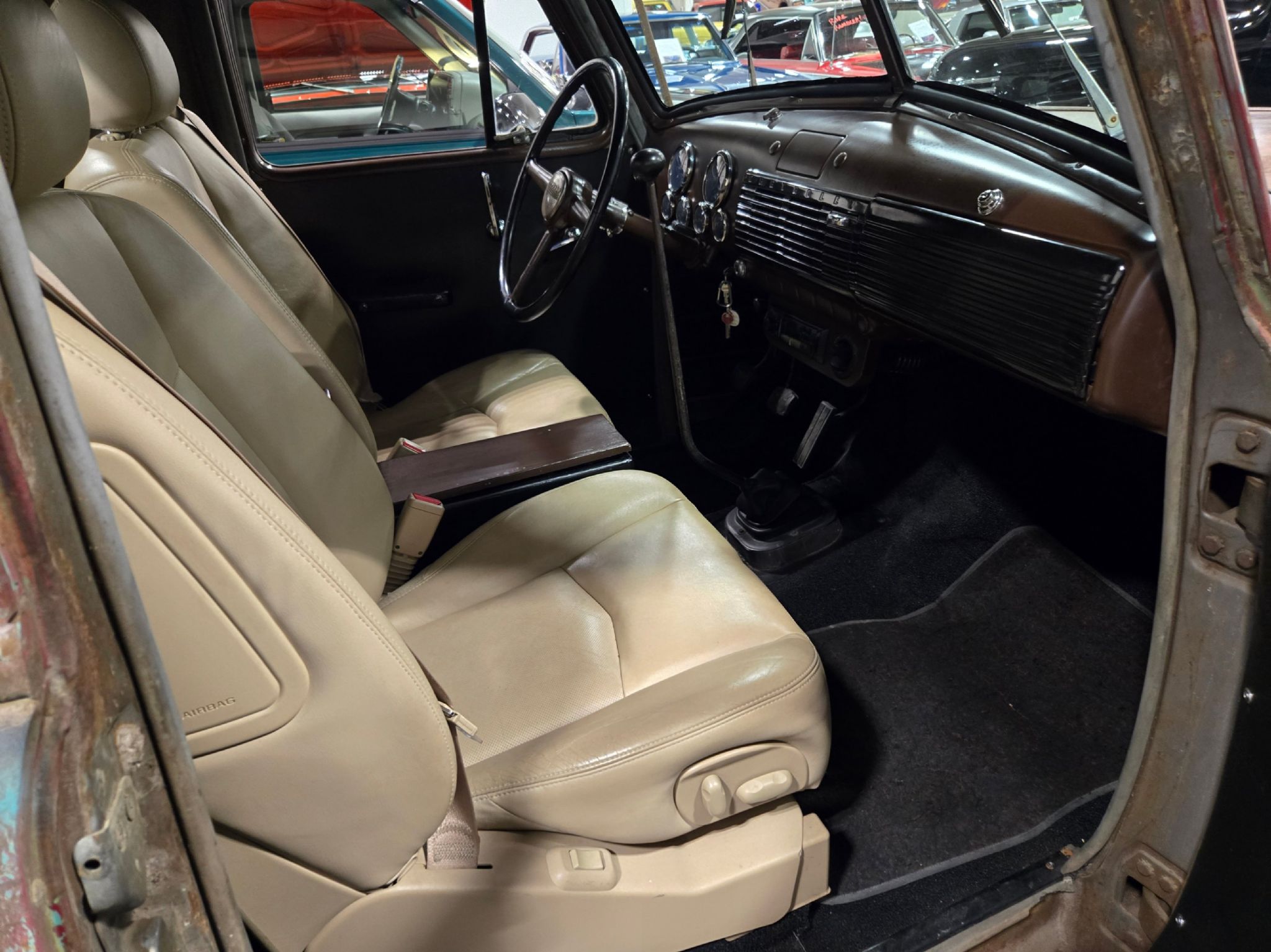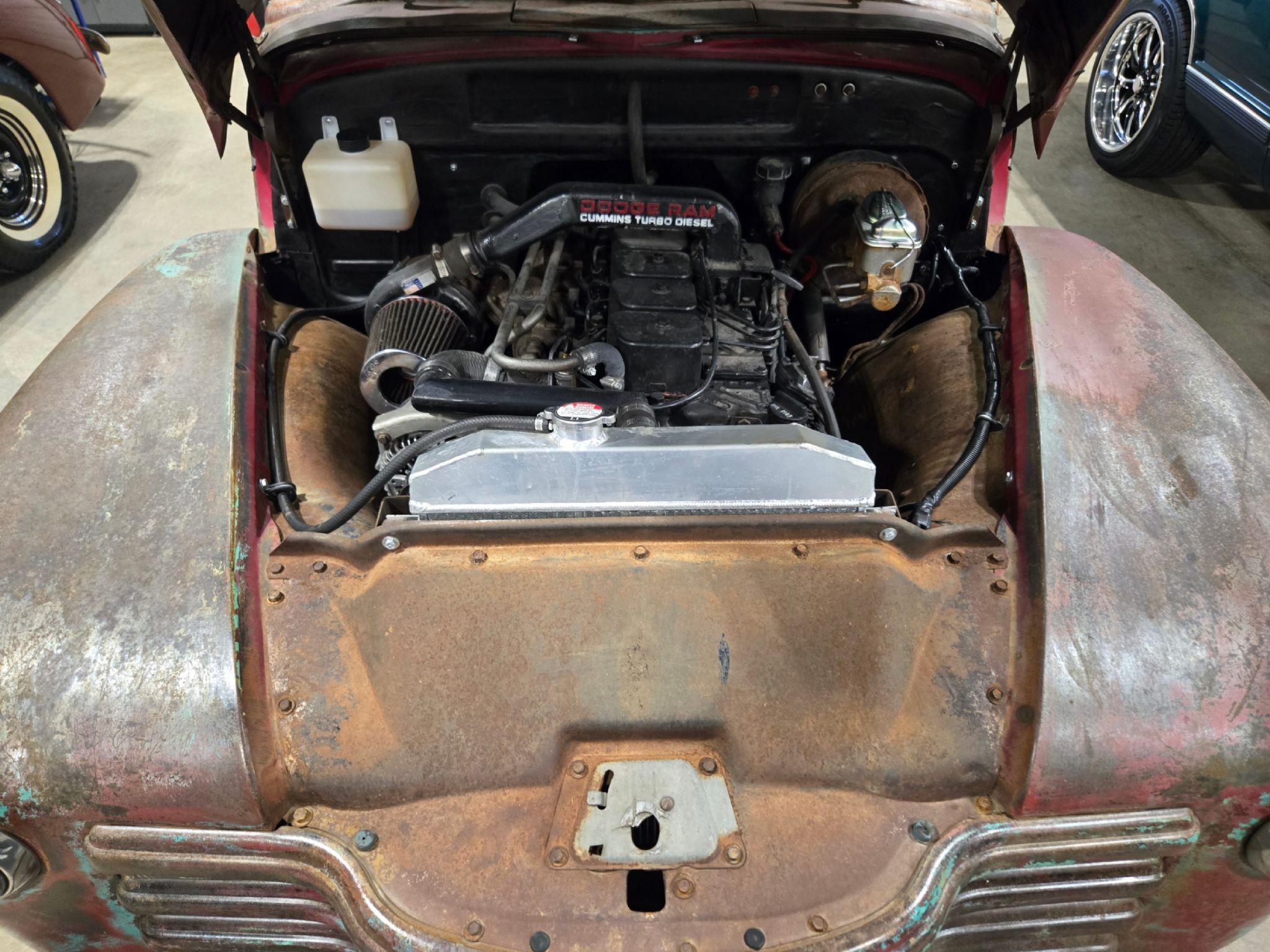 1951 Chevrolet 1500 custom. Riding on a 95 Chevrolet 1-ton 2WD dually frame with a 5.9-liter Cummins 12 valve under the hood backed by a rebuilt 5-speed manual transmission with a new clutch. To make it all work, the diff was shortened and the box and tailgate were widened 10 inches. The box is actually wedge shaped now, wider at the rear than the front with wheel tubs to accommodate the dual rear tires, but it all looks very cool. The frame has custom square tubing with 4-link suspension that all starts just behind the cab. It rides on air now too! New wiring and gauges, stereo, leather bucket seats, console and carpets. New exhaust, aluminum rad and running dual batteries. Great patina on the entire truck. Definitely a heavy hauler that could double as a Cars and Coffee showstopper and tow-rig all in one! Runs fantastically and drives very well. We will likely install a new steering column with tilt and a more averaged size wheel to better accommodate taller drivers if we get the chance. The factory sized wheel is rather large for the cabin size and unnecessary now that theres power steering. Dual leather power seats work and theres a modern stereo too. Milage is unknown. Diff cover with tow ball in the bed is just for show, and accommodates the real differential when air is let out of the rear bags.