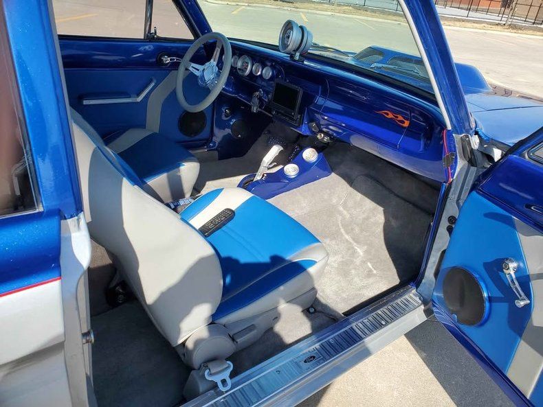 CONDITION This 1964 Ford Falcon is listed with 13,000 miles and is located in Boone, Iowa. It is powered by a 306 V8 and paired with an automatic transmission, including a C-4 automatic with a B&M floor shifter and manual valve body. The car is equipped with a B&M supercharger, a 9-inch rear end with 3.50 gears, Colorado Custom wheels, Viking coil over shocks, Auto Meter gauges, and an upgraded stereo system. The listing notes gasoline fuel and 2 owners, and states the vehicle is paid off. The exterior color is listed as silver, and the photos show a custom two-tone scheme with a blue upper section and silver body, accented by flame graphics. The interior is listed as grey/gray, and photos show a custom two-tone blue and gray interior. Paint is described as an 8 out of 10.