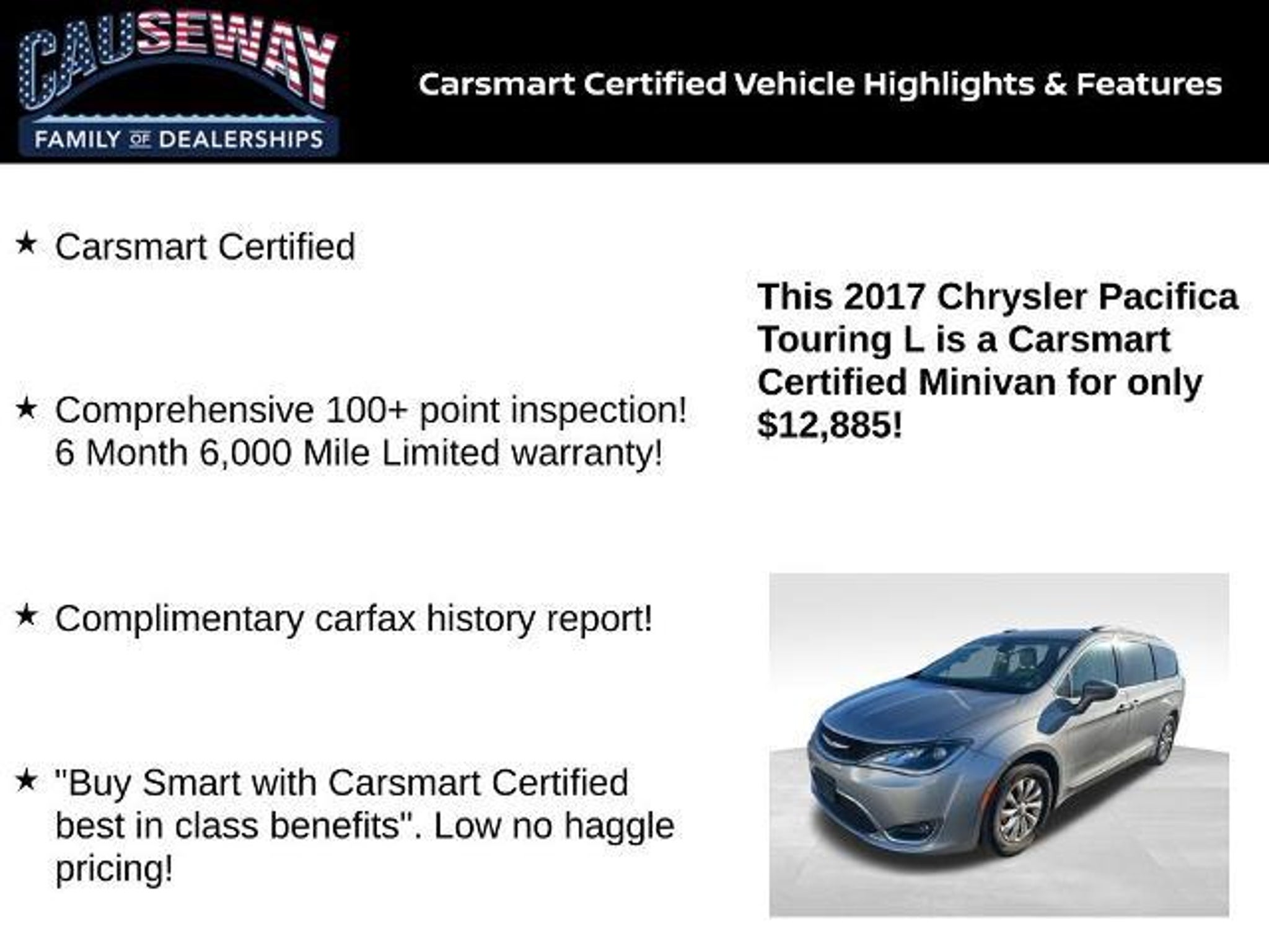 2017 Chrysler Pacifica Touring L Billet Silver Metallic Clearcoat FWD 9-Speed Automatic 3.6L V6 24V VVT Carsmart Certified, Comprehensive 100 point inspection! 6 Month 6,000 Mile Limited warranty!, Complimentary carfax history report!, Buy Smart with Carsmart Certified best in class benefits. Low no haggle pricing!. 19/28 City/Highway MPG Certification Program Details: 6 month/6000 mile warranty, powertrain 100 point inspection, Free Carfax history report, available Extended Protection! Ask us how you can make money using our Causeway Referral Rewards Program!