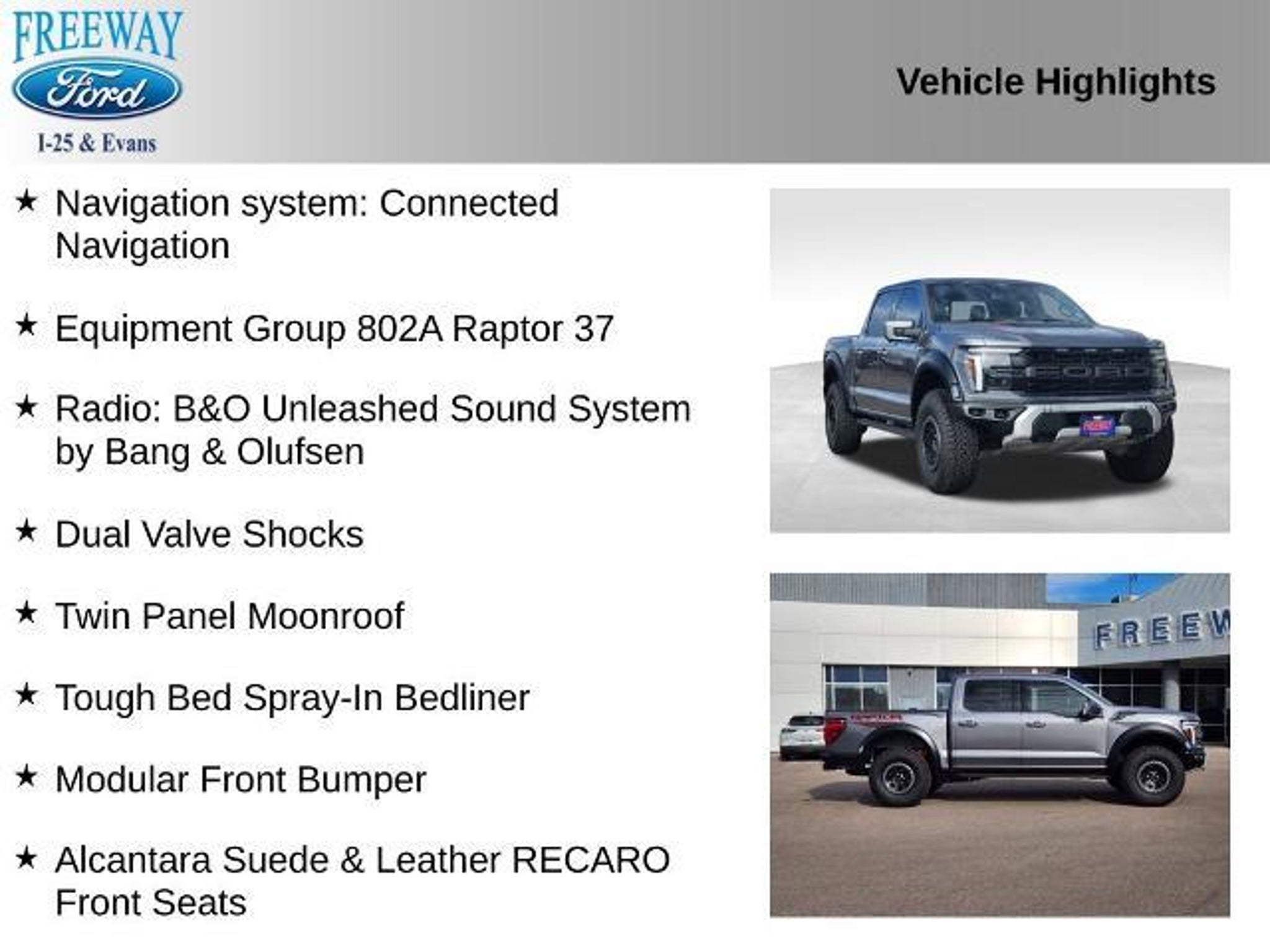 Discover the Ultimate Driving Experience with the 2024 Ford F-150 Raptor 37 package! $94095.00 MSRP Unleash your adventurous spirit and conquer the road like never before in the all-new 2024 Ford F-150 Raptor. This exceptional off-road beast is designed to push the boundaries of performance and capability, delivering an unparalleled driving experience that will leave you exhilarated and inspired. â Equipment Group 802A Raptor 37, including Dual Valve Shocks, Wheels: Raptor 37 Unique 17 Cast Aluminum, Bead lock capable, Carbon Fiber Interior Appliques, Modular Front Bumper, Tires: 37x12.5R17 BSW All-Terrain, and GVWR: 7,400 lbs â Twin Panel Moonroof â Tough Bed Spray-In Bedliner Powered by a 3.5L V6 EcoBoost engine and paired with a 10-Speed Automatic transmission, the 2024 Raptor delivers exceptional power and efficiency, with a city fuel economy of 14 MPG and a highway rating of 18 MPG. This formidable combination ensures you can conquer any terrain with confidence, whether you're tackling rugged off-road adventures or navigating the daily commute. Manufacture Buyback RAV:TRAN:RP GSM Elevate your driving experience with the Raptor's impressive array of premium features, including a state-of-the-art navigation system, a premium B&O Unleashed Sound System by Bang & Olufsen, and Alcantara Suede & Leather RECARO Front Seats that provide unparalleled comfort and support. The Raptor's advanced technology also includes a Heads-Up Display, SYNC 4 with Enhanced Voice Recognition, and a suite of driver-assistance features like Lane Departure Warning System and Auto High-beam Headlights, ensuring your journey is not only thrilling but also safe and effortless. Designed to inspire and captivate, the 2024 Ford F-150 Raptor is a true masterpiece of engineering and innovation. Its bold, aggressive styling and rugged capabilities make it the ultimate choice for those who demand the very best in off-road performance and luxury. Experience the difference for yourself and schedule a test drive today. We're confident that once you get behind the wheel of the 2024 Raptor, you'll never want to settle for anything less.