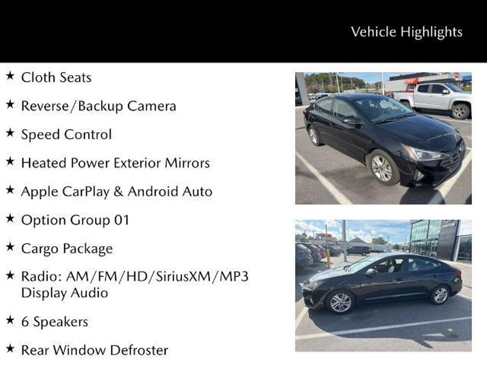 Efficient, practical, and easy to enjoy every day, this 2019 Hyundai Elantra SEL with 118,725 miles and VIN 5NPD84LF2KH403579 offers a comfortable and user-friendly driving experience that?s well suited for commuting and daily errands. The interior features cloth seating with a clean, functional layout, along with a 6-speaker audio system that delivers clear sound throughout the cabin. A backup camera adds confidence when parking and maneuvering, while cruise control makes longer drives more relaxed. Remote keyless entry provides everyday convenience, letting you get on the road quickly and easily. With its efficient design, straightforward technology, and comfortable ride, this 2019 Elantra SEL is a solid choice for drivers looking for dependable transportation with the right mix of comfort and practicality. Cloth Seats, Reverse/Backup Camera, 172 Point Inspection completed by our Factory Certified & ASC Trained Technicians, Recent Oil Change, Vehicle Detailed, Speed Control, Heated Power Exterior Mirrors, Apple CarPlay & Android Auto, 16 x 6.5 Alloy Wheels, 6 Speakers, Air Conditioning, Cargo Package, Option Group 01, Power Windows, Radio: AM/FM/HD/SiriusXM/MP3 Display Audio, Rear Window Defroster, Remote Keyless Entry. Savannah, GA ? J.C. Lewis Mazda Smart Choices Start Here At J.C. Lewis Mazda, we know today?s drivers are informed, connected, and always looking for smart value. That?s why we include over 20 high-resolution photos and a full walkaround video with every vehicle ? so you can evaluate the details before ever stepping on the lot. Whether you?re a tech-forward professional, a college student, or simply someone who appreciates smart engineering, Mazda delivers the perfect balance of innovation, efficiency, and driving enjoyment. We?ll gladly provide a complimentary AutoCheck or CARFAX report for full transparency. Visit us at 10101 Abercorn St in Savannah, GA or call (912) 299-3862 ? and experience a dealership that?s as forward-thinking as you are.