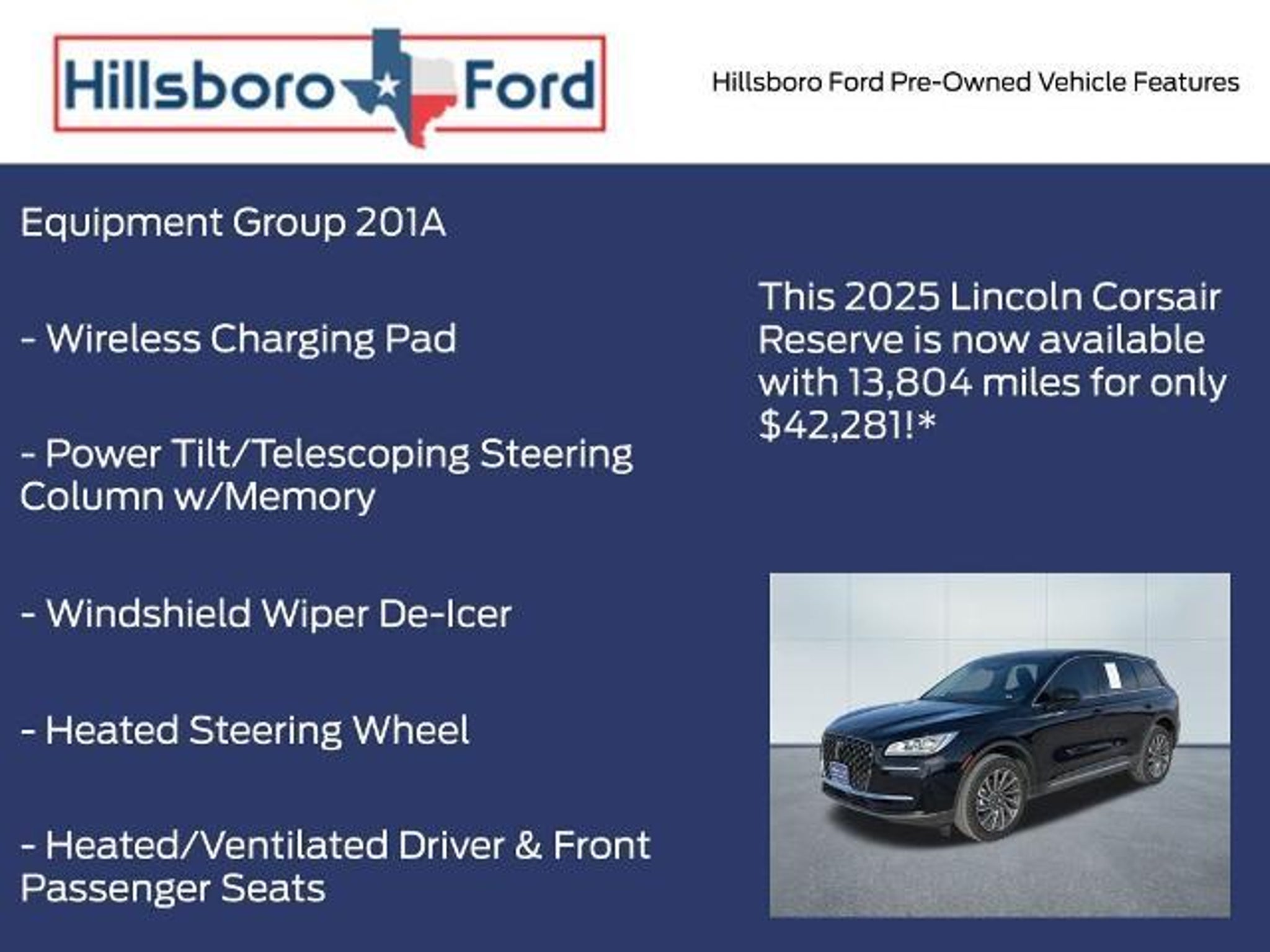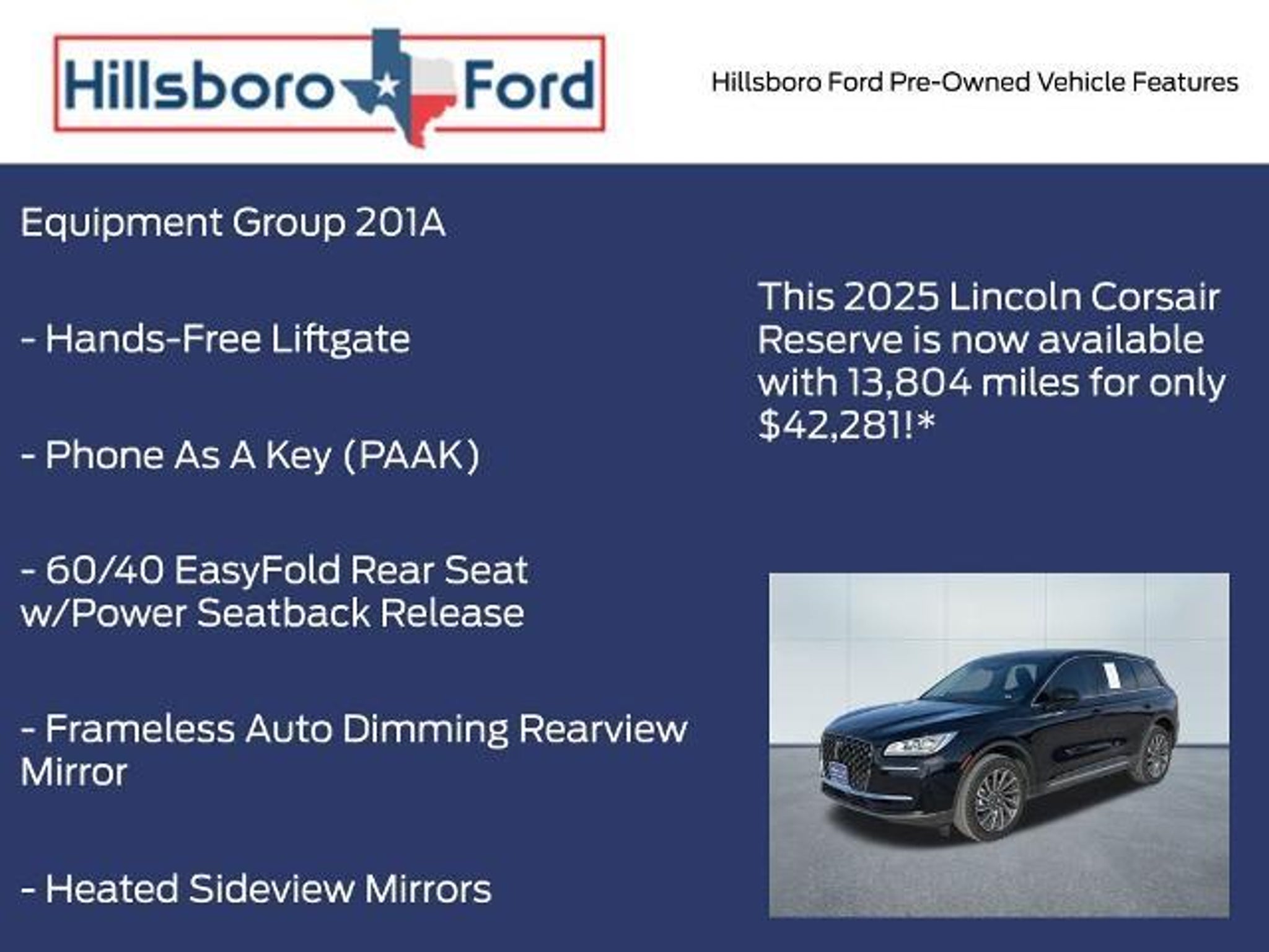 Our 2025 Lincoln Corsair Reserve AWD in Infinite Black is crafted to anticipate your every need, blending intelligent luxury, refined performance, and advanced technology for a seamless driving experience. Motivated by a TurboCharged 2.0 Liter 4 Cylinder serving up 250hp to a paddle-shifted 8 Speed Automatic transmission. You can enjoy Lincoln Drive Modes for tailored performance, and this All Wheel Drive SUV achieves nearly 28mpg on the highway. Lean and luxurious, our Lincoln Corsair looks great with jeweled LED headlamps, a power liftgate, polished dual exhaust tips, roof rails, Embrace welcome lighting, and 19-inch alloy wheels. Our Reserve cabin is smartly crafted and impressively quiet, treating you to heated leather power front seats, a leather-wrapped steering wheel, dual-zone automatic climate control, remote start, keyless access/ignition, and symphonic chimes. They sound especially refined through the premium nine-speaker sound system that complements a 12.3-inch driver display, a 13.2-inch touchscreen, connected navigation, wireless Android Auto/Apple CarPlay, Bluetooth, WiFi compatibility, and voice recognition. The long list of Lincoln safety systems includes automatic braking, forward collision warning, a rearview camera, adaptive BlueCruise, a blind-spot monitor, lane-keeping assistance, and other smart technologies. Enjoy a revitalizing ownership experience in our Lincoln Corsair Reserve! Save this Page and Call for Availability. We Know You Will Enjoy Your Hillsboro Ford Test Drive Towards Ownership! Clean CARFAX. CARFAX One-Owner. Infinite Black Metallic Clearcoat 2025 Lincoln Corsair Reserve AWD 8-Speed Automatic 2.0L I4 2 Additional USB Ports in Rear of Center Console, 60/40 EasyFold Rear Seat w/Power Seatback Release, Equipment Group 201A, Frameless Auto Dimming Rearview Mirror, Hands-Free Liftgate, Heated Sideview Mirrors, Heated Steering Wheel, Heated/Ventilated Driver & Front Passenger Seats, Navigation system: Connected Navigation (4-year trial), Phone As A Key (PAAK), Power Tilt/Telescoping Steering Column w/Memory, Rain Sensing Wipers, Universal Garage Door Opener, Windshield Wiper De-Icer, Wireless Charging Pad. Hillsboro Ford is conveniently located on the frontage road of Interstate 35 and only 30 miles South of Waxahachie and 30 miles North of Waco. It takes less than 30 minutes to drive to our dealership from Whitney, Midlothian and Cleburne. Make the short trip to buy your new 2025 Lincoln Corsair Reserve today and have it parked in your driveway tonight! 21/28 City/Highway MPG Hillsboro Ford has been in operation since the 1930s. Visit us today and find out for yourself why our reputation has stood the test of time. Our expert sales, service and parts personnel are standing by and waiting to assist you. Drive the short country mile down the road to Hillsboro Ford today. Find out for yourself why our neighbors in Waco, Waxahachie, Whitney, Cleburne and Midlothian have been shopping with us for years. Your new 2025 Lincoln Corsair Reserve is waiting for you. Vehicle may have an additional $1,495 in dealer adds, see dealer and addendum for details.