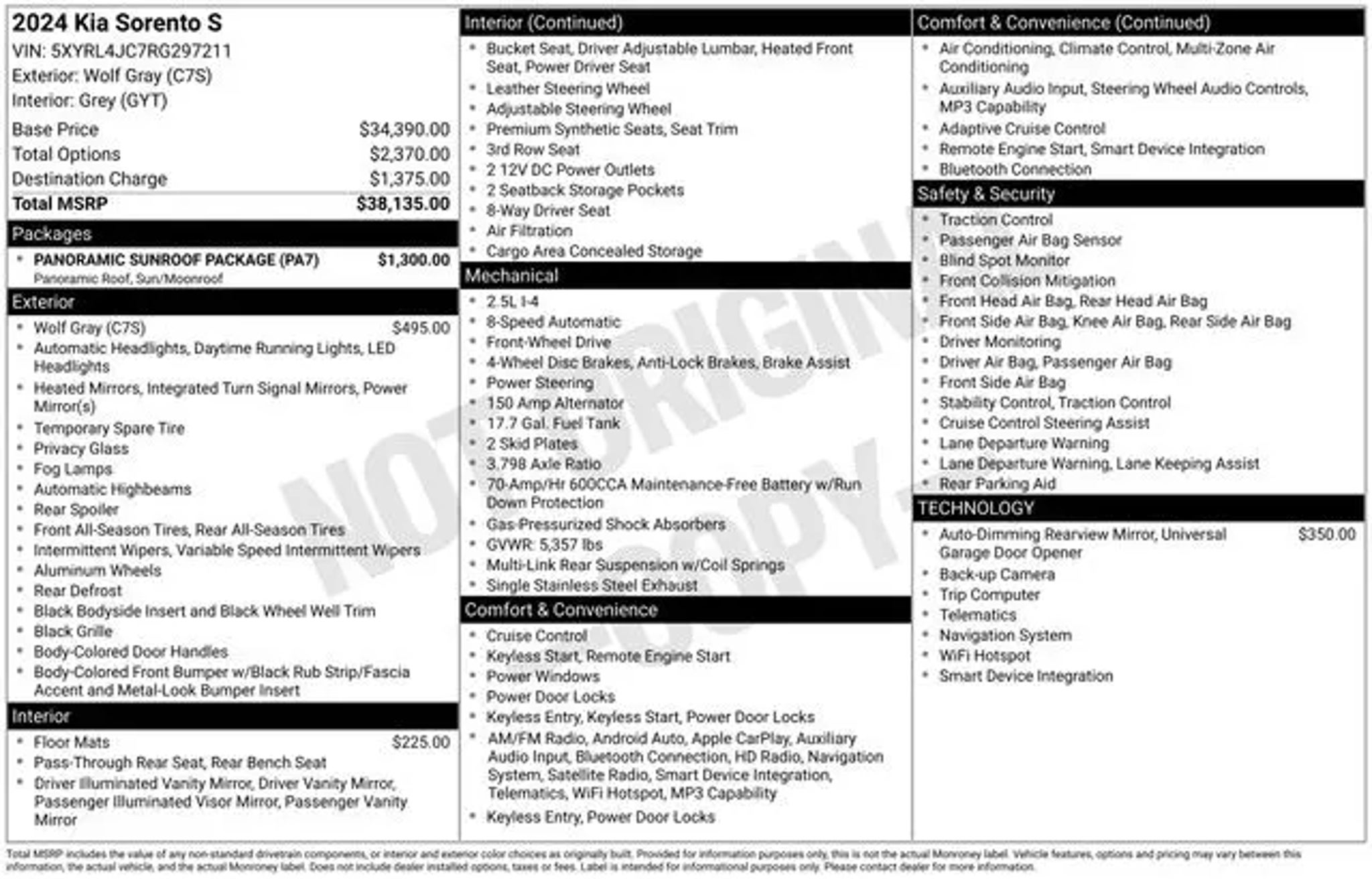 The 2024 Kia Sorento S is a remarkable SUV that combines style, performance, and advanced technology to elevate your driving experience. With its sleek exterior, spacious interior, and impressive list of features, this Sorento is the perfect companion for your adventures. "¢ One Owner "¢ Clean CARFAX, No Accidents Reported "¢ Apple CarPlay/Android Auto "¢ Bluetooth Hands-Free Cell Phone "¢ Heated Leather Seats "¢ Power Driver's Seat "¢ Blind-Spot Collision Monitor "¢ Forward Collision Alert "¢ Rear Cross-Traffic Alert "¢ Lane Departure/Keep Assist "¢ Rear Back-Up Camera The Sorento's 2.5L I4 engine delivers a spirited 191 horsepower, mated to an 8-speed automatic transmission for smooth, efficient power delivery. With an impressive 23 city/31 highway MPG, this SUV strikes the perfect balance between performance and fuel economy. The available Panoramic Sunroof Package adds an extra touch of luxury, flooding the cabin with natural light and creating an open, airy atmosphere. Complemented by the sleek Wolf Gray exterior and Gray interior, this Sorento exudes a sophisticated and modern aesthetic. Inside, the Sorento's spacious and well-appointed cabin offers ample room for you and your passengers. Heated leather seats, a power driver's seat, and a range of advanced technology features, including a state-of-the-art infotainment system with Apple CarPlay and Android Auto, ensure a comfortable and connected driving experience. Safety is also a top priority, with the Sorento featuring a comprehensive suite of driver-assist technologies. Blind-Spot Collision Monitor, Forward Collision Alert, Rear Cross-Traffic Alert, and Lane Departure/Keep Assist work together to help keep you and your loved ones secure on the road. Whether you're commuting, embarking on a road trip, or tackling your daily errands, the 2024 Kia Sorento S is the perfect companion. With its impressive blend of style, performance, and technology, this SUV is sure to exceed your expectations. At George Moore Chevrolet, we offer Transparent pricing, and a 5 star shopping experience, visit us online at or call us at .