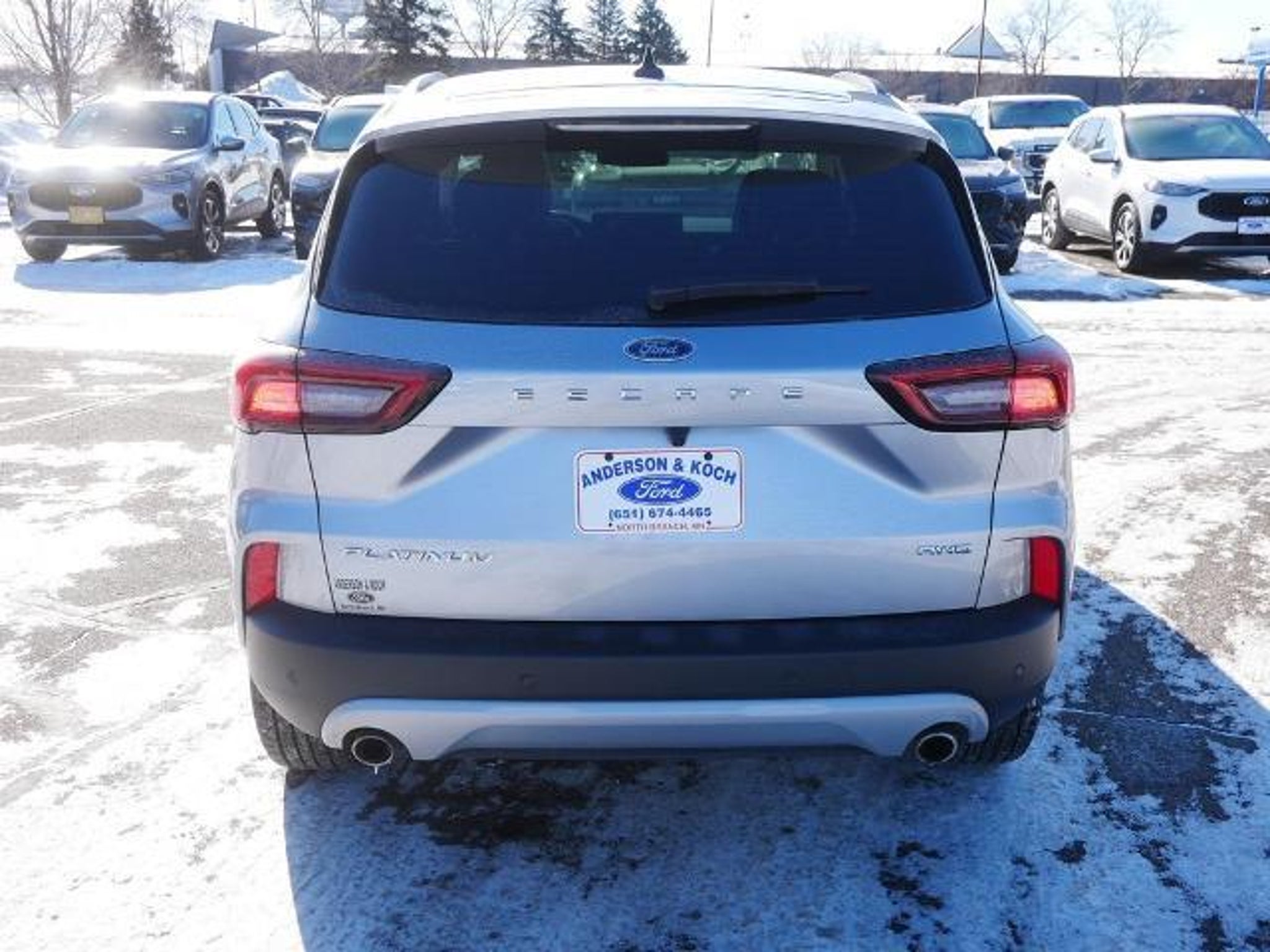 Certified. 2024 Silver Ford Escape Platinum EcoBoost 2.0L I4 GTDi DOHC Turbocharged VCT AWD 23/31 City/Highway MPG Ford Gold Certified Details: * Transferable Warranty * Powertrain Limited Warranty: 84 Month/100,000 Mile (whichever comes first) from original in-service date * Limited Warranty: 12 Month/12,000 Mile (whichever comes first) after new car warranty expires or from certified purchase date * Roadside Assistance * and 22,000 FordPass Rewards Points to use toward first two maintenance visits * Warranty Deductible: $100 * 172 Point Inspection * Vehicle History Anderson & Koch Ford is conveniently located just outside of the Twin Cities in North Branch, MN. We have earned Ford Motor Company's highest honor for six consecutive years, The President's Award. From the moment you walk into our showroom, you'll know our commitment to Customer Service is second to none. We are looking forward to working with you! Call 651-674-4465 for more details!