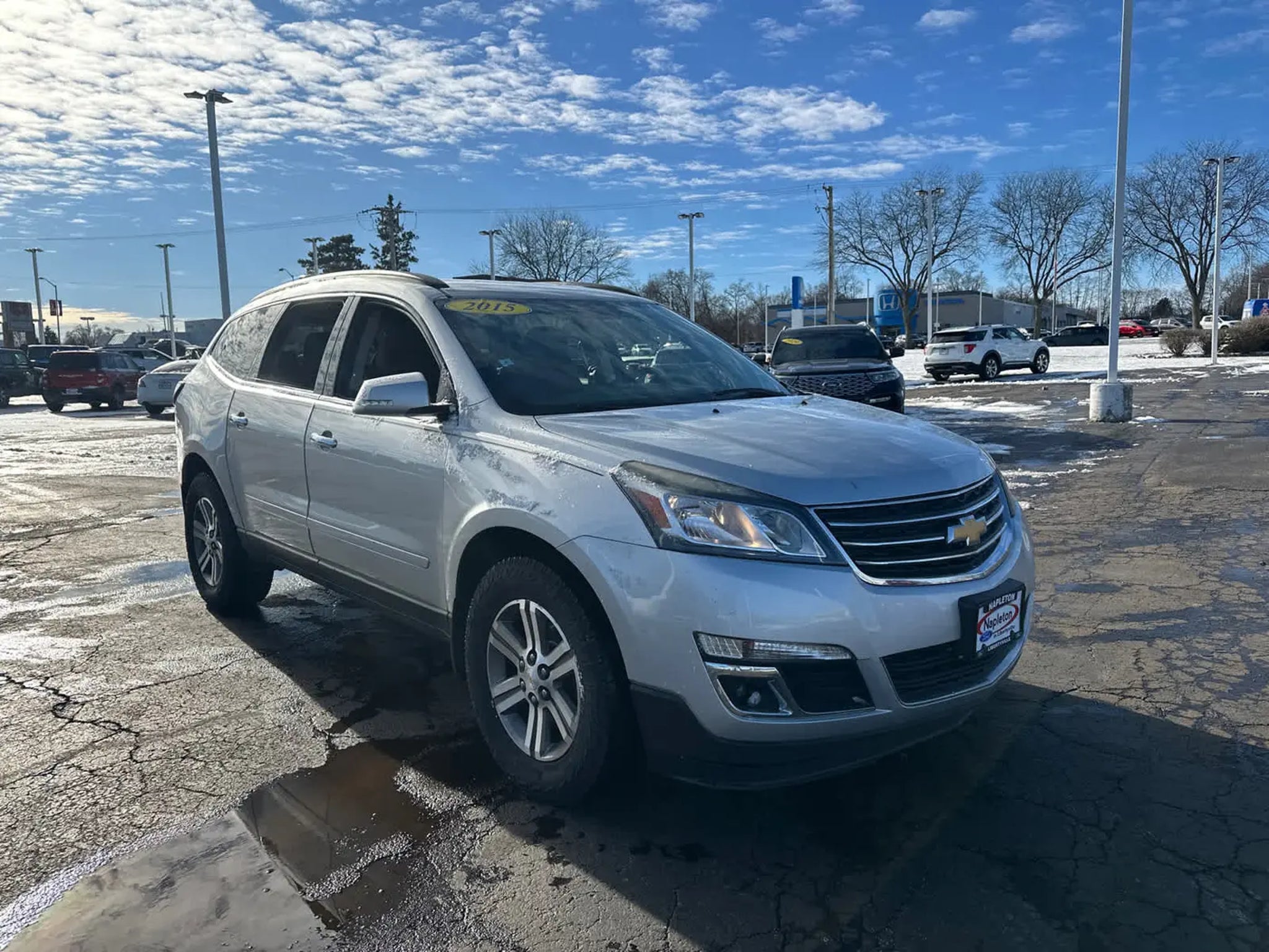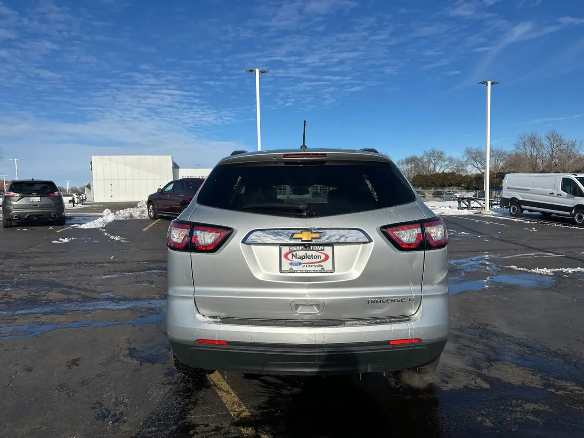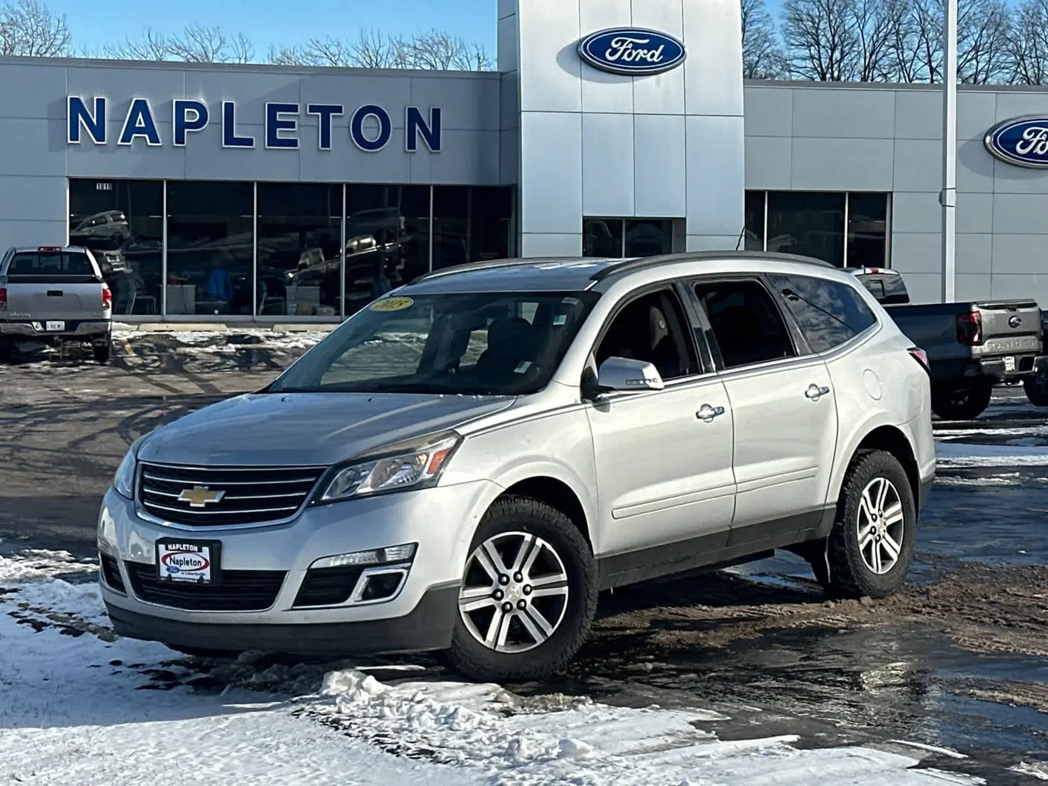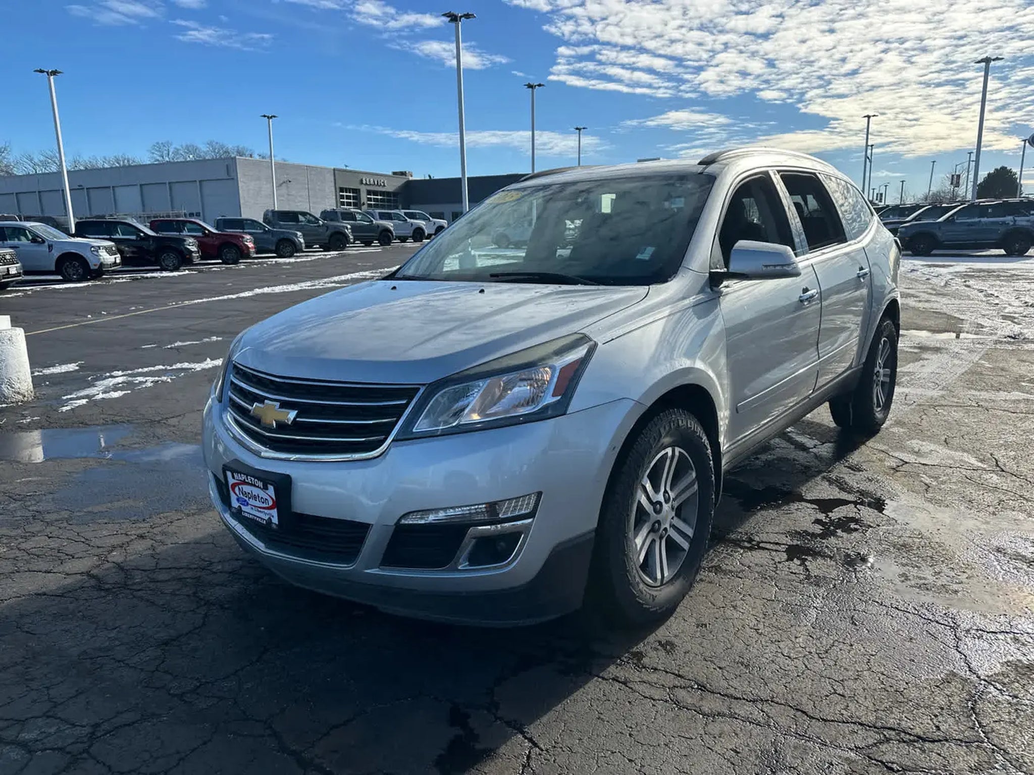Serviced here, Non-Smoker vehicle, Locally Owned, 3-month / 3,000 mile powertrain warranty, Excellent Condition, Fully Inspected by our Napleton Technicians, Silver Ice Metallic exterior and Ebony interior. Very Nice. EPA 24 MPG Hwy/17 MPG City! Third Row Seat, Onboard Communications System, iPod/MP3 Input, Back-Up Camera, Rear Air, Quad Bucket Seats, SEATING, 7-PASSENGER (2-2-3 SEATING CONFIGURATION), AUDIO SYSTEM, COLOR TOUCH AM/FM/SIRIU. TRANSMISSION, 6-SPEED AUTOMATIC, ENGINE, 3.6L SIDI V6, SEATING, 7-PASSENGER (2-2-3 SEATING C. Aluminum Wheels. WHY BUY FROM US At Napleton Ford in Libertyville,our business philosophy is a simple one: It centers around your expectations of how a customer should be treated when purchasing or servicing your vehicle. From our brand-new facility to our wide range of stunning Ford cars, trucks and SUVs, there are a long list of reasons to love the shopping experience here at Napleton Ford. Whether youre here to buy your first vehicle or get service on the car youve owned for years, were excited youve chosen our dealership! OPTION PACKAGES 7-PASSENGER (2-2-3 SEATING CONFIGURATION) with 2nd row flat-folding Captains Chair and third row 60/40 split flat folding bench seat, 3.6L SIDI V6 (281 hp [210 kW] @ 6300 rpm, 266 lb-ft of torque @ 3400 rpm [359.1 N-m]) (STD), TRANSMISSION, 6-SPEED AUTOMATIC (STD), COLOR TOUCH AM/FM/SIRIUSXM RADIO WITH CD PLAYER 6.5 diagonal touch-screen display (STD). EXPERTS ARE SAYING Edmunds.coms review says . large crossover SUVs give you the flexibility that few other vehicles provide. And among these modern beasts of burden, the 2015 Chevrolet Traverse stands out as one of the best available, thanks to its expansive interior space, smooth ride and top crash test scores.. Great Value !!! Passed Multi Point Inspection - 4 New Tires and more! Hurry in at this price this one wont last! Stop clicking and come see us today! Fuel economy calculations based on original manufacturer data for trim engine configuration.