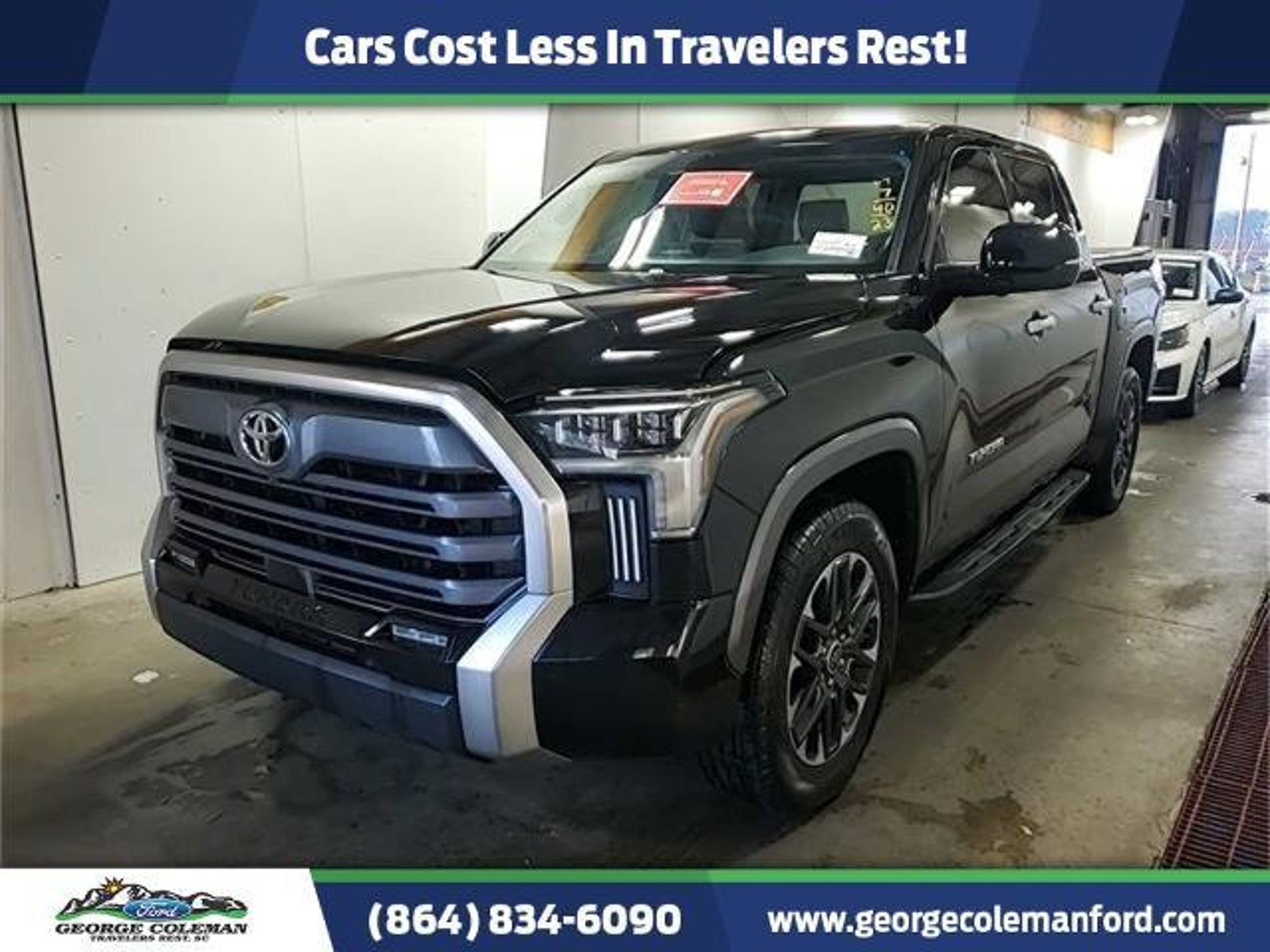 2023 Toyota Tundra Limited Tundra Limited, 4D CrewMax, 3.4L V6, 10-Speed Automatic, RWD, Midnight Black Metallic, 20 x 8 Alloy Wheels, 9 Speakers, Auto High-beam Headlights, Automatic temperature control, Backup Camera, Front dual zone A/C, Front fog lights, Fully automatic headlights, Memory seat, Navigation System, Panic alarm, Power driver seat, Power windows, Rear window defroster, Remote keyless entry, Speed control. CARFAX One-Owner. Limited Certification Program Details: Ford Blue Advantage: Blue Certified * 139 Point Inspection * Transferable Warranty * Vehicle History * Warranty Deductible: $100 * Roadside Assistance * Limited Warranty: 3 Month/4,000 Mile (whichever comes first) after new car warranty expires or from certified purchase date * and 11,000 FordPass Rewards Points to use toward first maintenance visit *Cars Cost Less In Travelers Rest!! **Have A FREE VEHICLE HISTORY REPORT sent directly to your email upon request or view IMMEDIATELY at our home website www.georgecolemanford.com ** Come by soon to drive this vehicle or EMAIL SMOSTELLER@COLEMANFORD.NET for more information!! George Coleman Ford has been operating continuously in our present location since 1930!