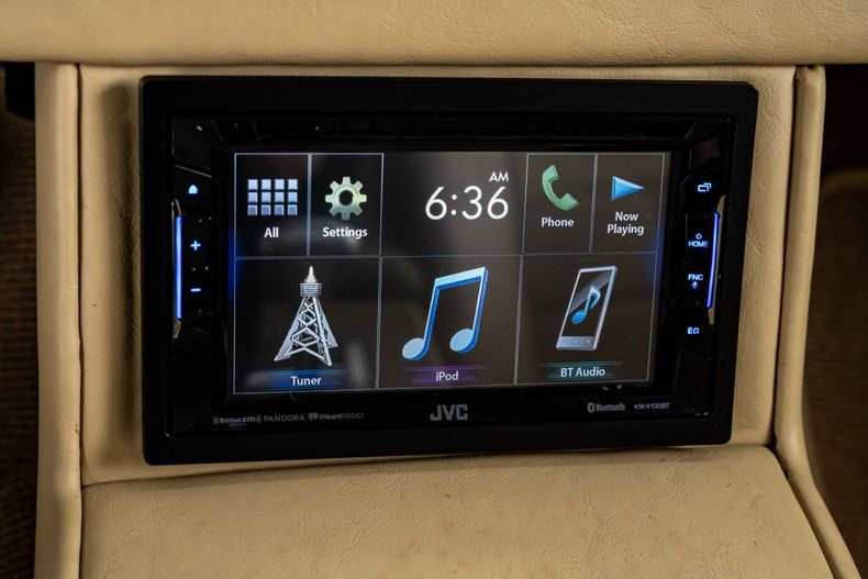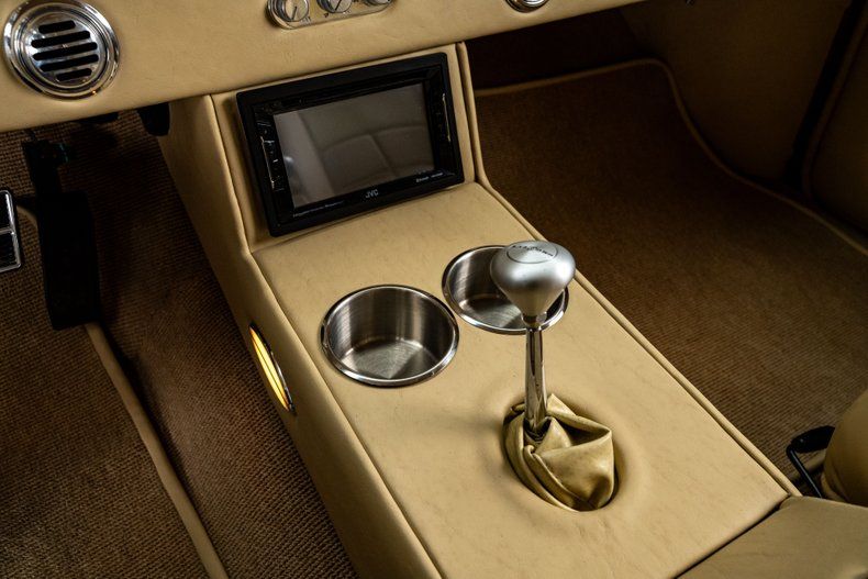 Open the door and you step into something much more upscale than anything Chevrolet could have imagined in 1955. Custom tan leather, plush buckets, and a full-length console set the tone, with the console housing the power window switches, integrated cupholders, and a useful storage compartment. Dakota Digital VHX gauges anchor the dash, and modern air conditioning keeps the cabin comfortable without disturbing the custom look. A modern JVC touchscreen handles audio and Bluetooth, offers full streaming capabilities, and is SiriusXM ready for longer drives. A Flaming River Waterfall wheel sits on a polished tilt column, paired with a Lokar shifter that fits the car's modern-driver feel. The trunk didn't get skipped either, finished cleanly so the whole interior feels cohesive front to back.