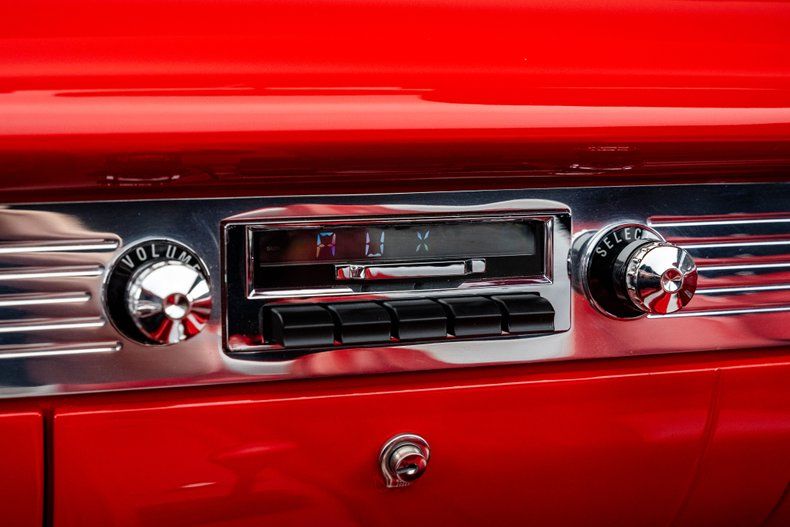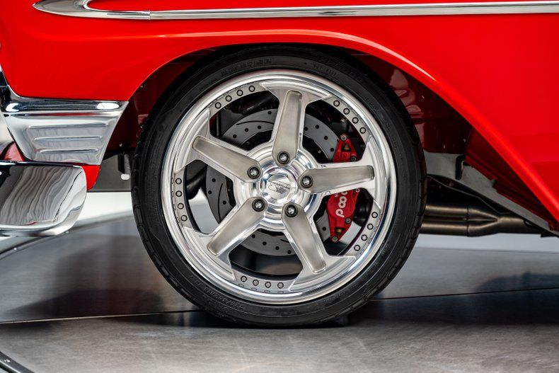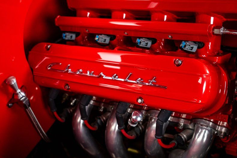 The body was stripped, massaged, and blocked to perfection before being refinished in Viper Red clearcoat. Every panel shows crisp reflections, and the smoothed cowl, firewall, and one-piece bumpers give the profile a cleaner, more deliberate flow. Polished Bel Air trim and a chrome grille maintain the car's factory character, while dual mirrors and 18-inch front, 20-inch rear Billet Specialties five-spoke wheels give it a confident stance. Every detail speaks to the precision and consistency carried throughout the build.