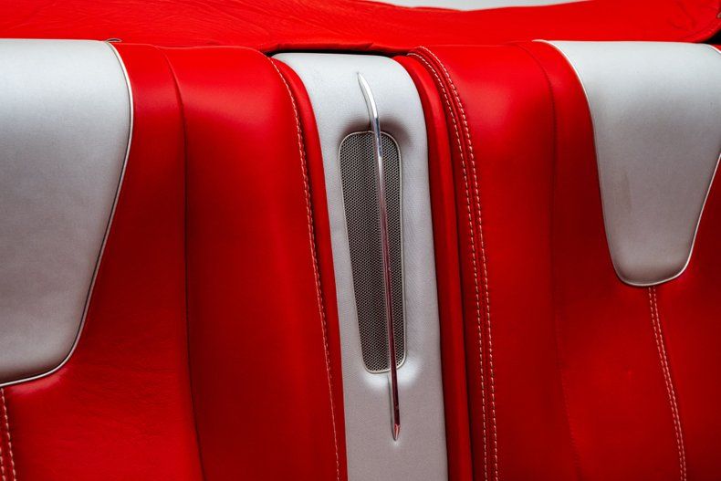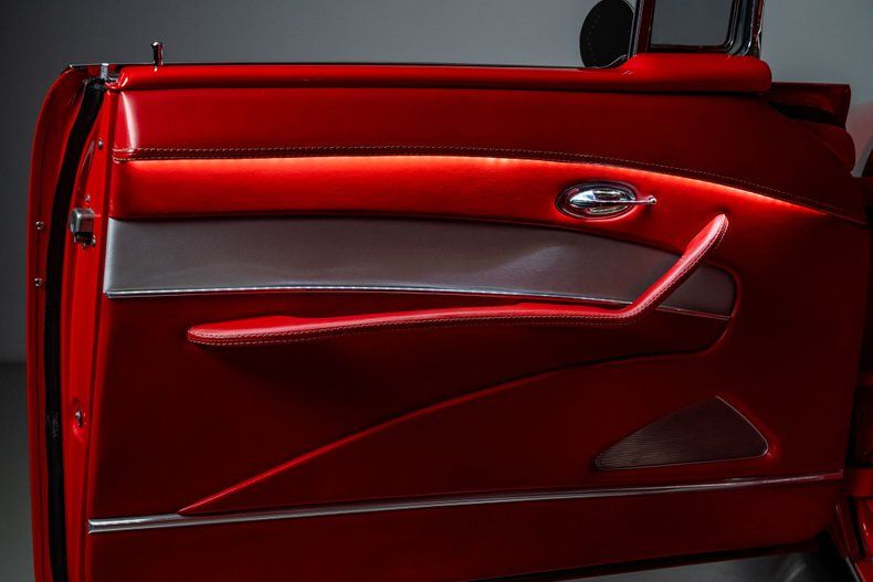 Inside, Steve Holcomb's Pro Auto Custom Interior gives the car its finishing touch. The custom leather cabin pairs bright red hides with silver inserts and contrast dual-stitching, carrying a clean two-tone theme. Bucket seats with power adjustment flank a custom full-length console fitted with power window switches, cup holders, and billet accents. A matching red dash houses Classic Instruments gauges, billet trim, controls for modern air conditioning, and a Custom Autosound radio, while a billet and leather-wrapped steering wheel sits on a polished tilt column. LED lighting, billet handles, and Daytona-weave carpet complete the environment, giving the interior a tailored look that matches the craftsmanship seen throughout the rest of the build.