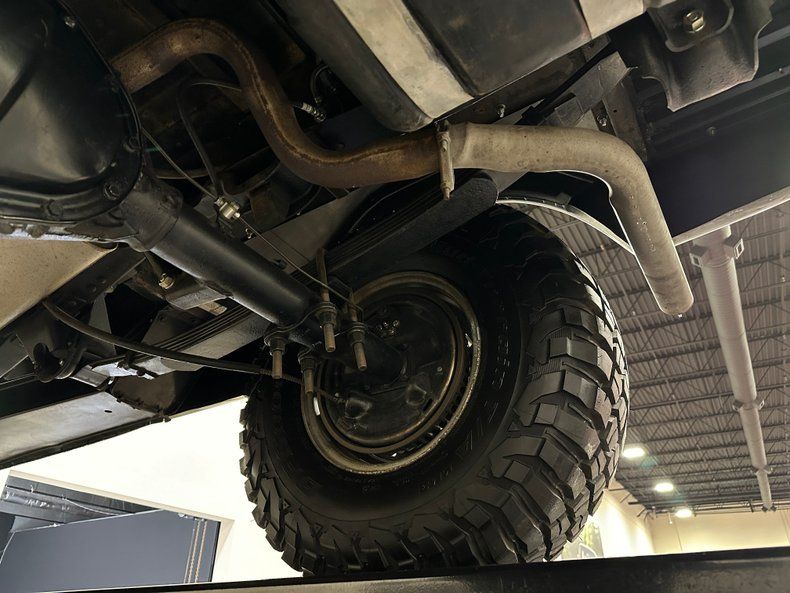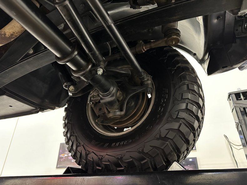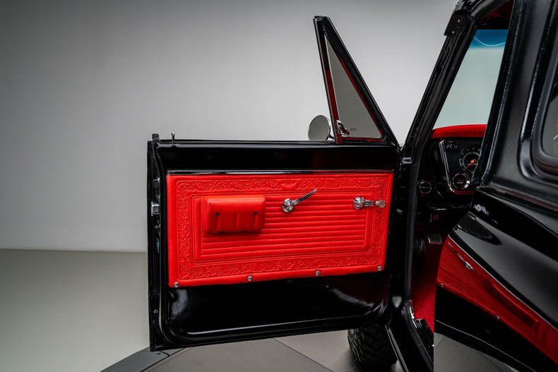 The body presents with clean, straight sheet metal and consistent panel alignment throughout. The black finish lays down with deep gloss across the hood, doors, and quarters, giving the truck a crisp, finished look under studio lighting. Bright trim and glass show well and give the exterior a clean perimeter. Sitting tall on 15" rally wheels wheels wrapped in 33x10.50 BFGoodrich Mud-Terrain tires, The stance is tall, purposeful, and proportioned the way these trucks should be. The black and red combination works perfectly here. It is a timeless color pairing that never goes out of style, whether it is on a muscle car, a hot rod, or a classic 4x4 like this.
